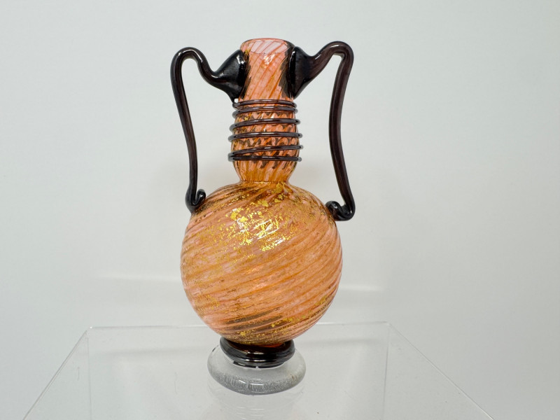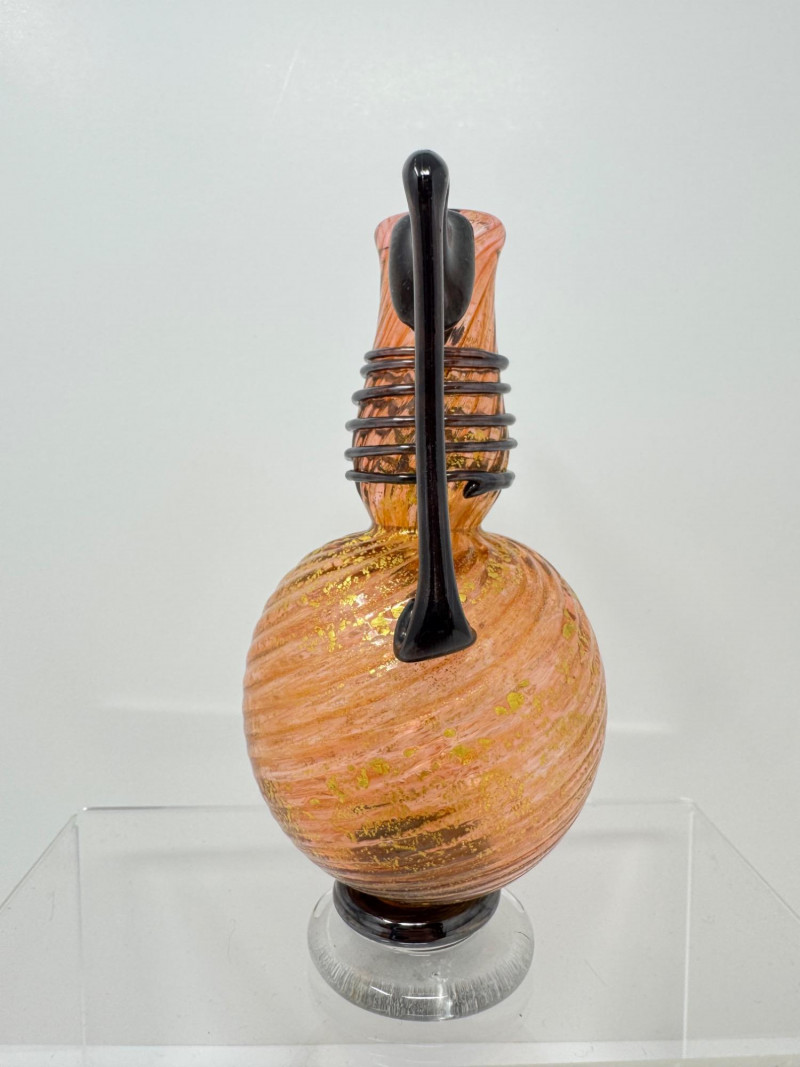 Lot # 116 - Swirled Orange & Gold Art Glass Vase w/ Dual Black Handles
