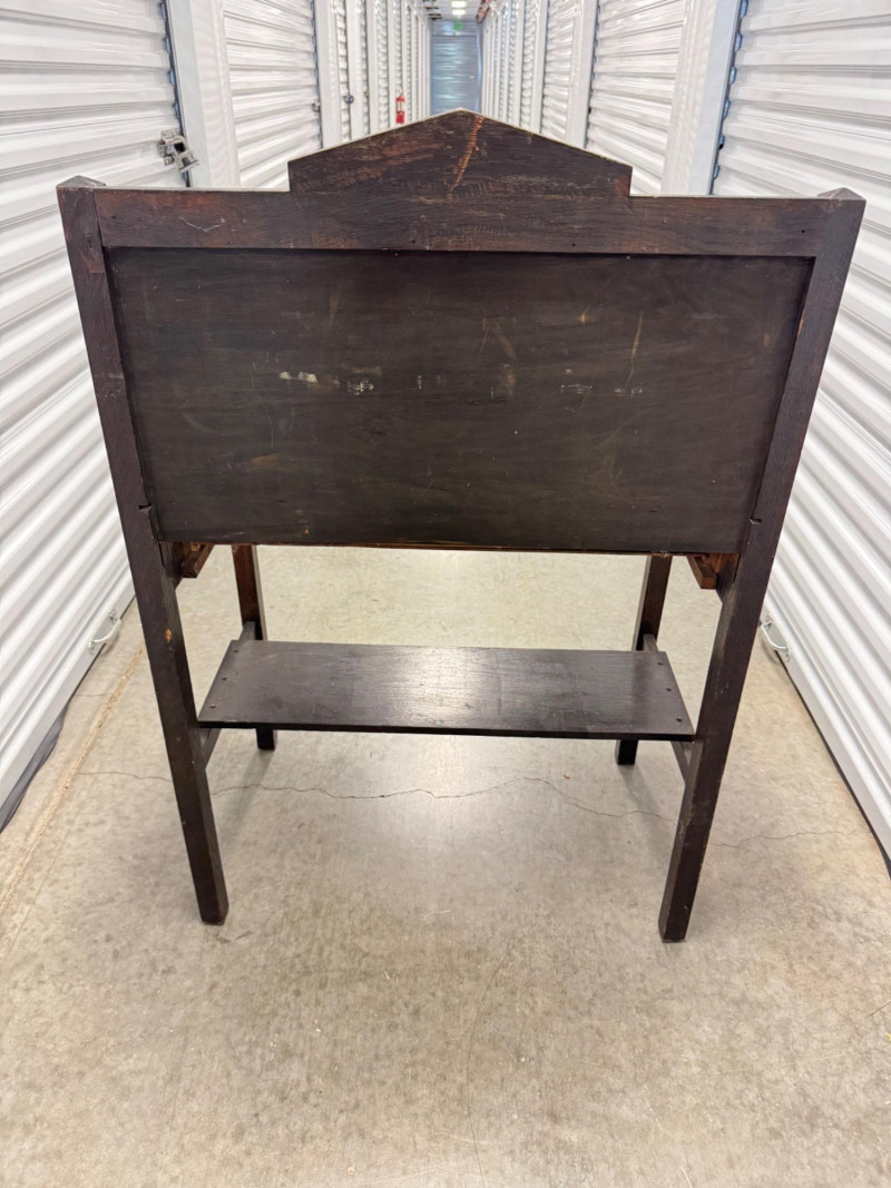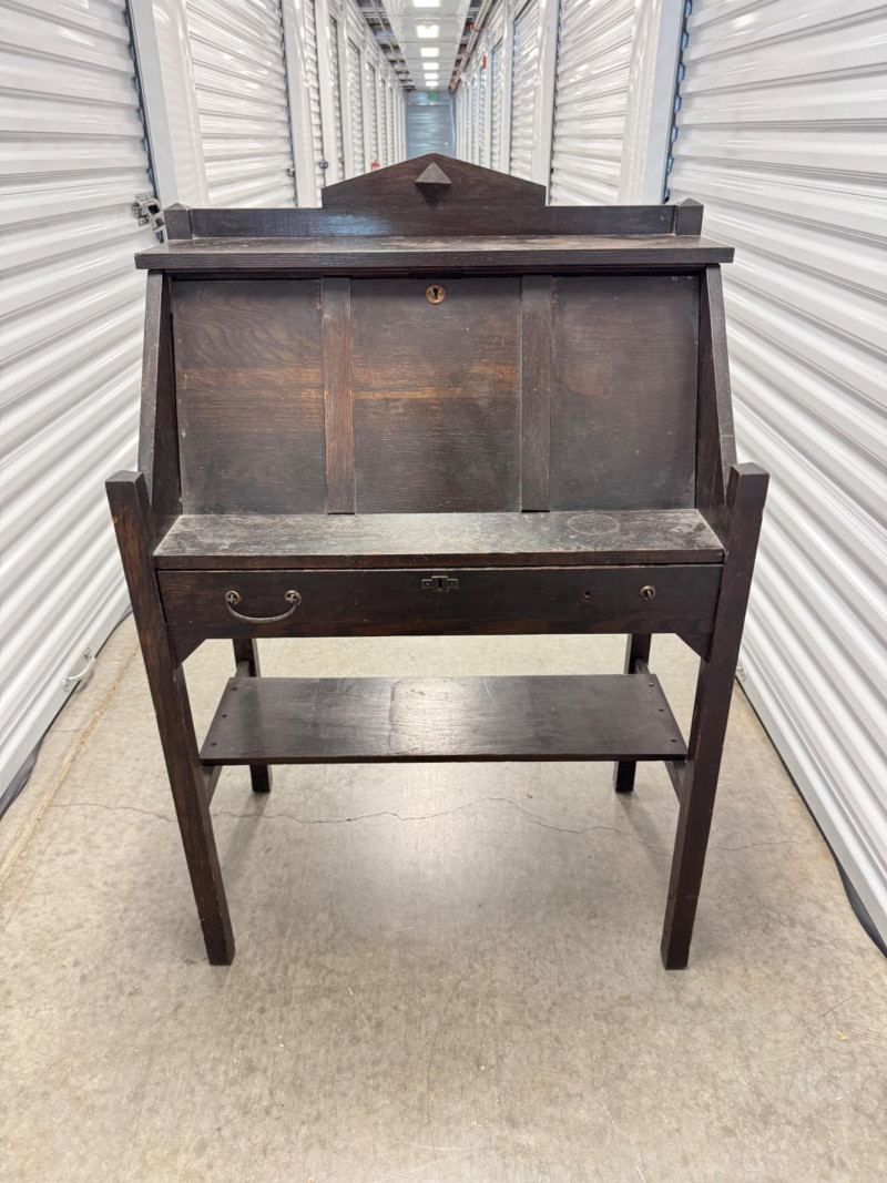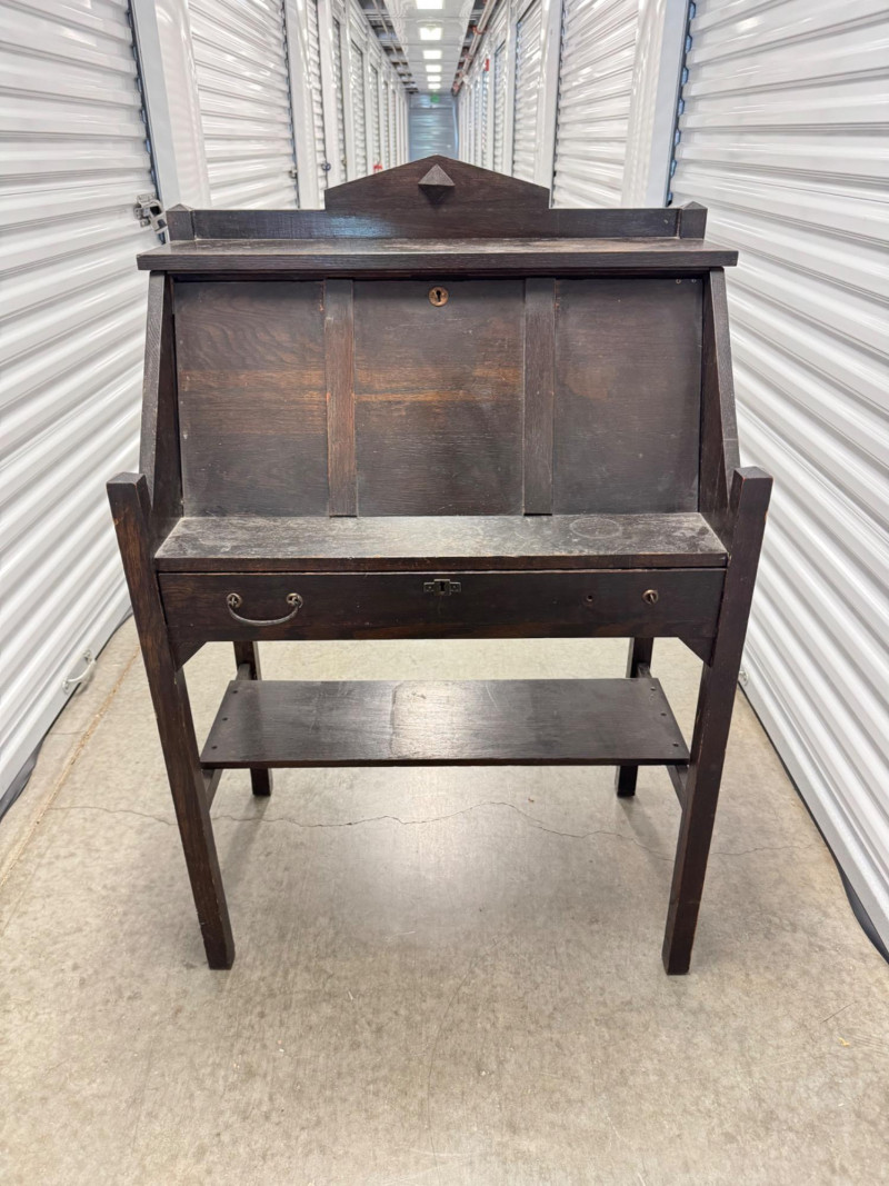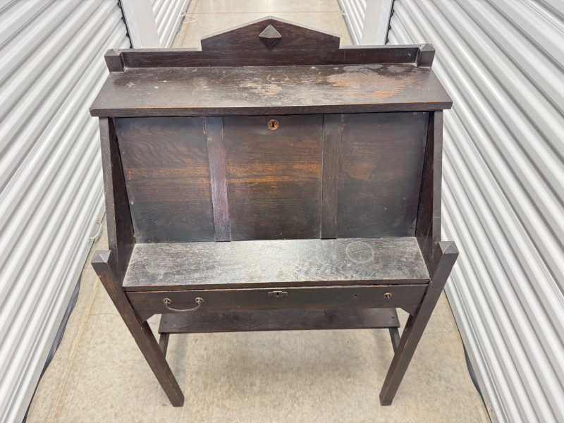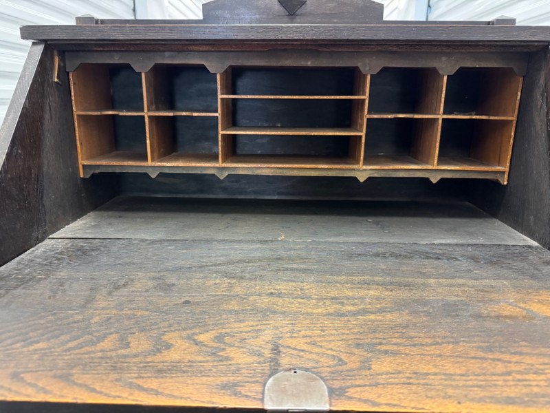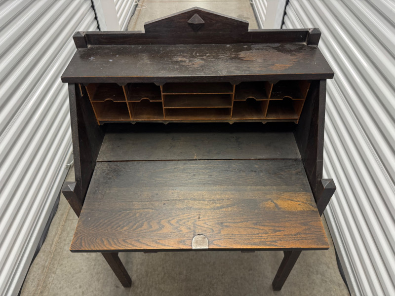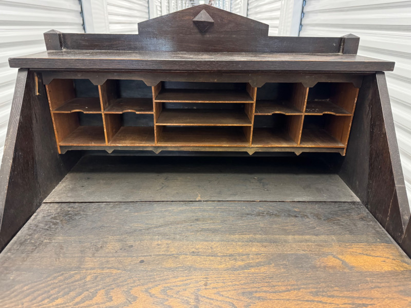 Antique Wooden Drop Front Secretary Desk. Bidding on this lot is an agreement that: (1.) You will have at least 2 capable, able bodied persons to lift and load at a minimum. (2.) You will bring a hand truck and/or any other tools needed to remove this item. If these steps are not followed your item will be forfeit and no refund given.