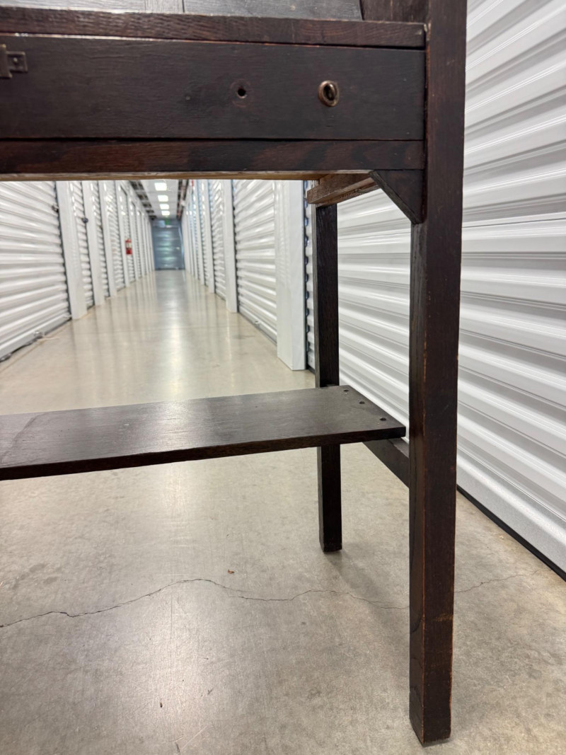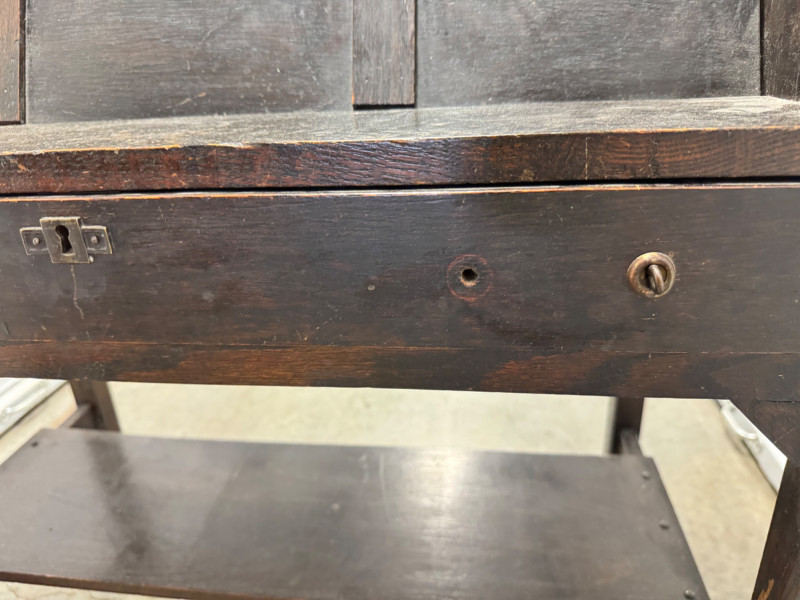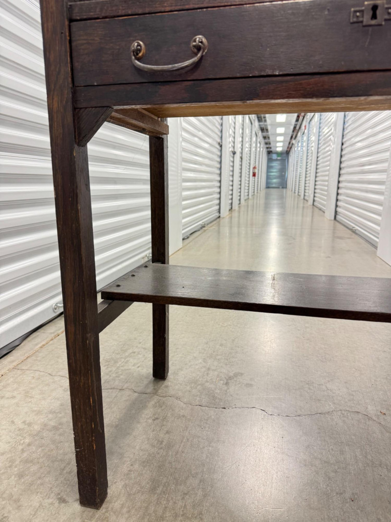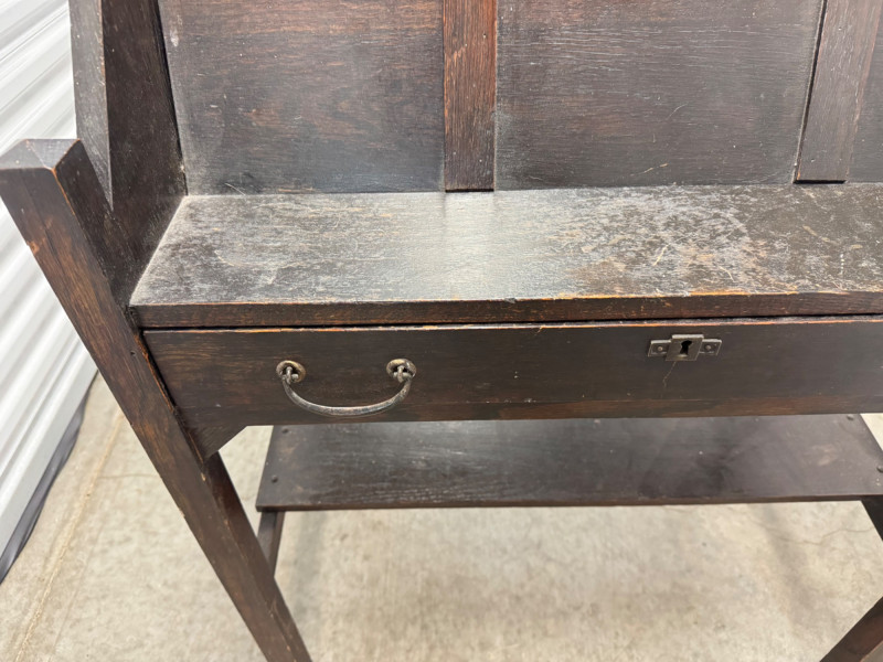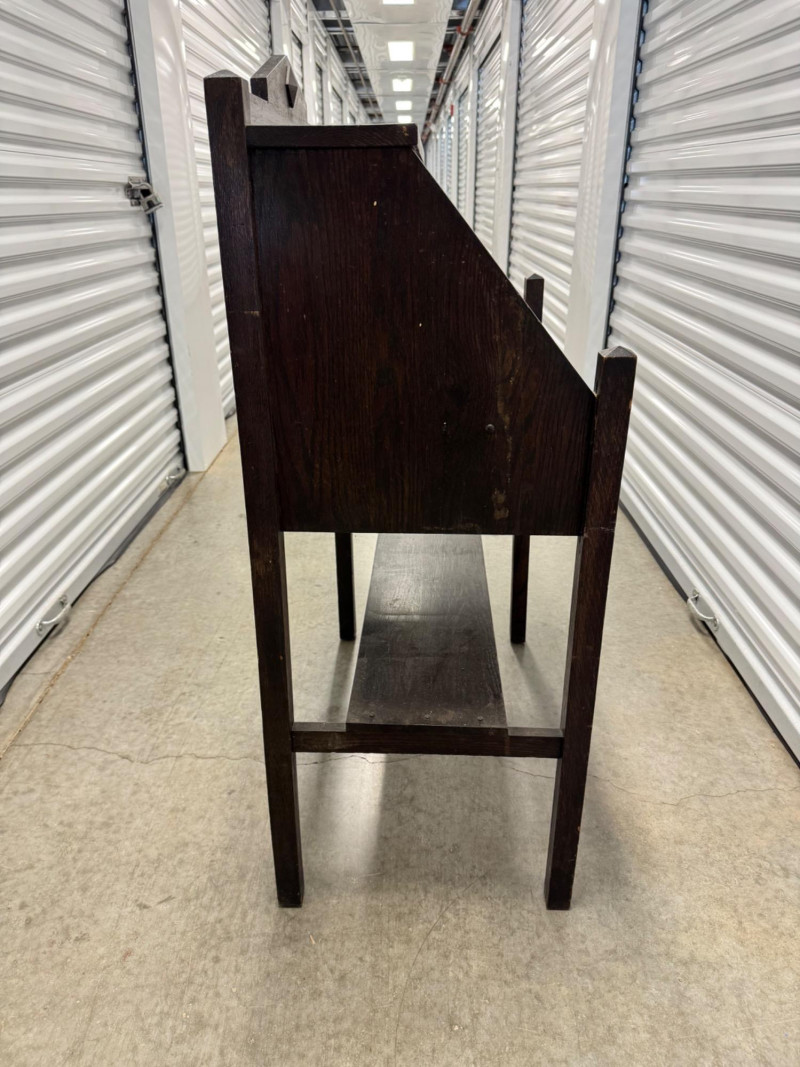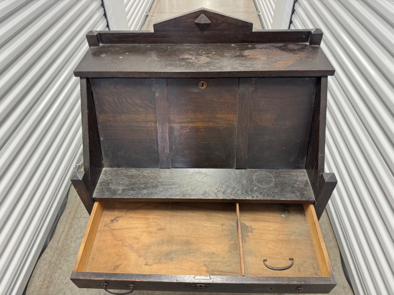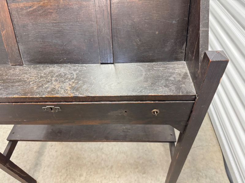 Antique Wooden Drop Front Secretary Desk. Bidding on this lot is an agreement that: (1.) You will have at least 2 capable, able bodied persons to lift and load at a minimum. (2.) You will bring a hand truck and/or any other tools needed to remove this item. If these steps are not followed your item will be forfeit and no refund given.