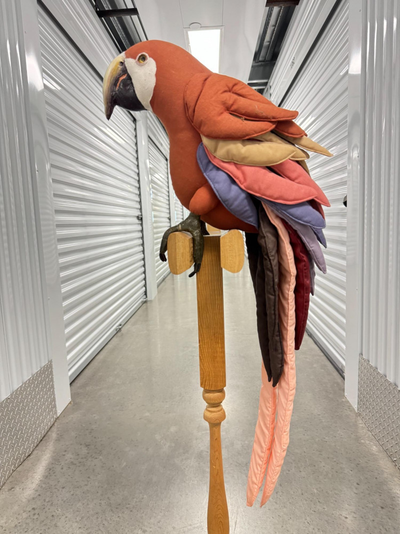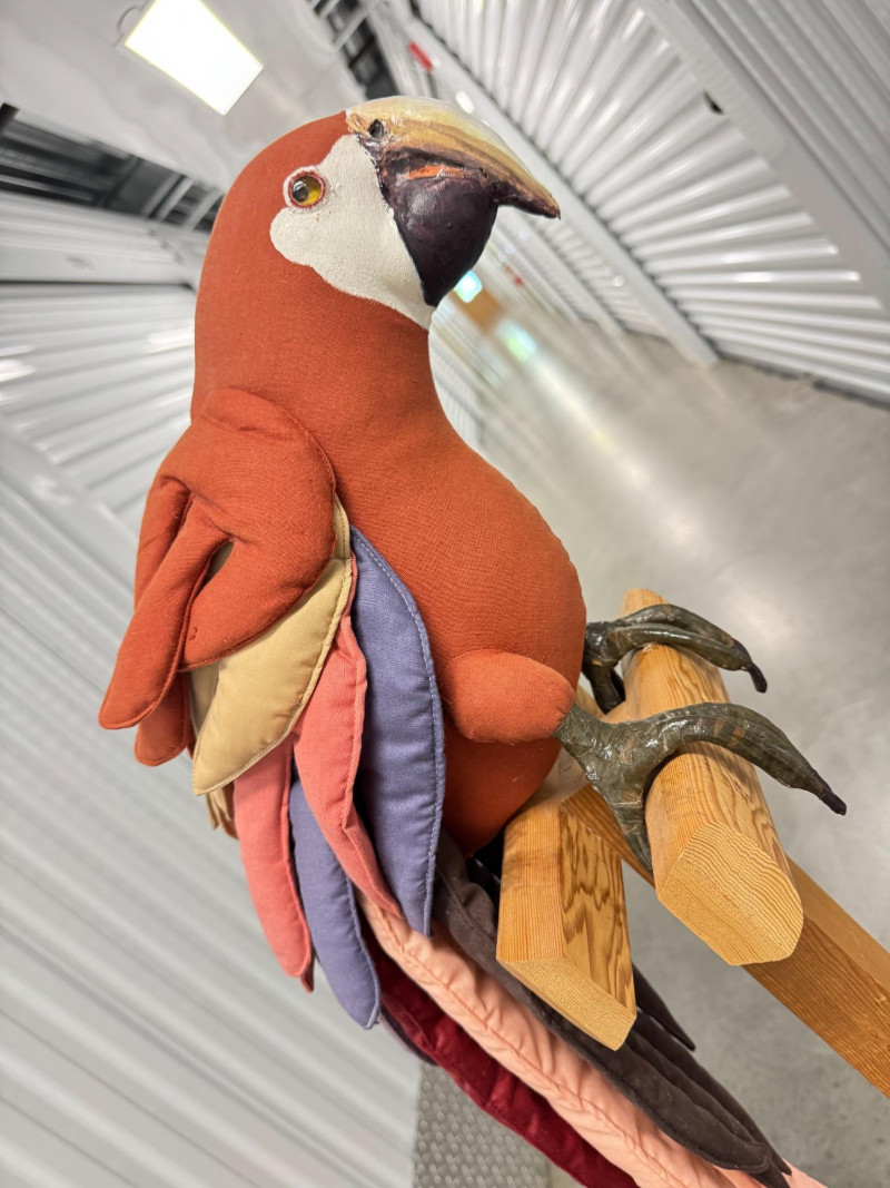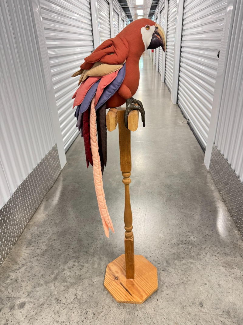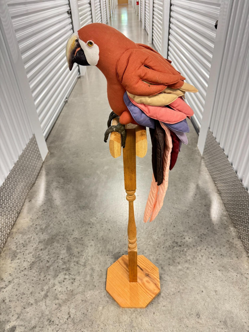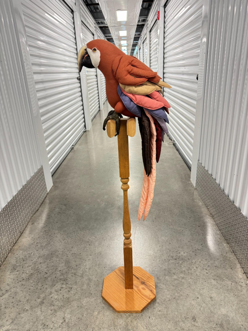 Fabric Parrot Art Sculpture on Wooden Stand – 48” Tall. This parrot artwork was created by a local Pacific Northwest artist and purchased at a local art fair.