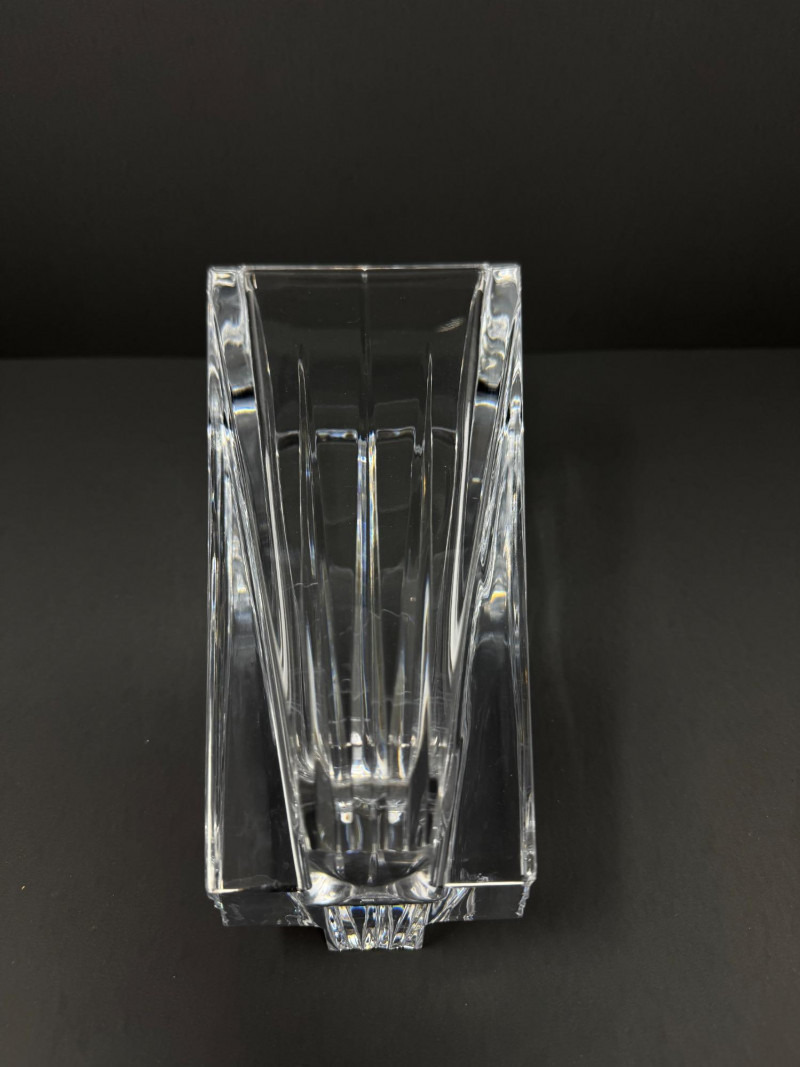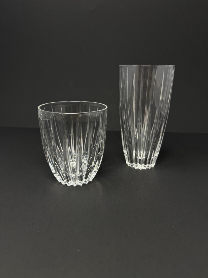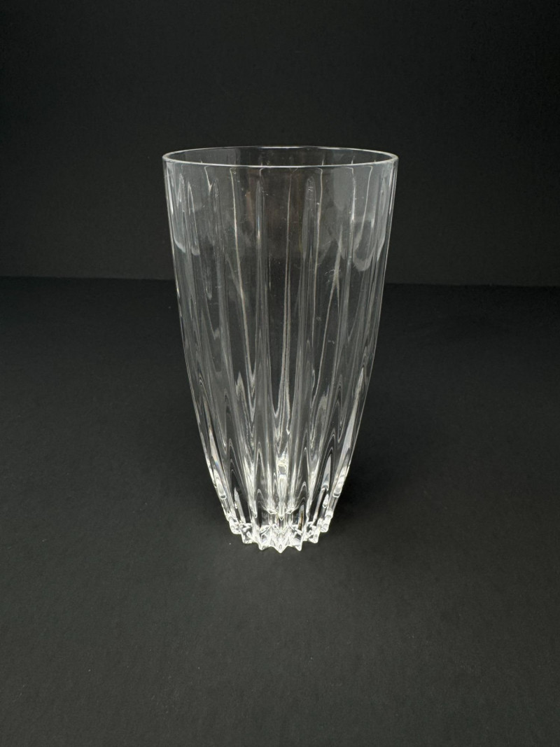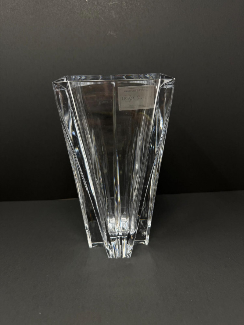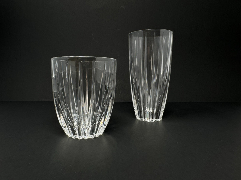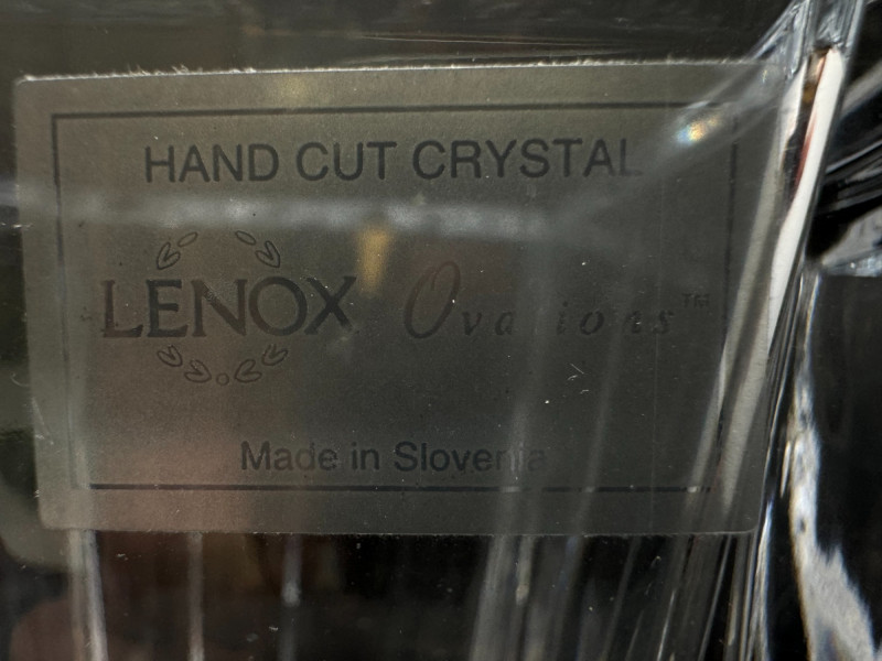 Lenox Ovations Crystal Vase & 2 Mikasa Park Lane Style Glasses. Lenox Ovations hand cut crystal vase, made in Slovenia. Approx 4 1/4" x 8" Chip noted on rim (see photos) 2 Mikasa Park Lane Style crystal glasses One approx 3 1/3" x 3 3/4" One approx 2 3/4" x 5 1/2"
