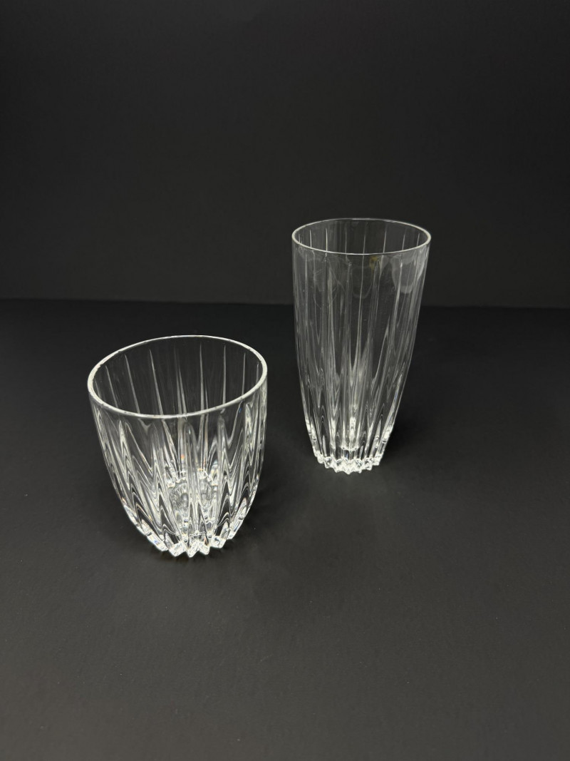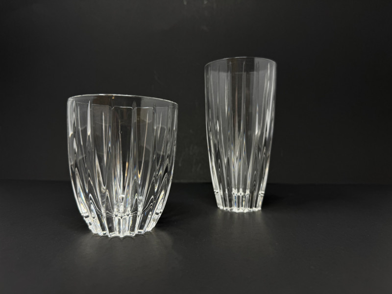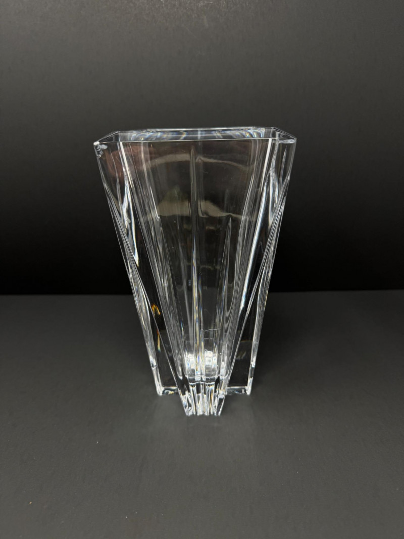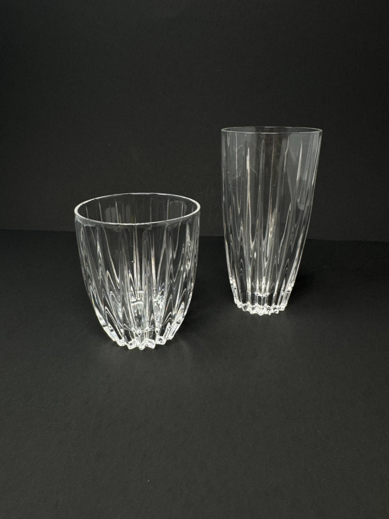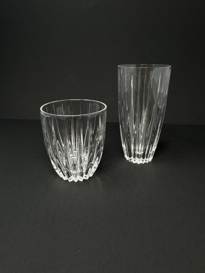 Lenox Ovations Crystal Vase & 2 Mikasa Park Lane Style Glasses. Lenox Ovations hand cut crystal vase, made in Slovenia. Approx 4 1/4" x 8" Chip noted on rim (see photos) 2 Mikasa Park Lane Style crystal glasses One approx 3 1/3" x 3 3/4" One approx 2 3/4" x 5 1/2"