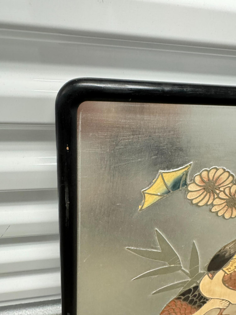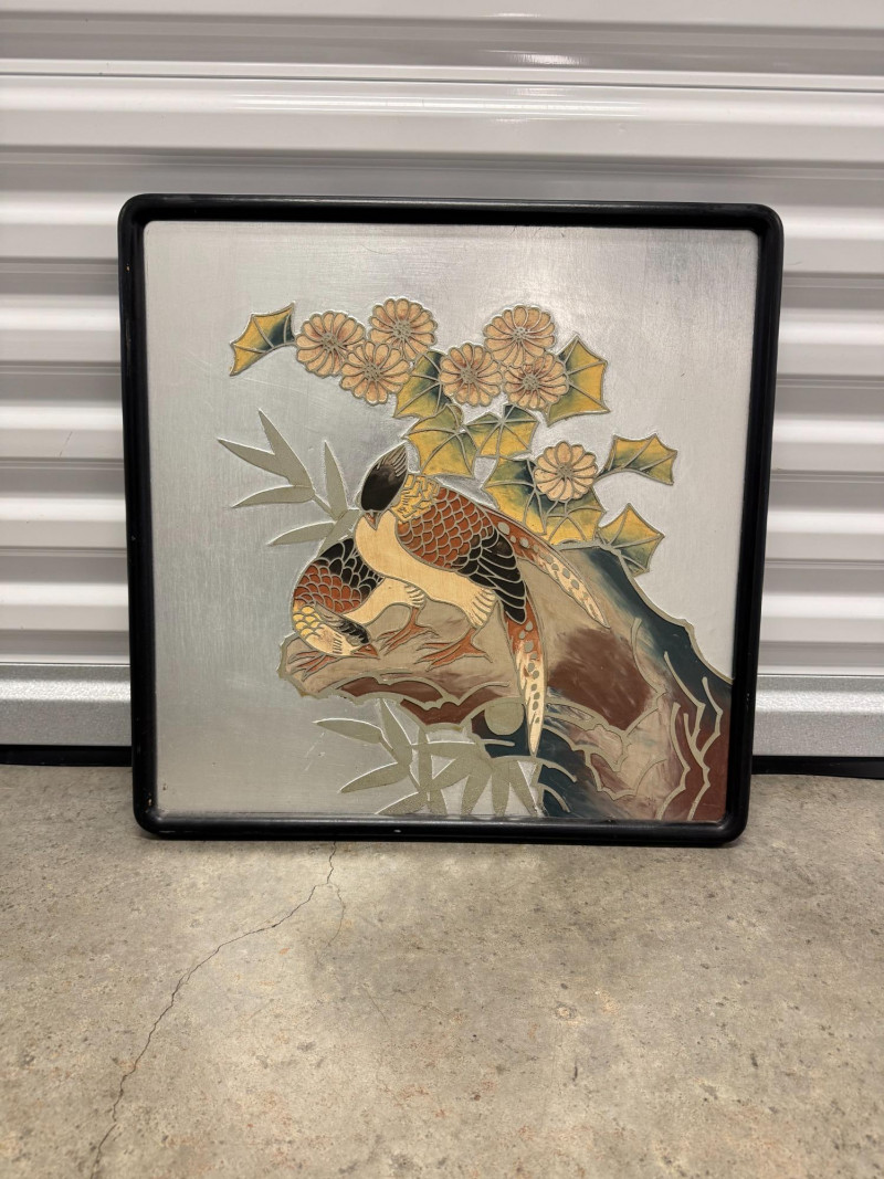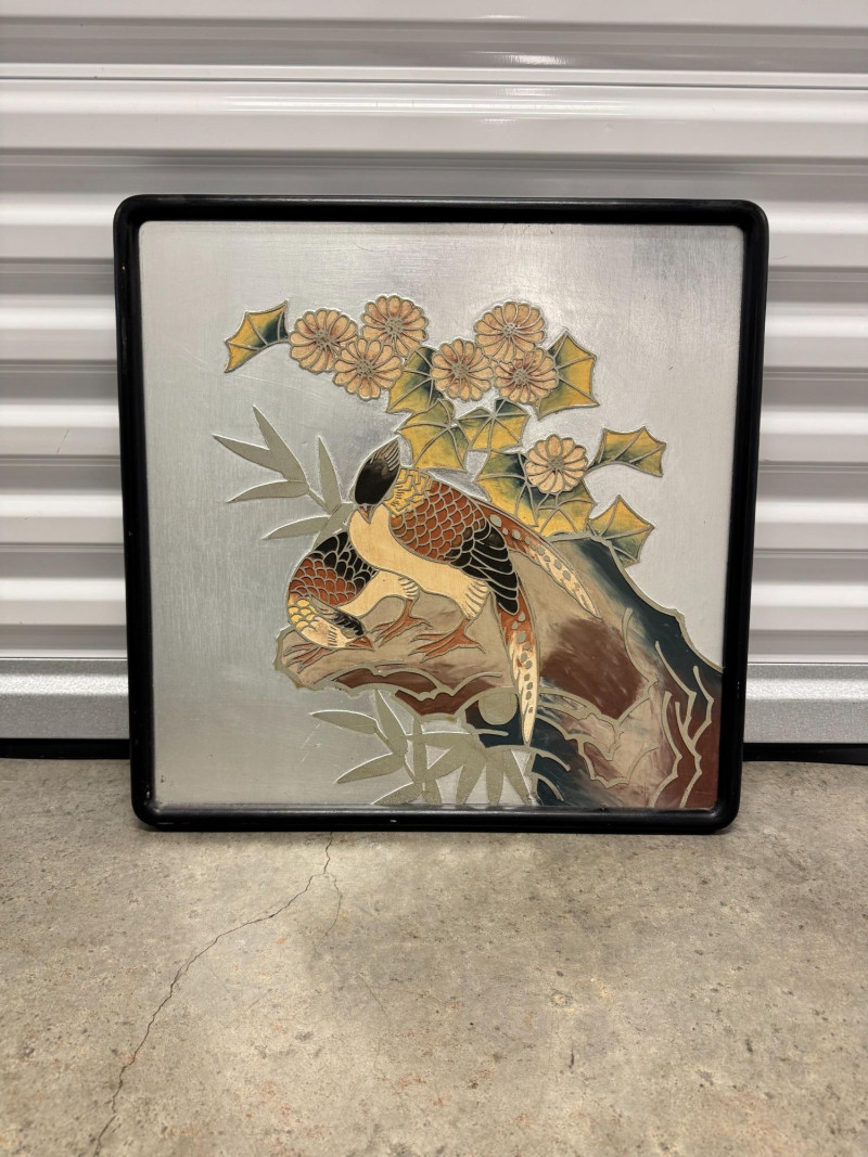 Framed Chokin-Style Japanese Bird & Floral Artwork on Silvered Panel.