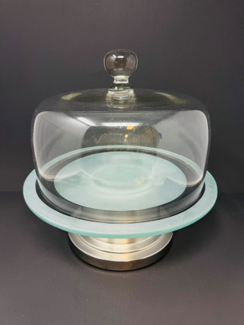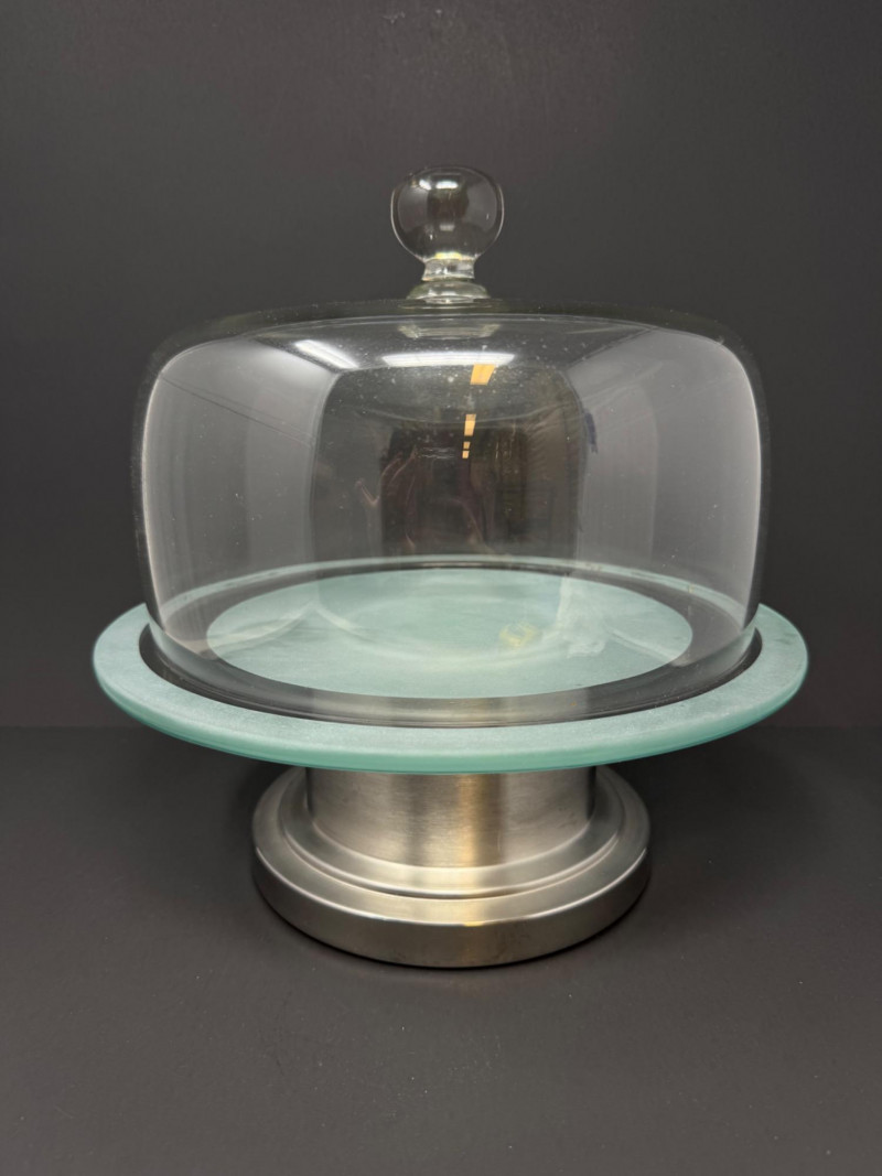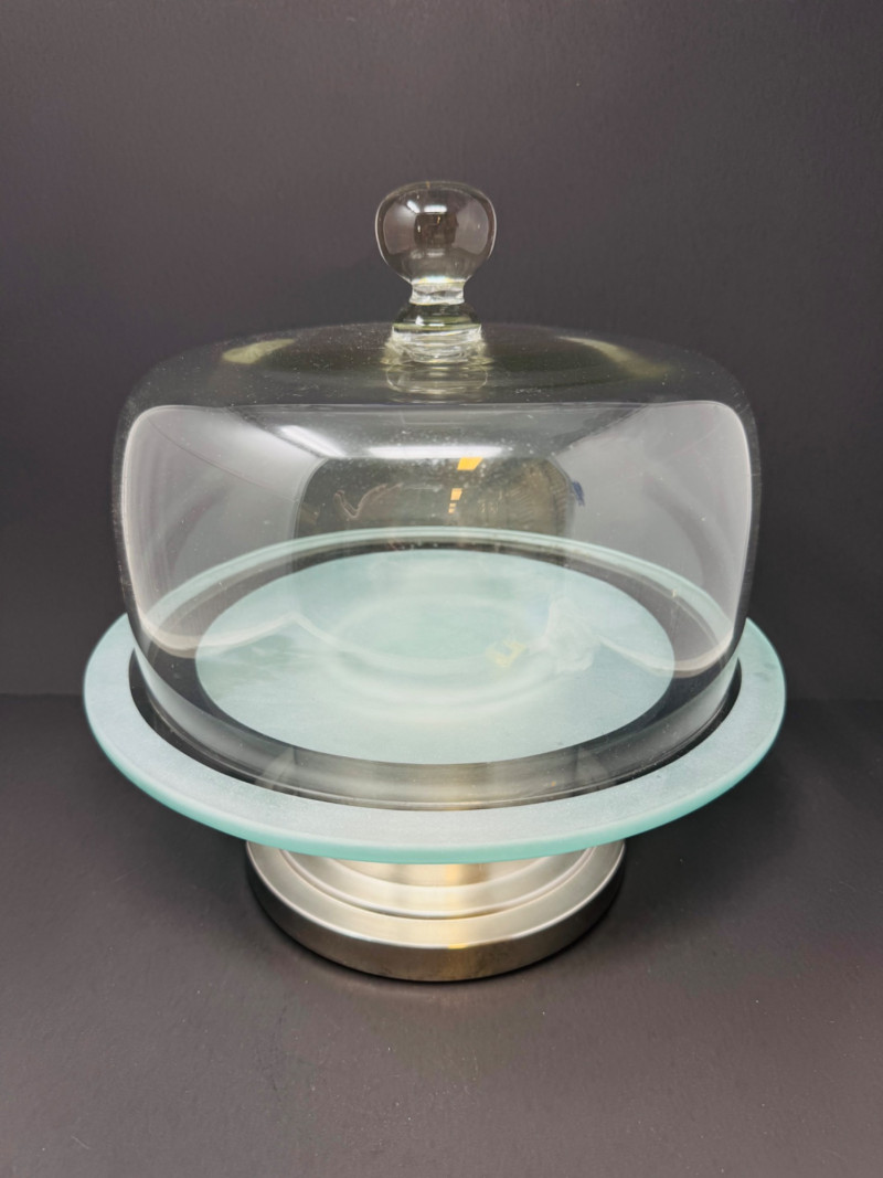 Metal Cake Stand w/ Transparent Glass Dome Cover. Dimensions: 12" tall x 11" wide