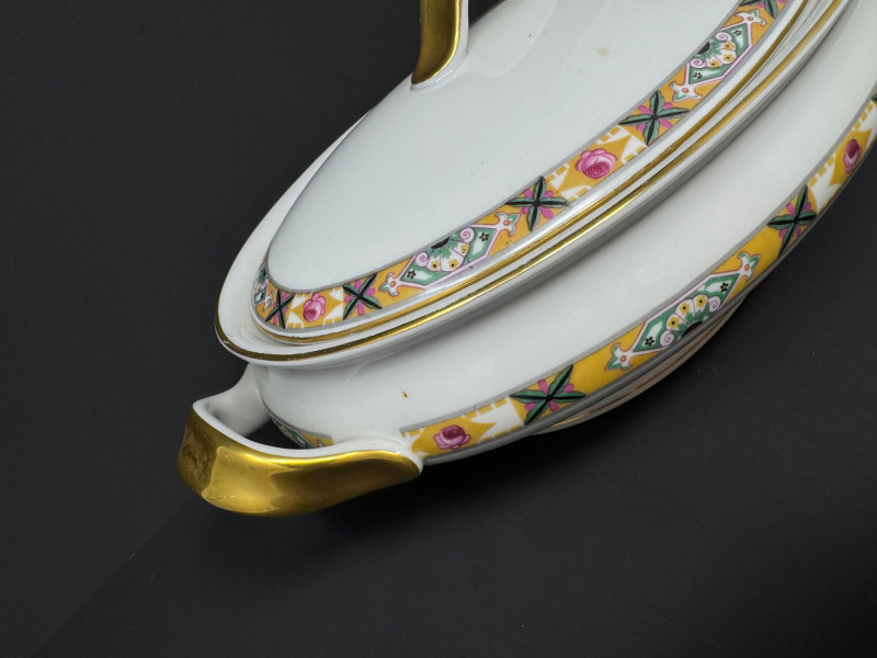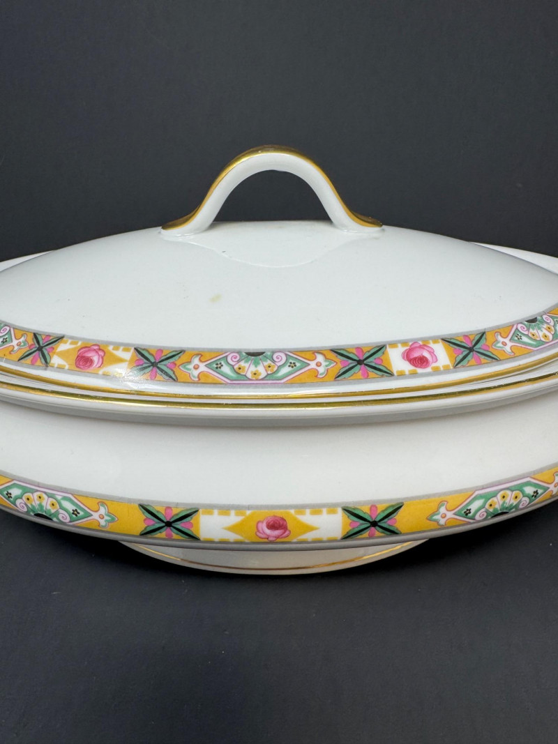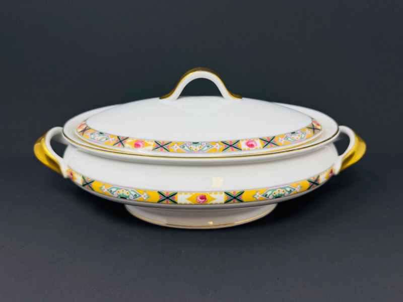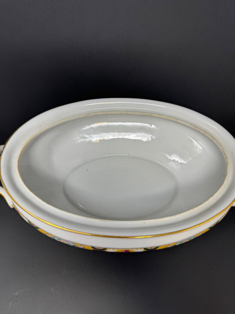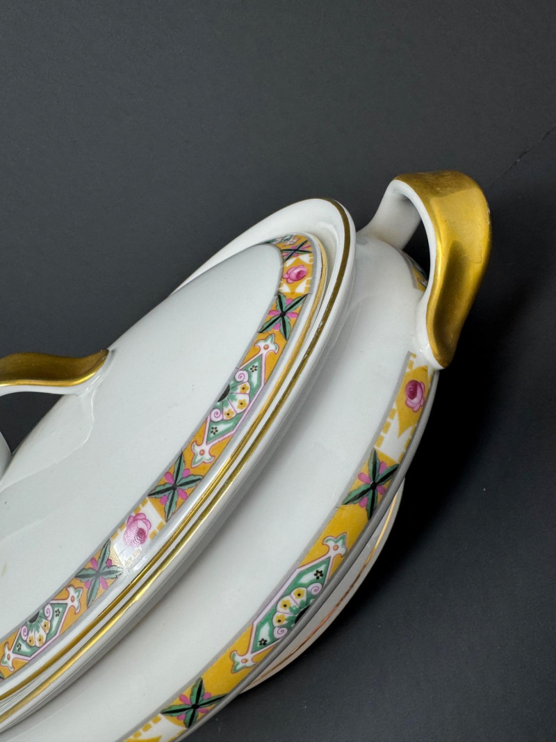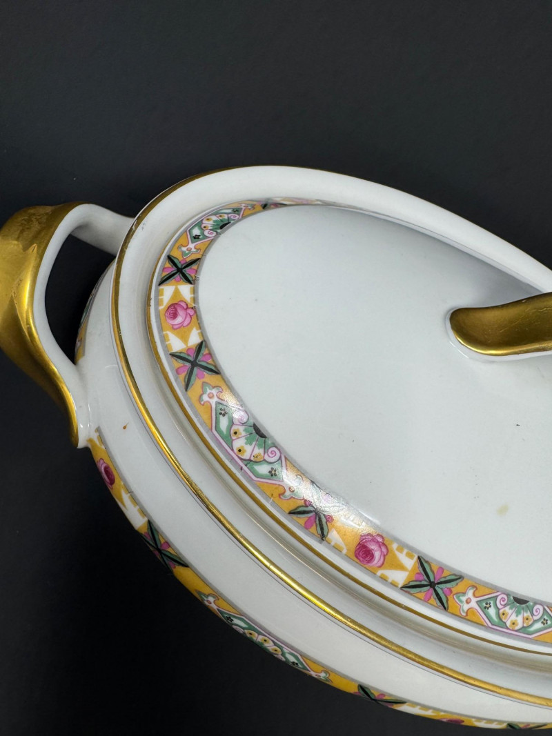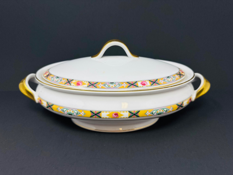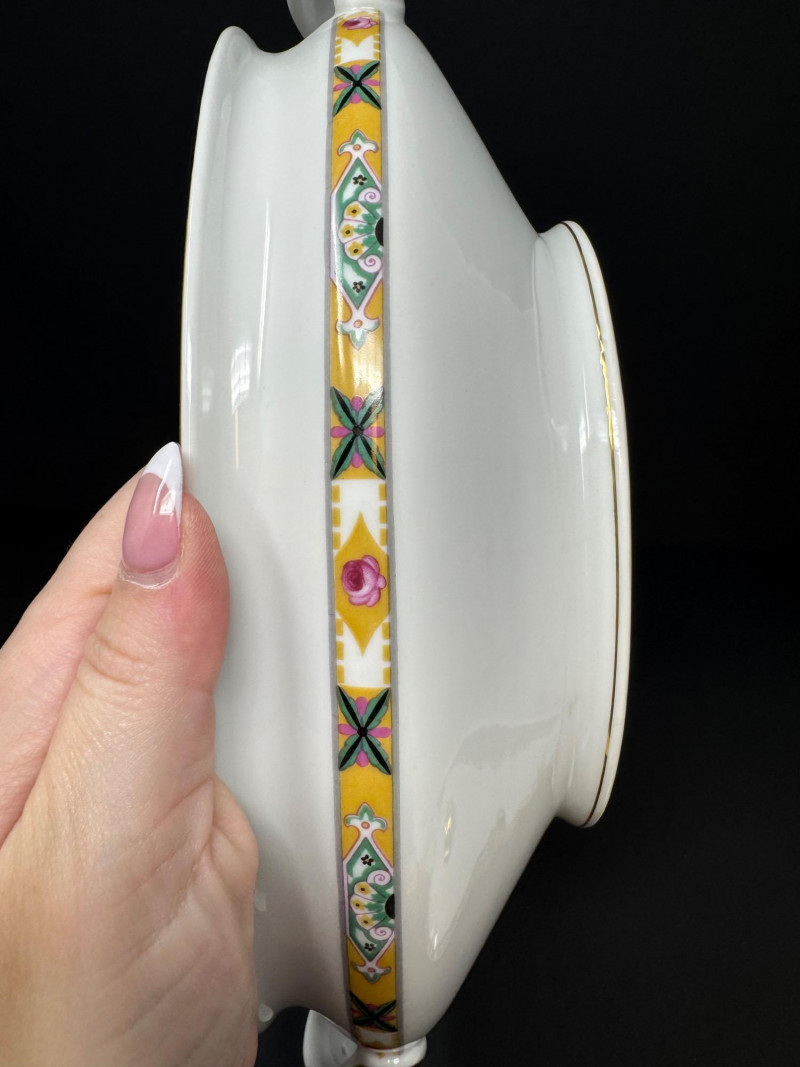 Royal Bayreuth Bavaria Lidded China Dish w/ Yellow Floral Band. Measures approx. 12” long handle to handle