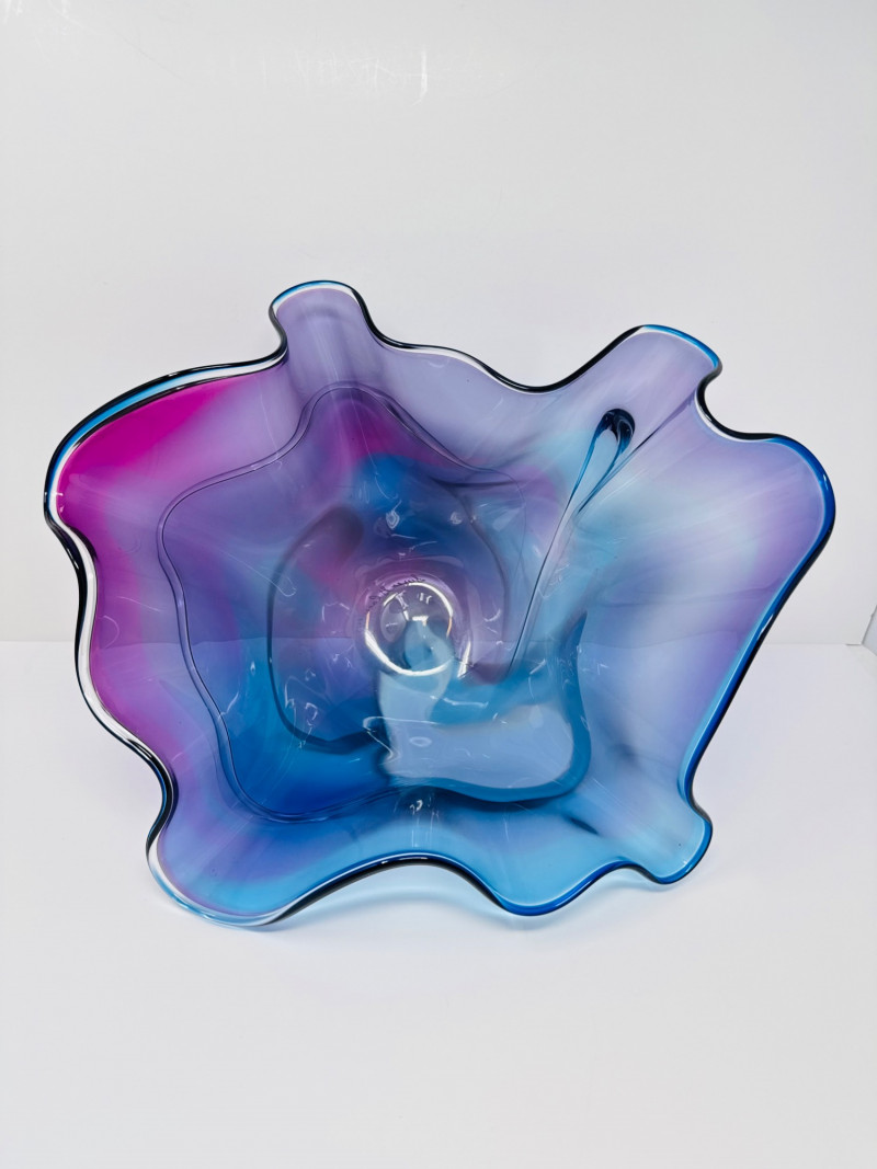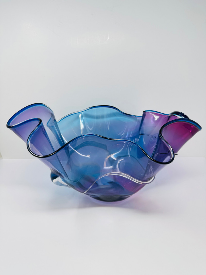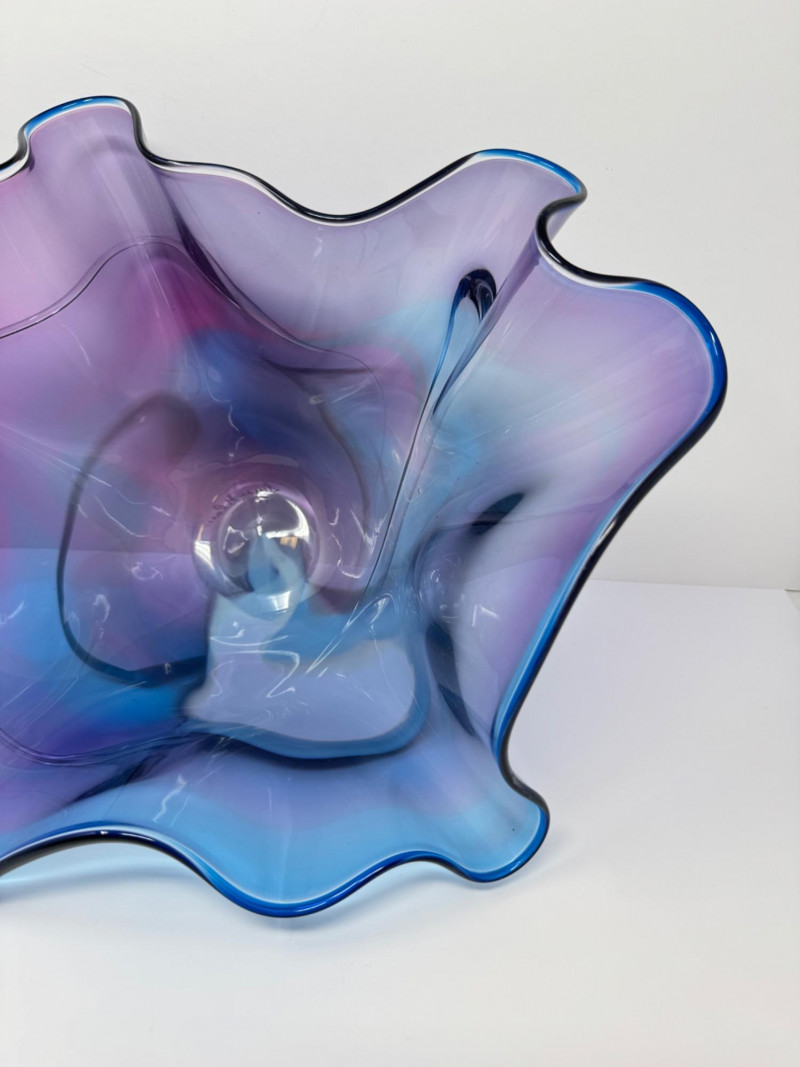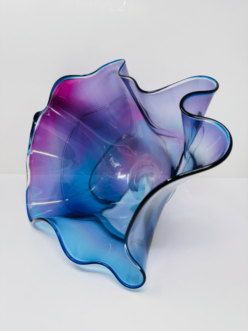 Susan Anne Signed Free Form Art Glass Vase – Purple/Blue Ruffled. Measures approx. 8" tall x 15" across