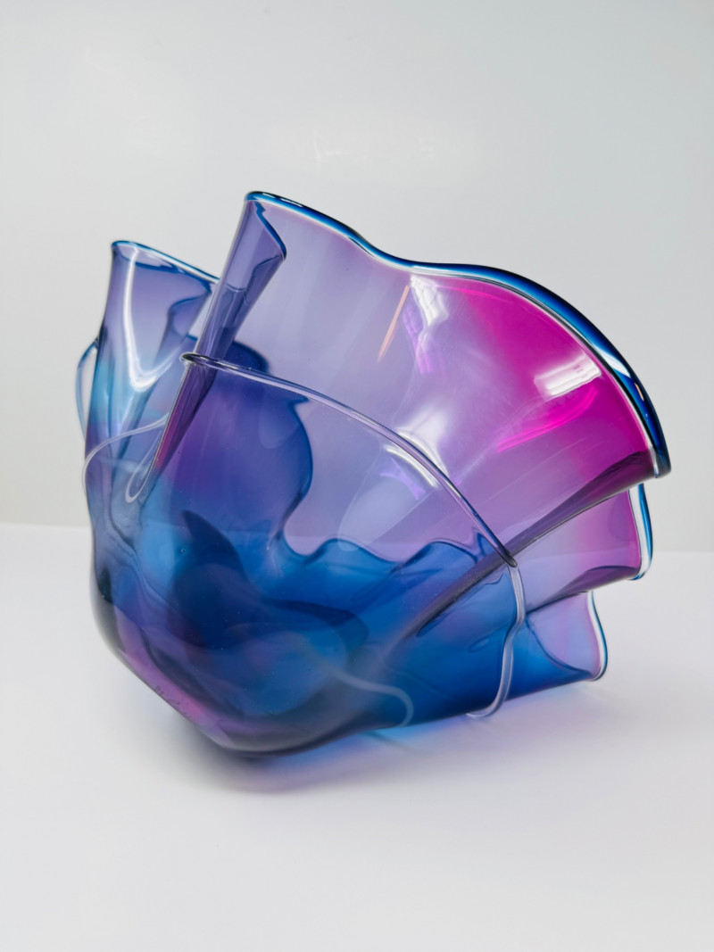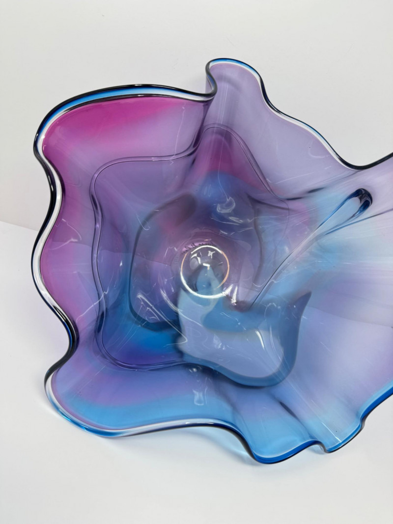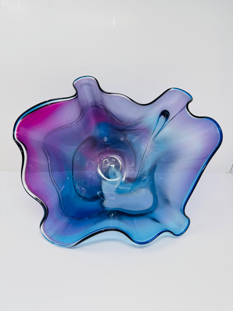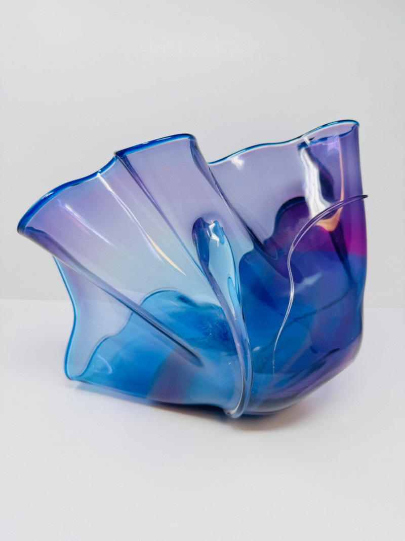 Susan Anne Signed Free Form Art Glass Vase – Purple/Blue Ruffled. Measures approx. 8" tall x 15" across
