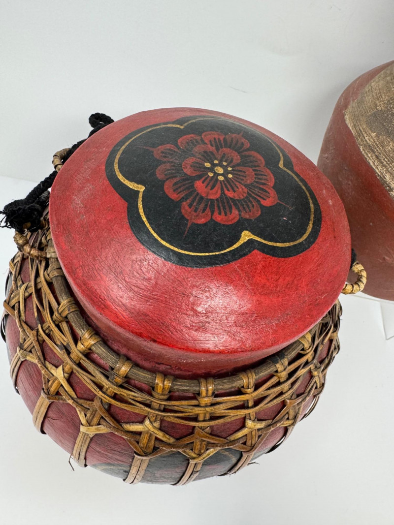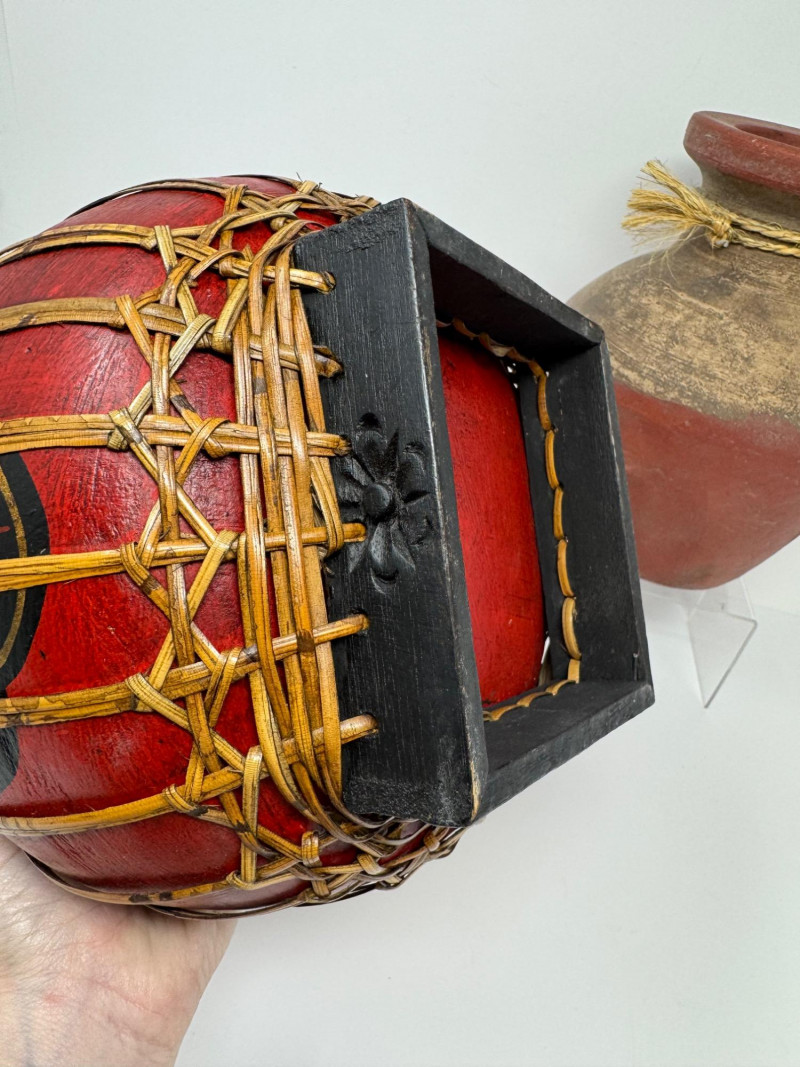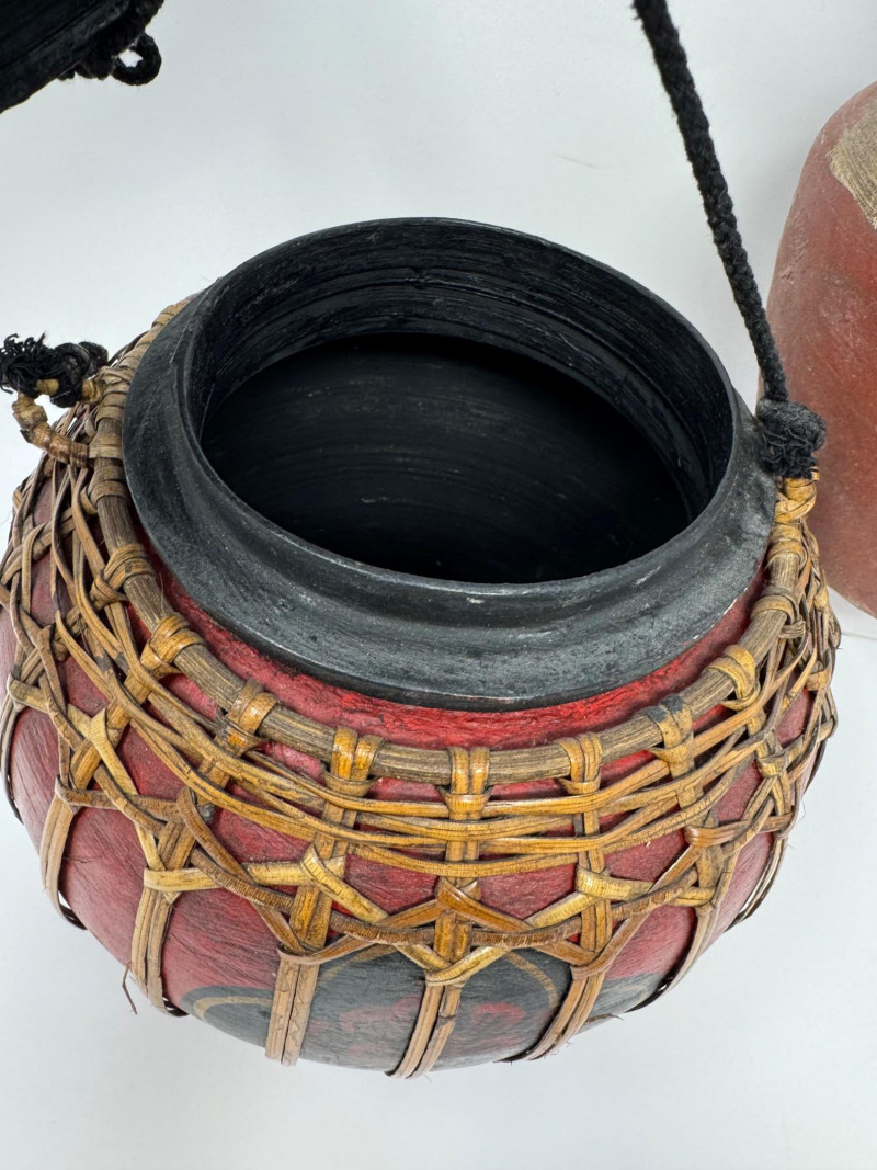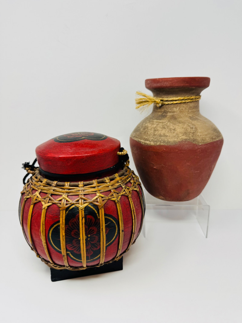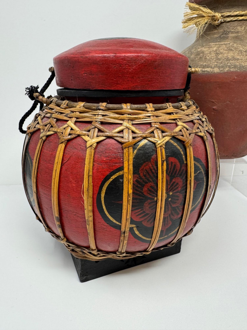 Vintage Thai Lacquered Bamboo Rice Storage Container & Pottery Jar. 9” Tall Each
