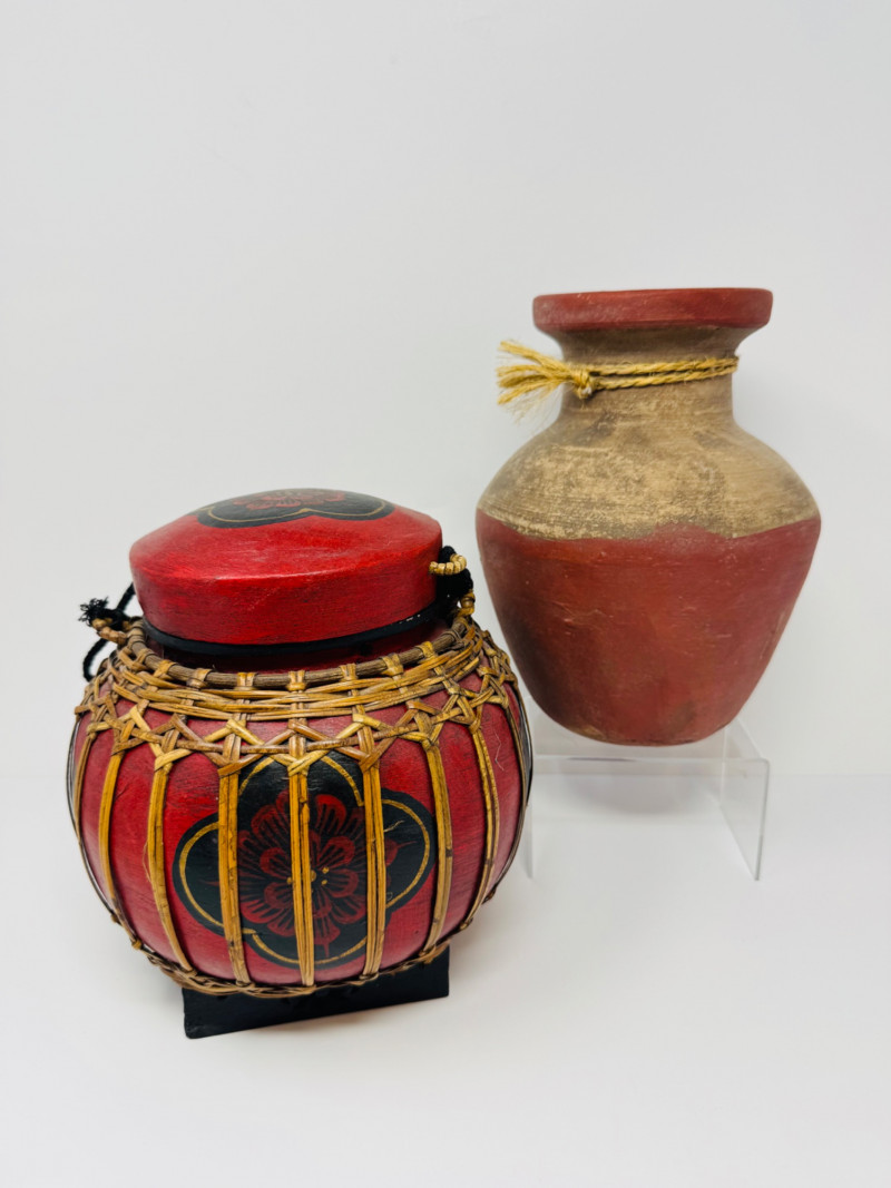 Lot # 202 - Vintage Thai Lacquered Bamboo Rice Storage Container & Pottery Jar