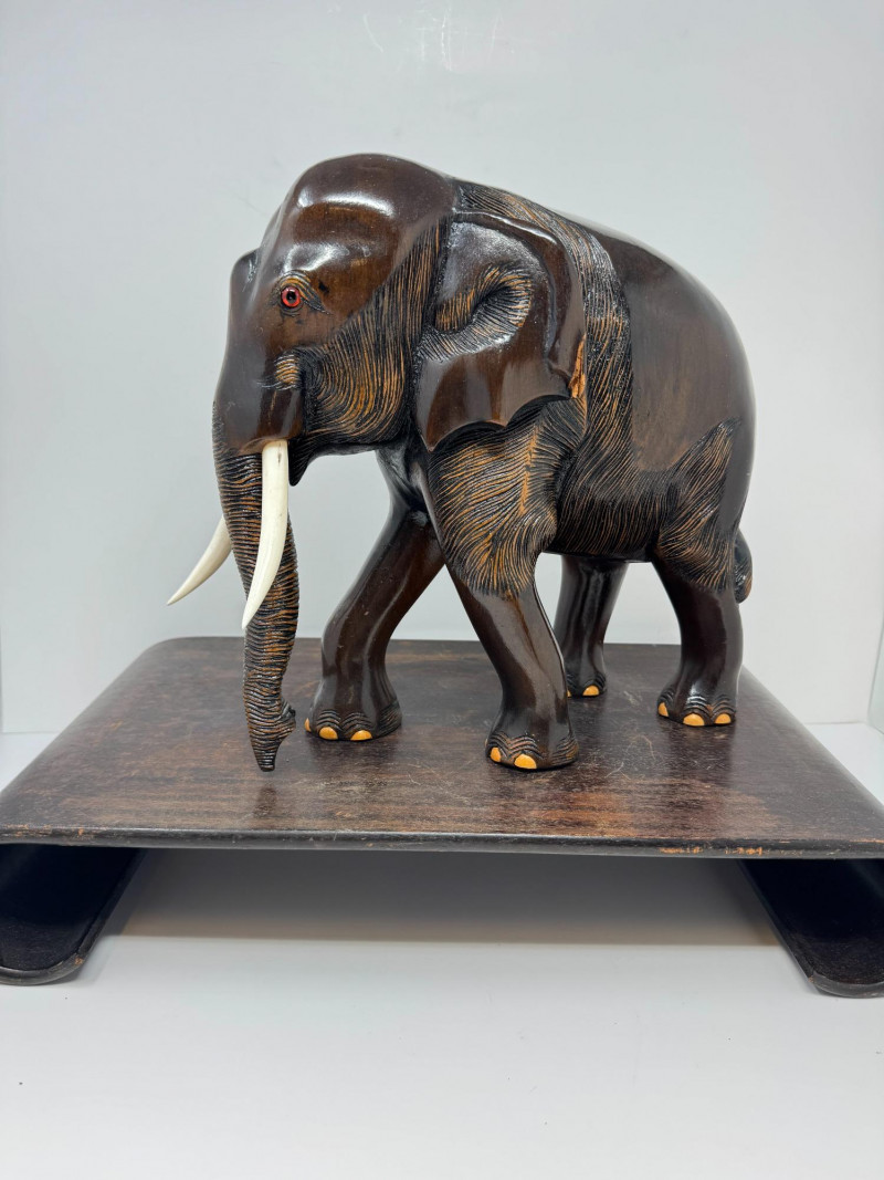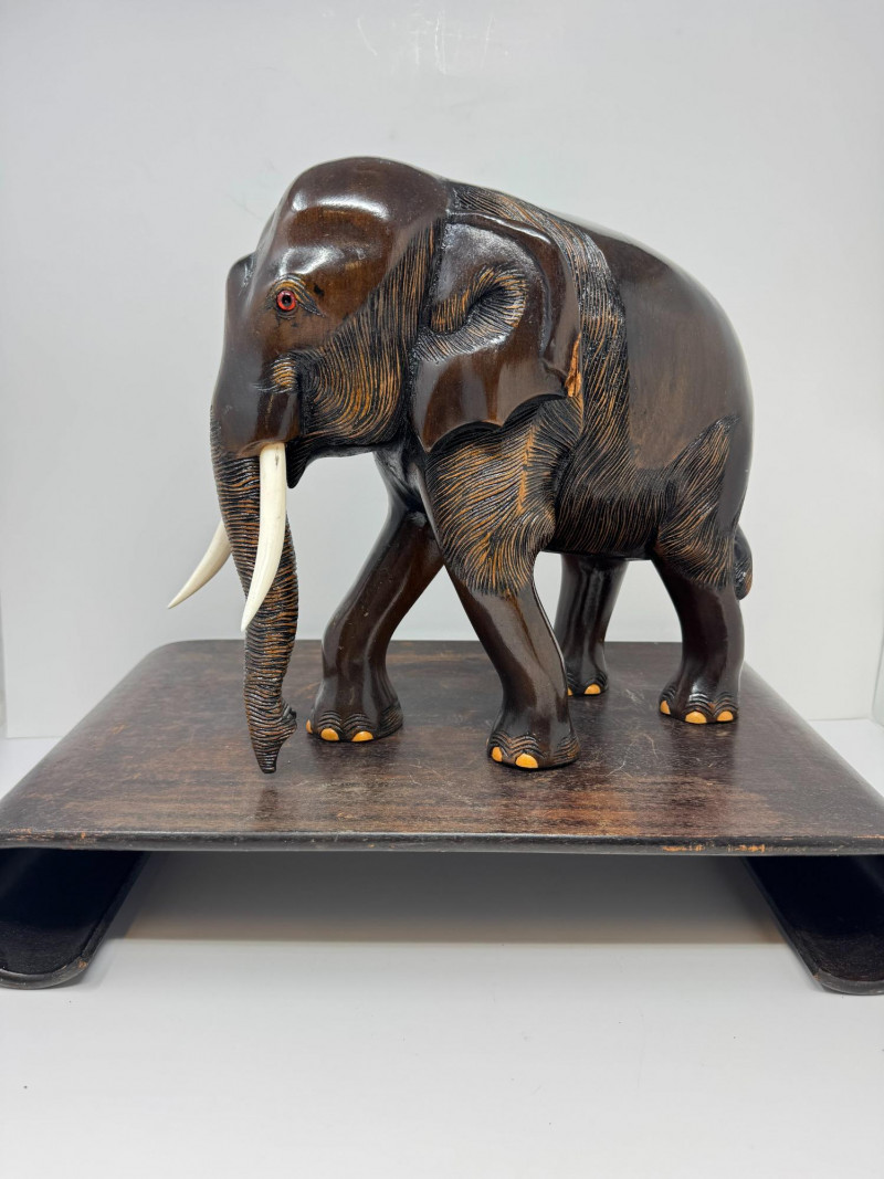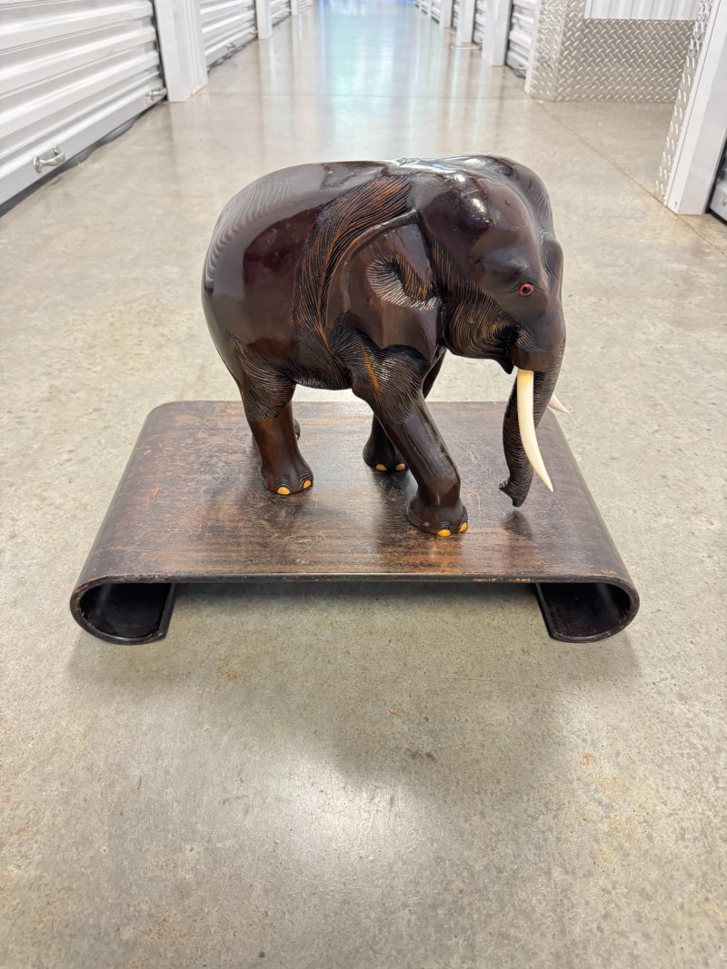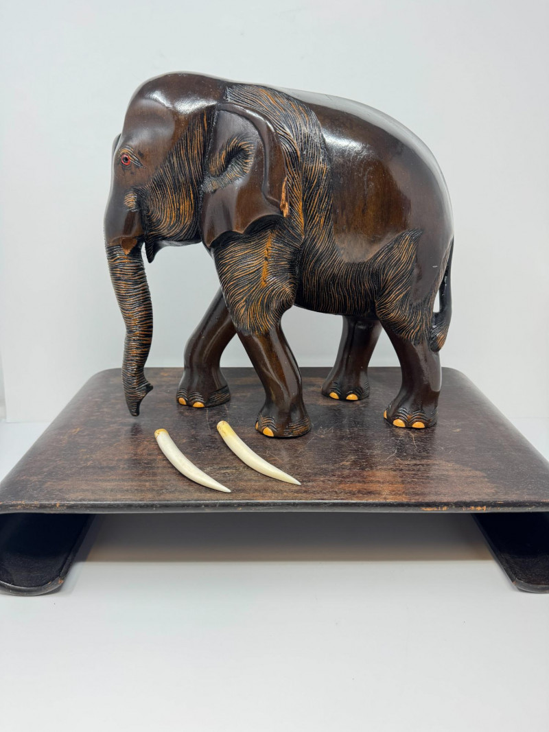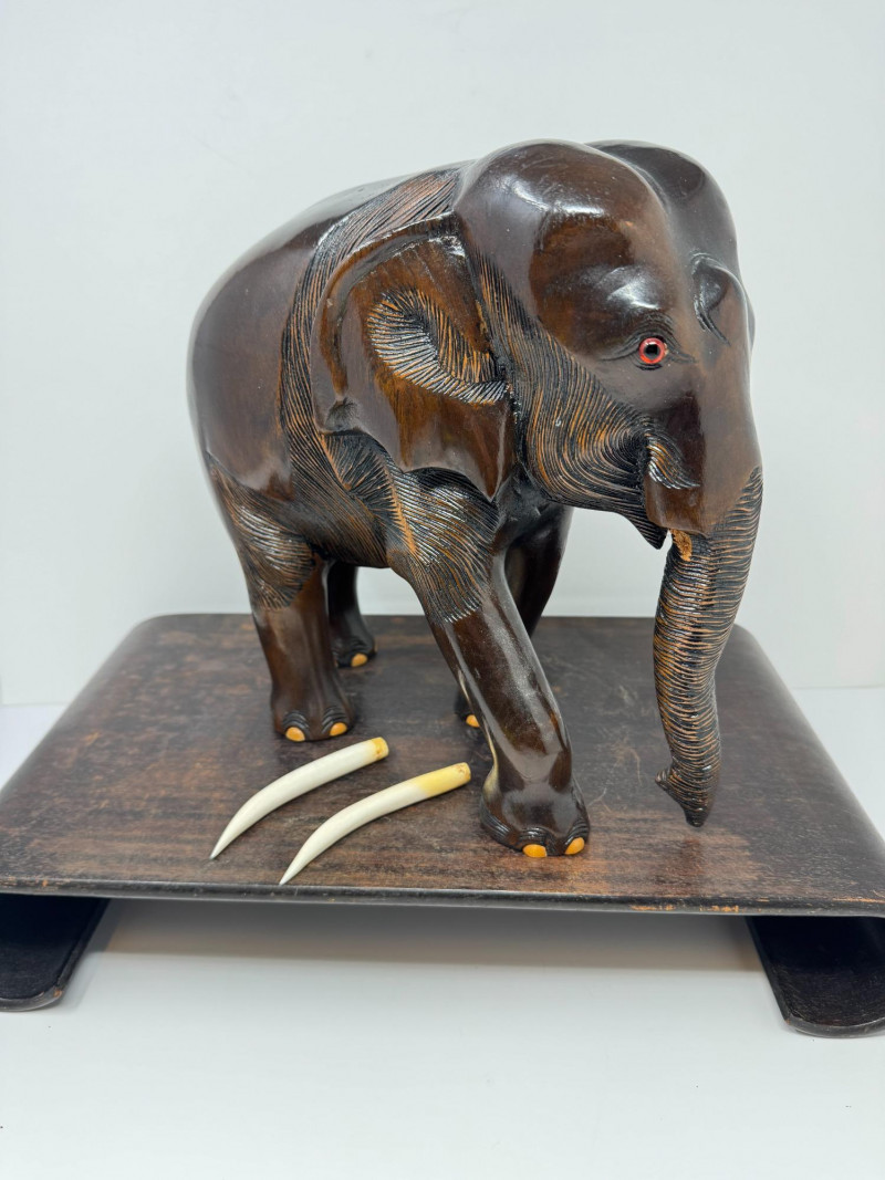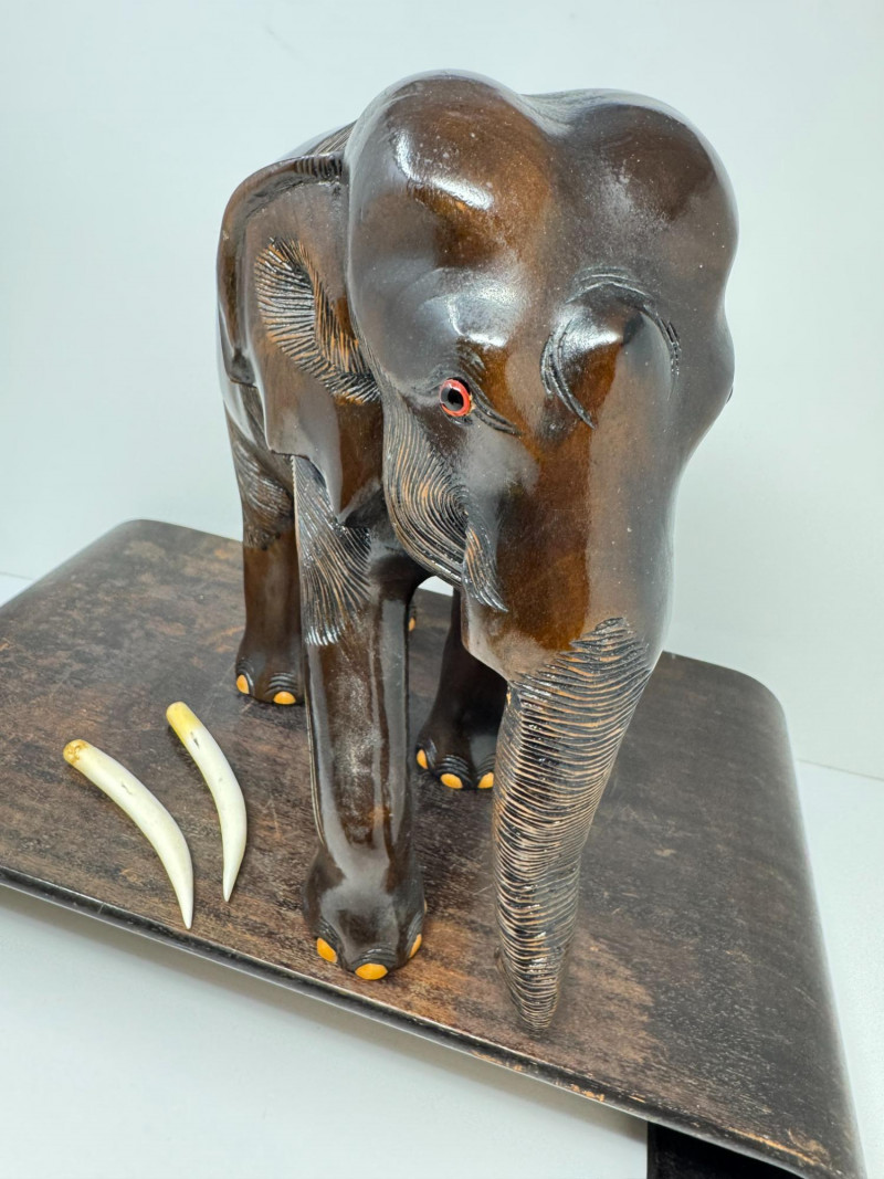 Carved Wooden Elephant Statue w/ Detachable Tusks on Base.