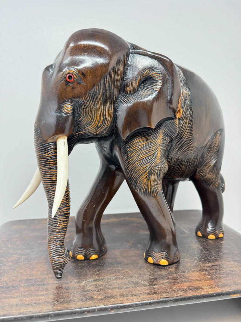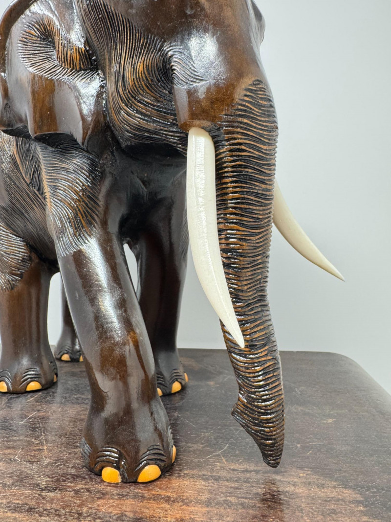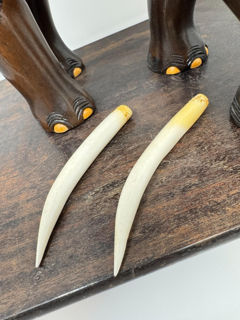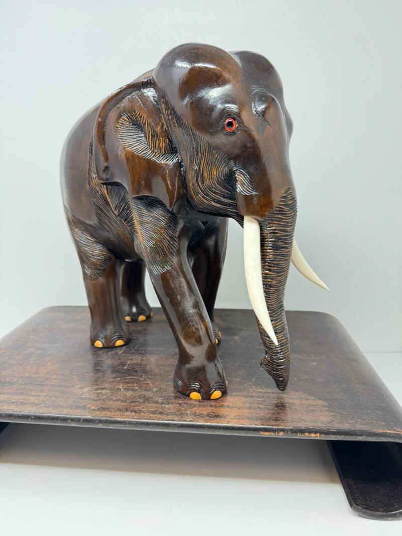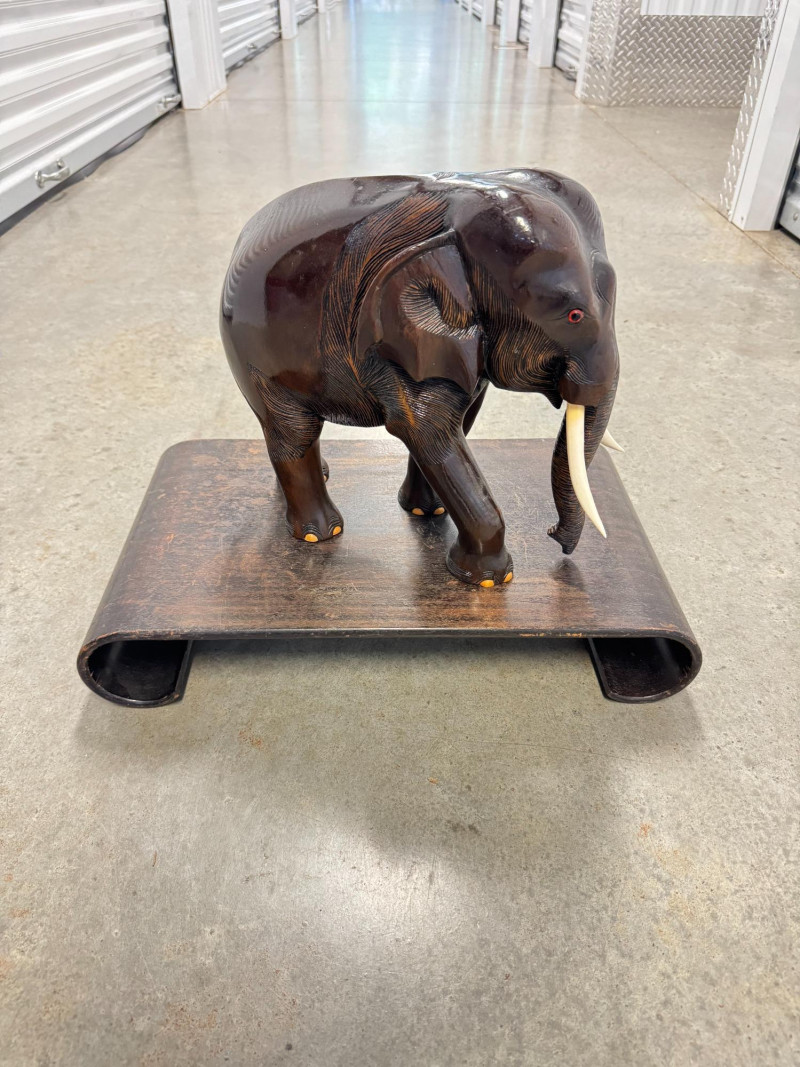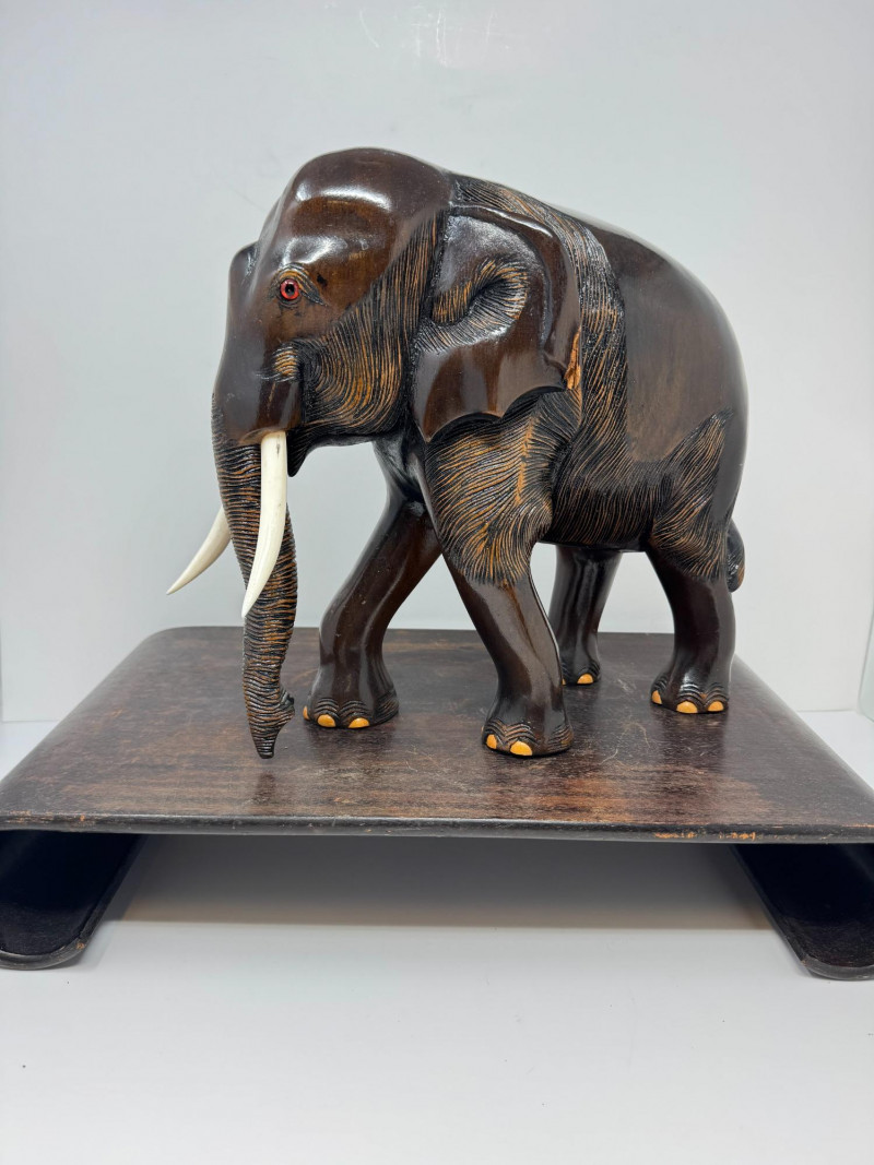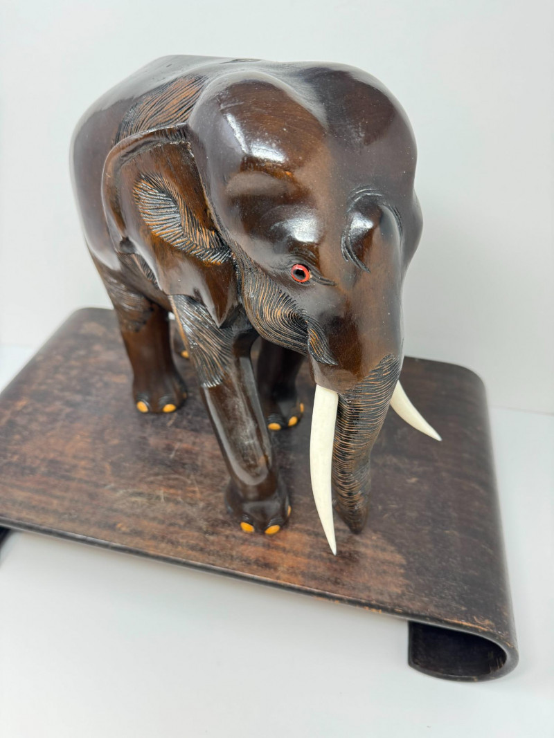 Carved Wooden Elephant Statue w/ Detachable Tusks on Base.