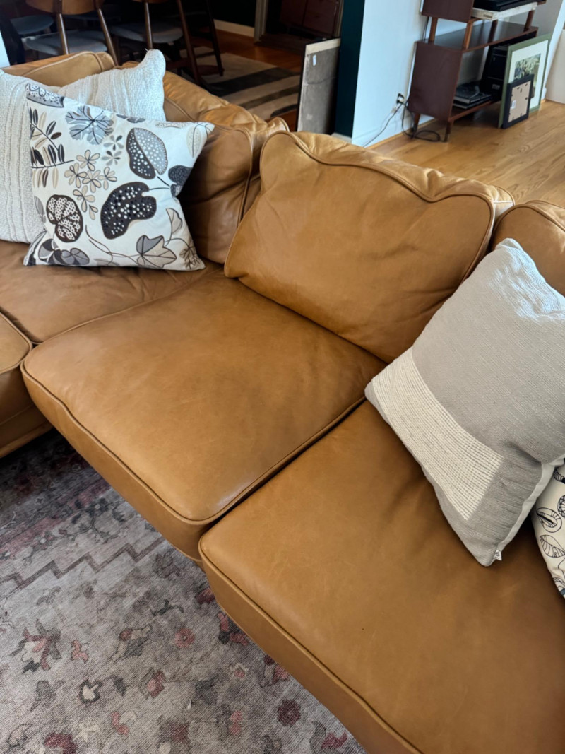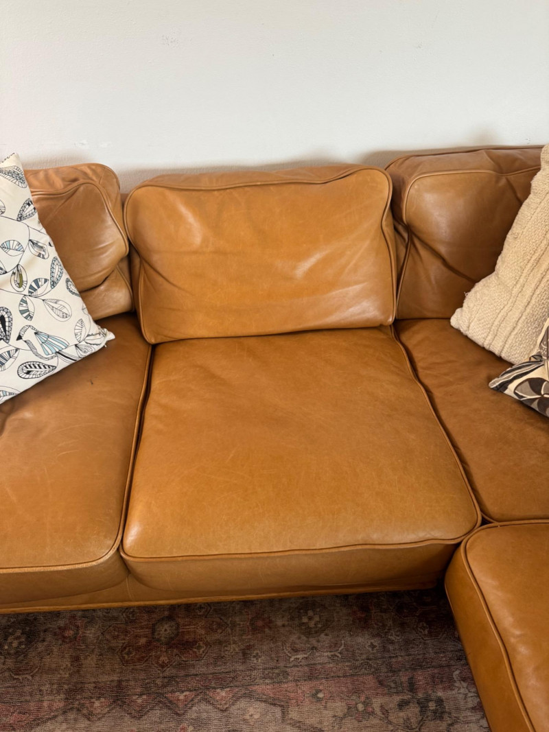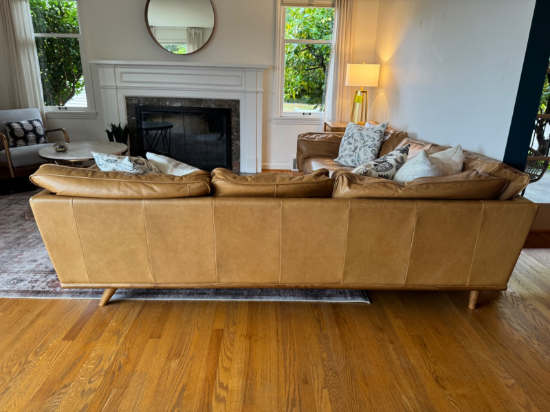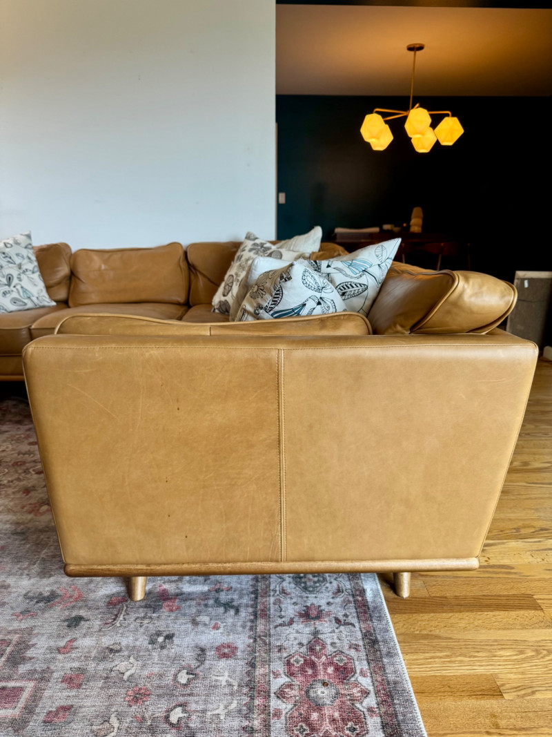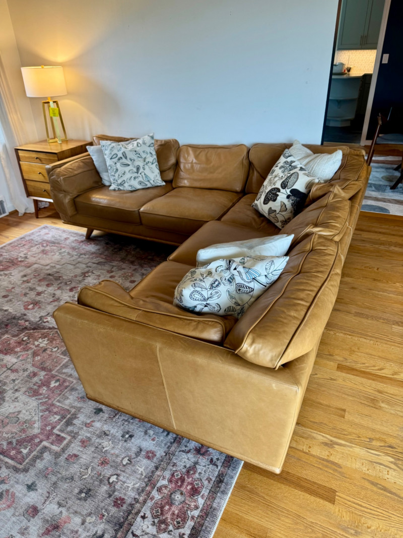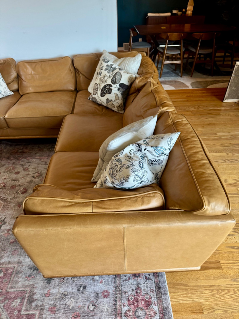 Joybird MCM Style Leather Sectional Couch w/ Wood Base & Tapered Legs. Bidding on this lot is an agreement that: (1.) You will have at least 2 capable, able bodied persons to lift and load at a minimum. (2.) You will bring a hand truck and/or any other tools needed to remove this item. If these steps are not followed your item will be forfeit and no refund given.