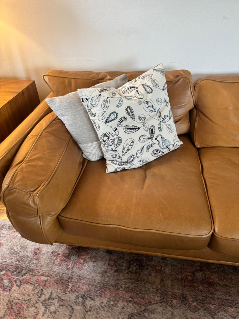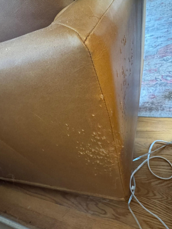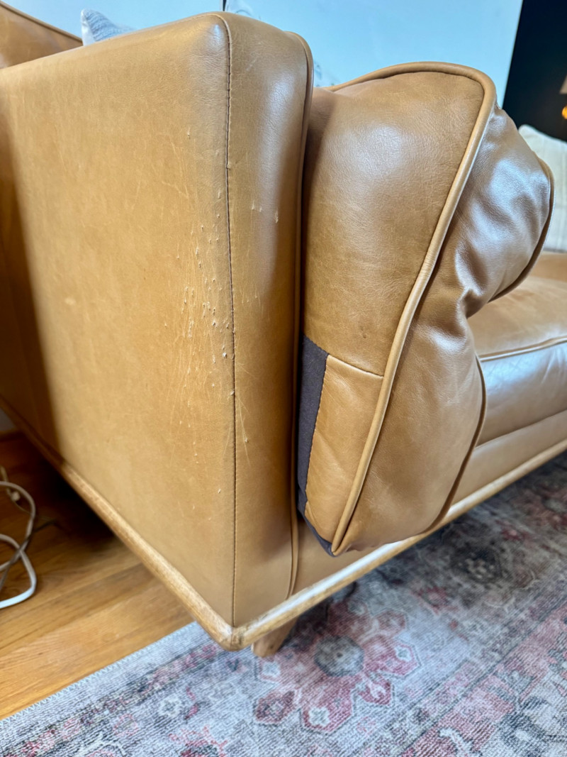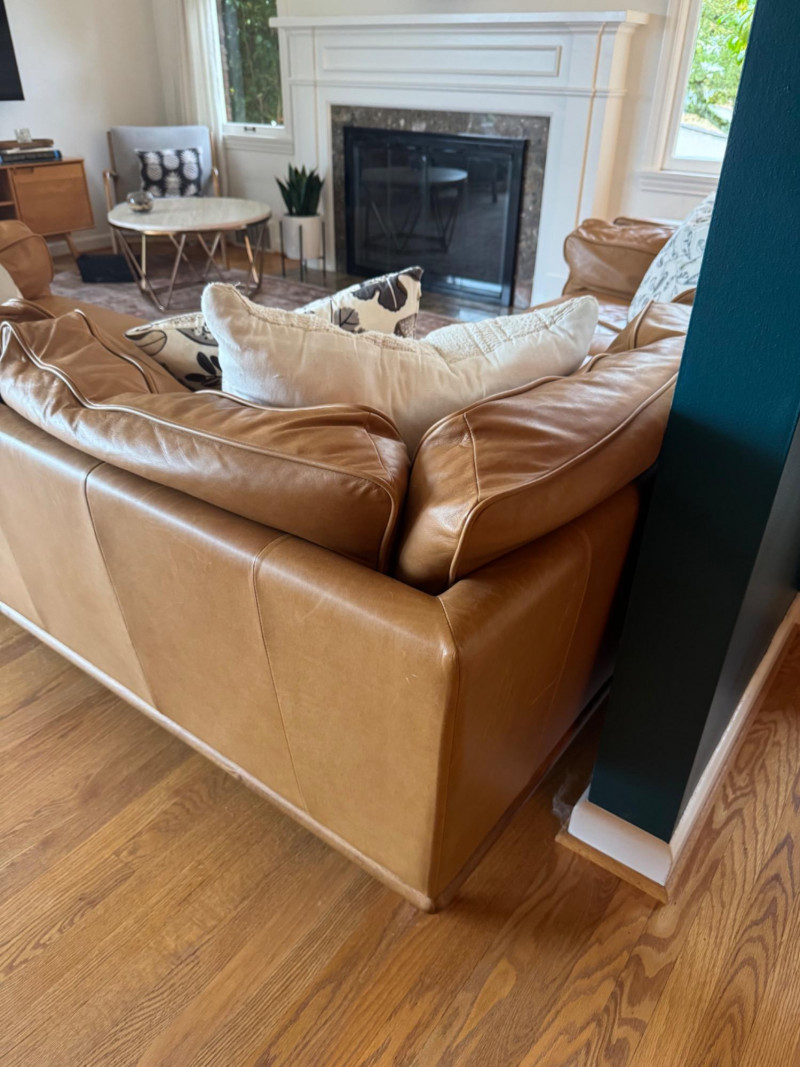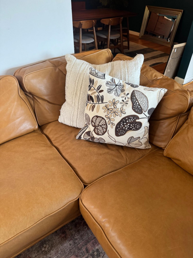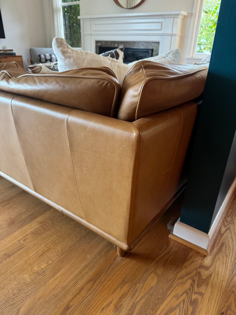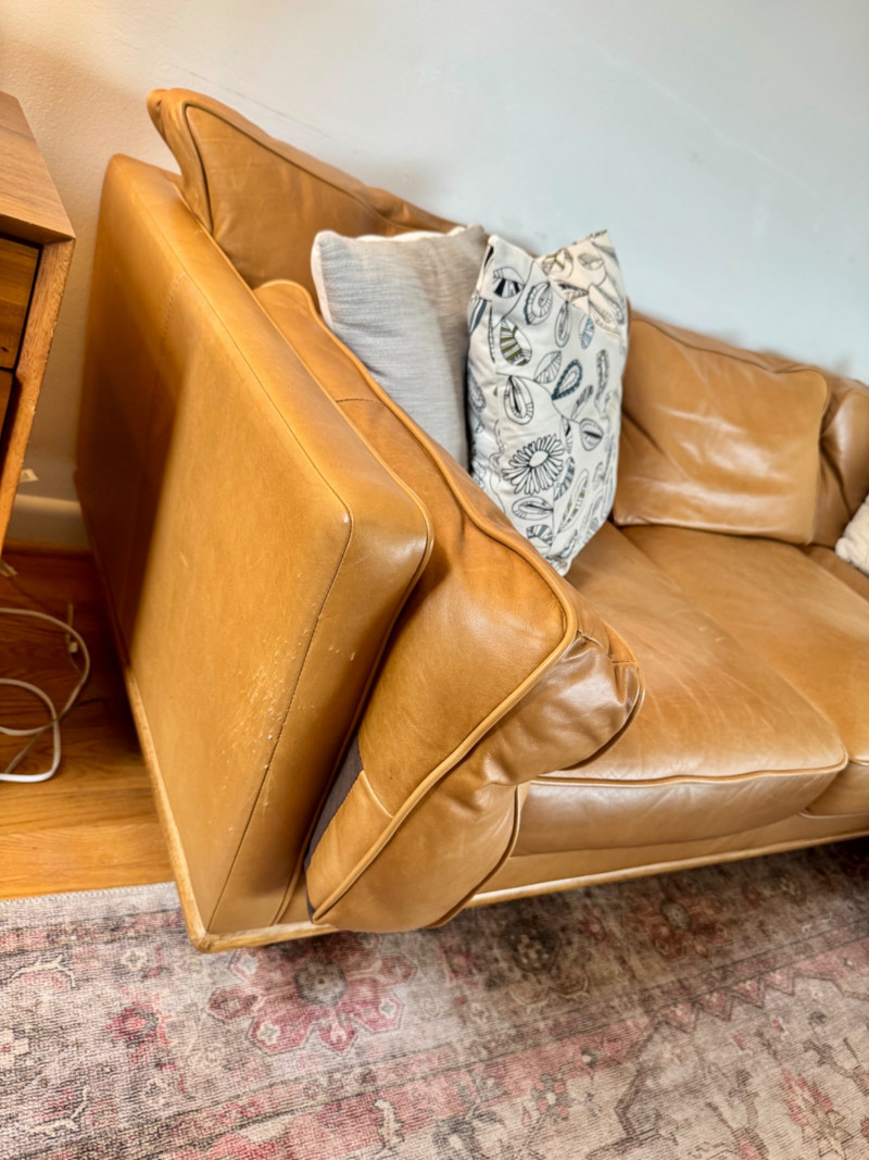 Joybird MCM Style Leather Sectional Couch w/ Wood Base & Tapered Legs. Bidding on this lot is an agreement that: (1.) You will have at least 2 capable, able bodied persons to lift and load at a minimum. (2.) You will bring a hand truck and/or any other tools needed to remove this item. If these steps are not followed your item will be forfeit and no refund given.