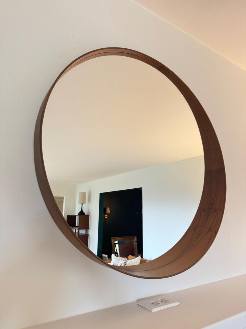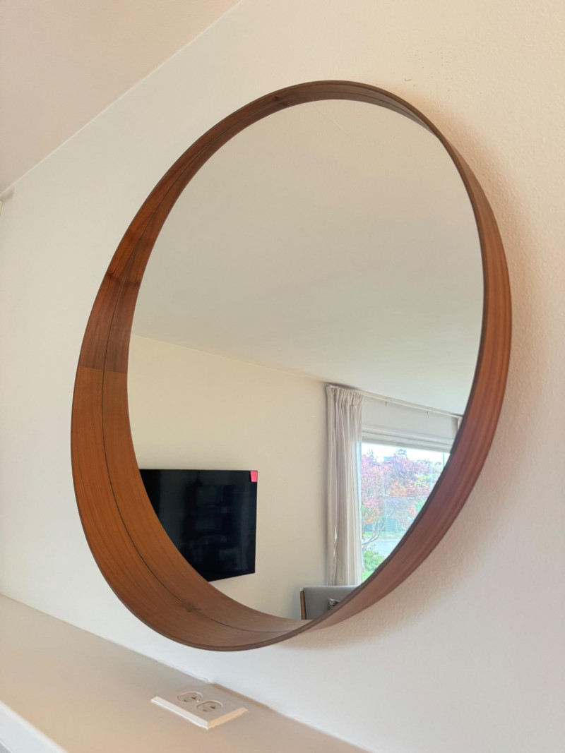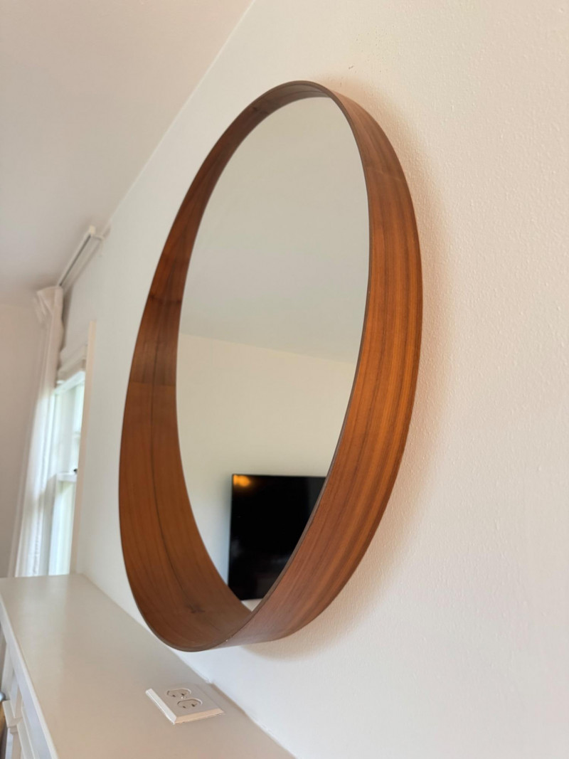 Round Mirror w/ Streamlined Walnut-Tone Veneer Frame.