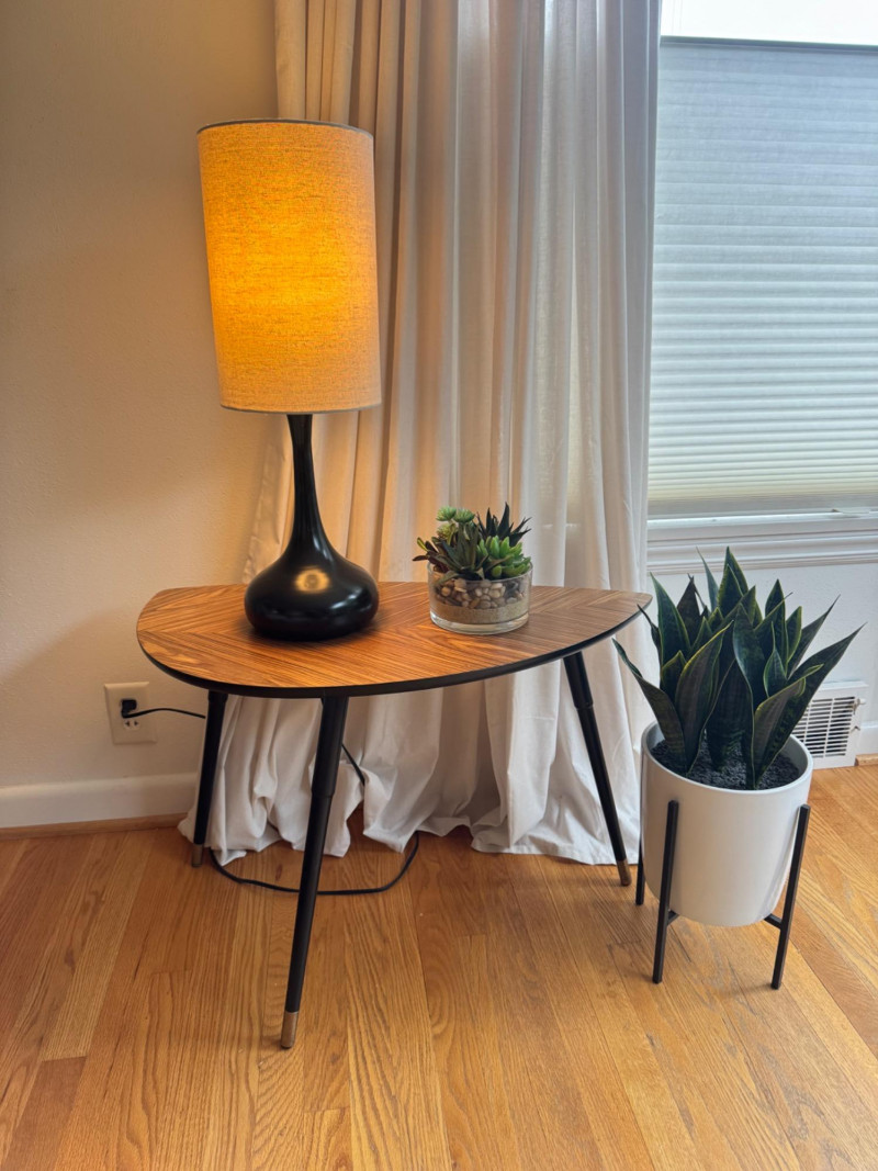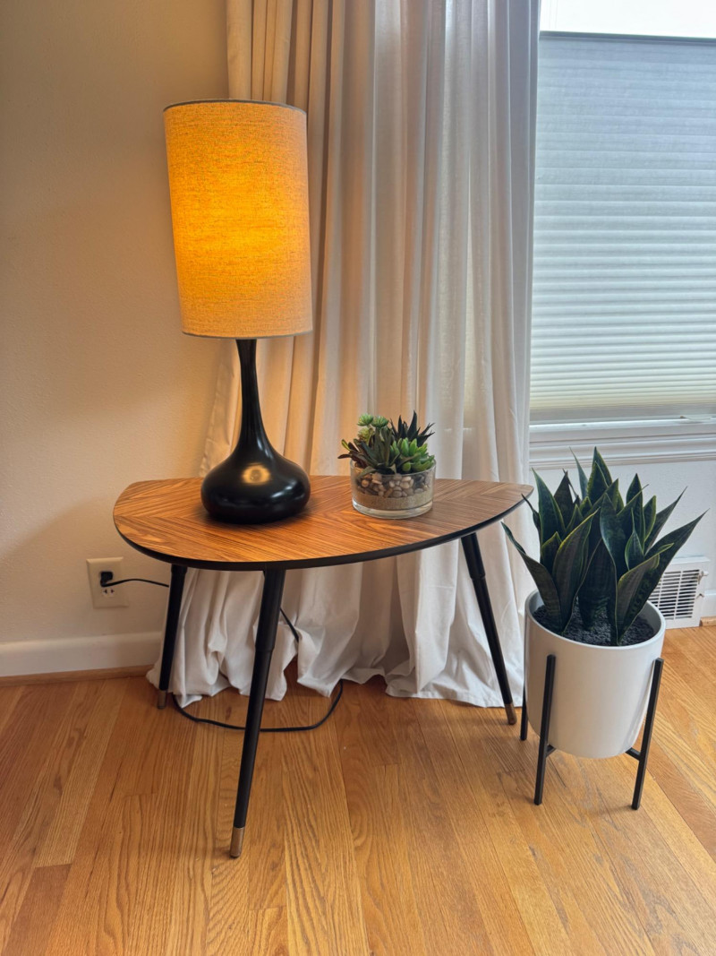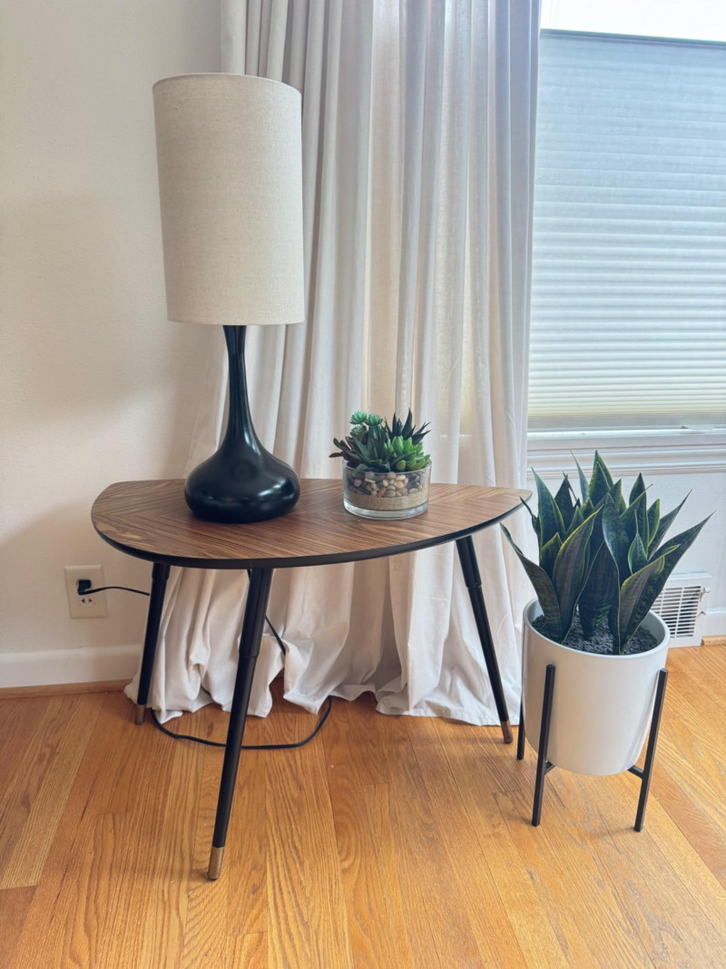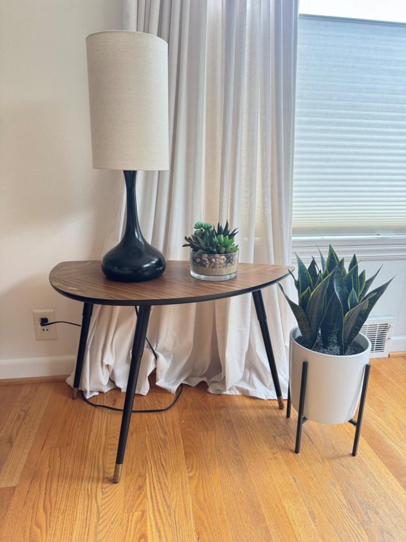 IKEA MCM Style Side Table, Droplet Lamp, & Faux Plants. IKEA mid-century modern style side table with laminate wood-grain top Dimensions: 29” long x 20” tall Tall table lamp with black metal base and fabric shade Lamp height: 24” tall Faux snake plant in white pot with black metal stand Plant height: 23” tall Round faux succulent arrangement in glass bowl included