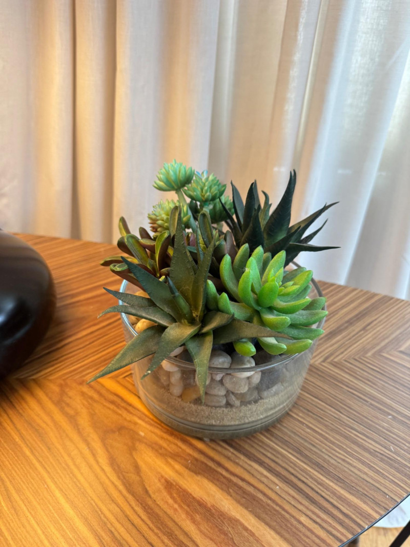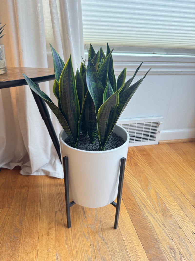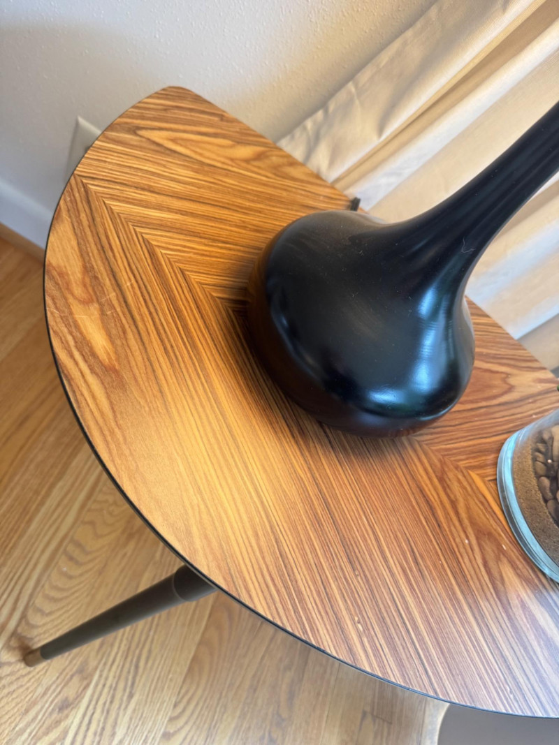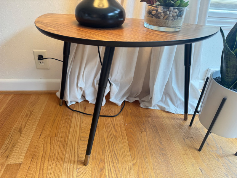 IKEA MCM Style Side Table, Droplet Lamp, & Faux Plants. IKEA mid-century modern style side table with laminate wood-grain top Dimensions: 29” long x 20” tall Tall table lamp with black metal base and fabric shade Lamp height: 24” tall Faux snake plant in white pot with black metal stand Plant height: 23” tall Round faux succulent arrangement in glass bowl included