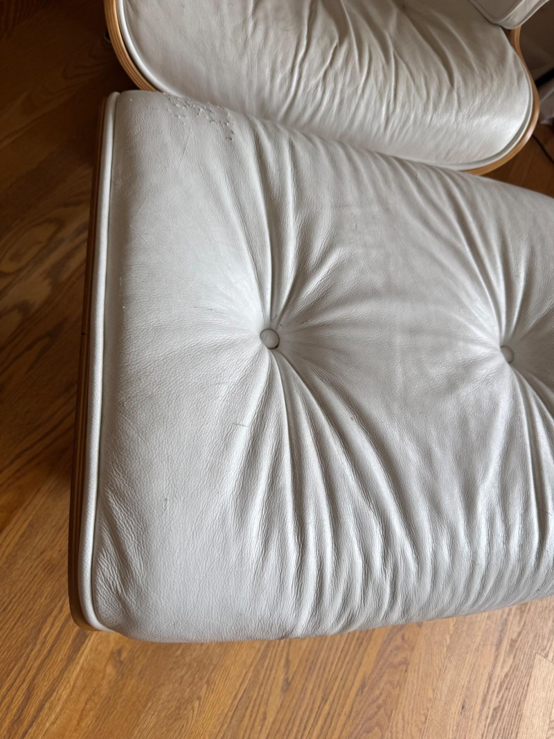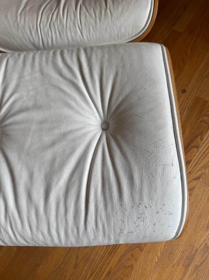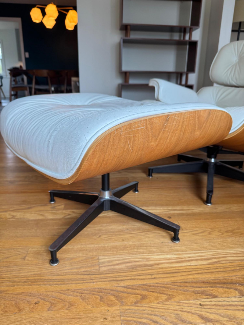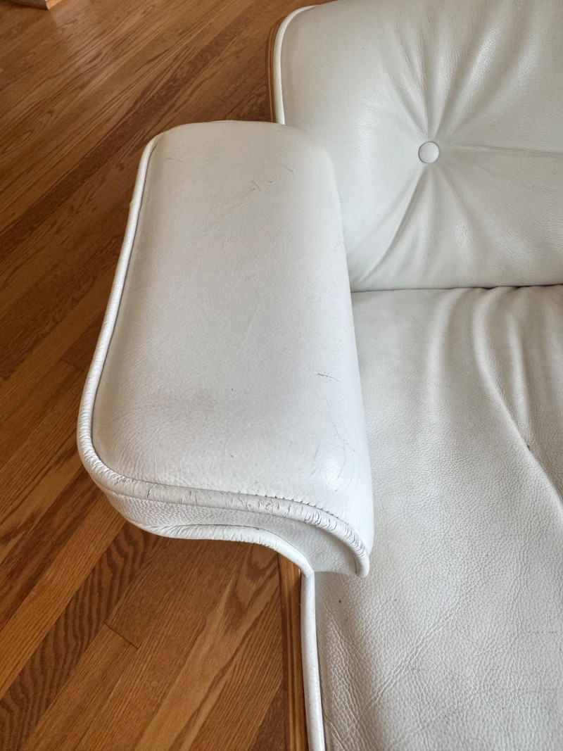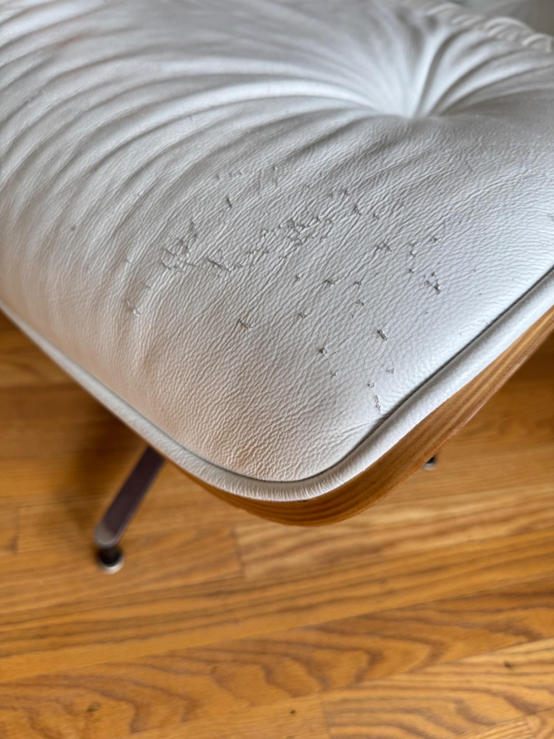 Eames Style Lounge Chair & Ottoman. Condition: Wear and cat scratches noted to leather surfaces. Structurally solid with very good bones, offering an excellent base for restoration or continued use.