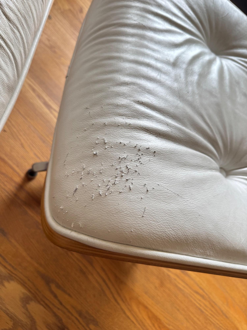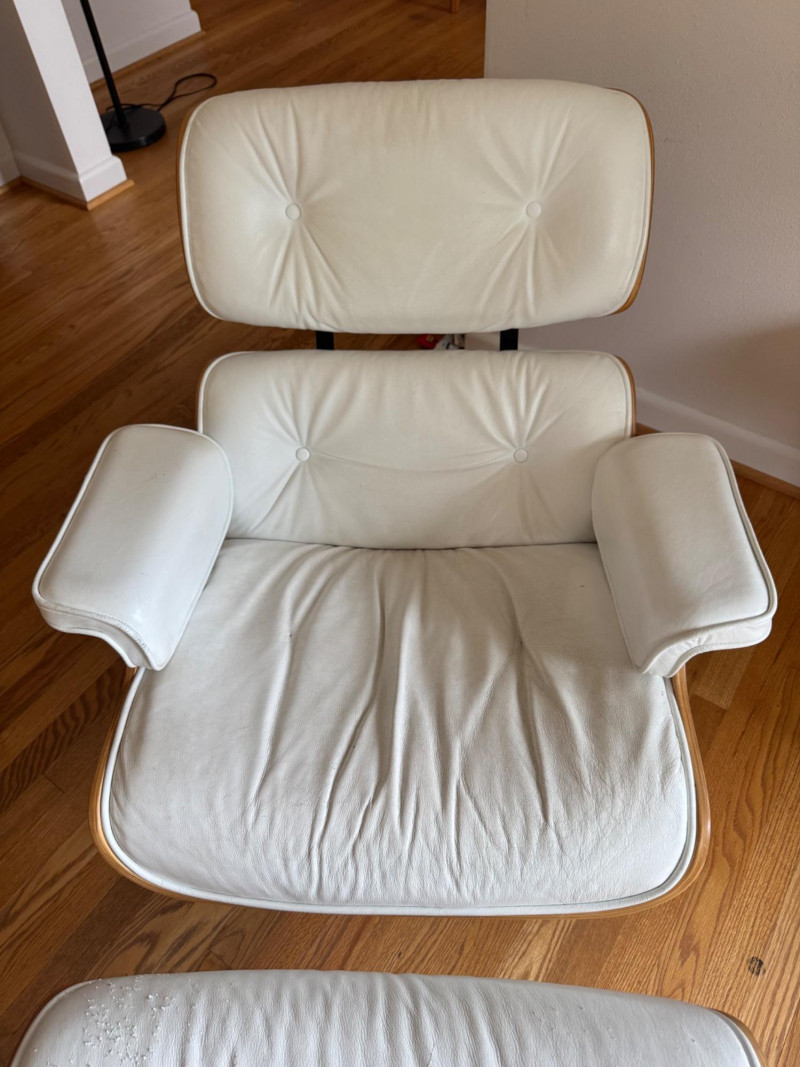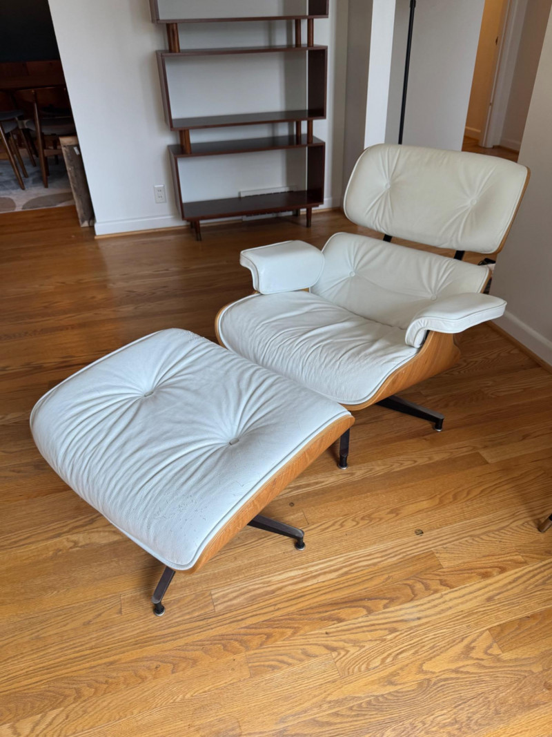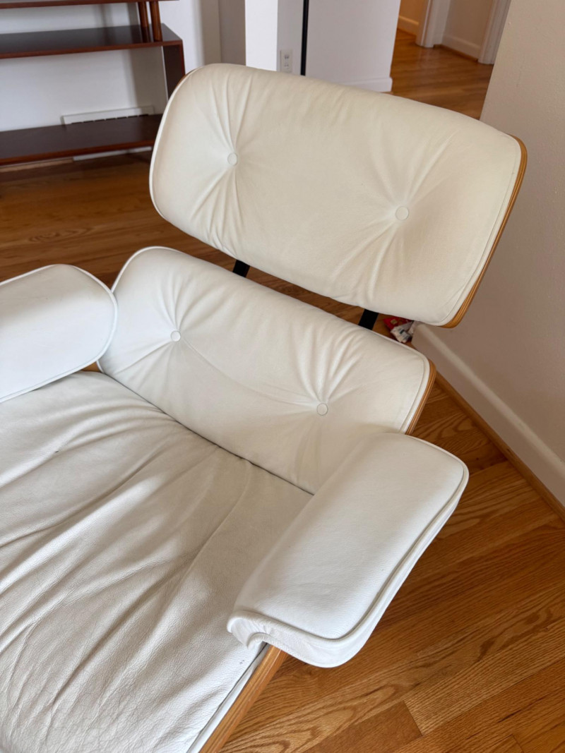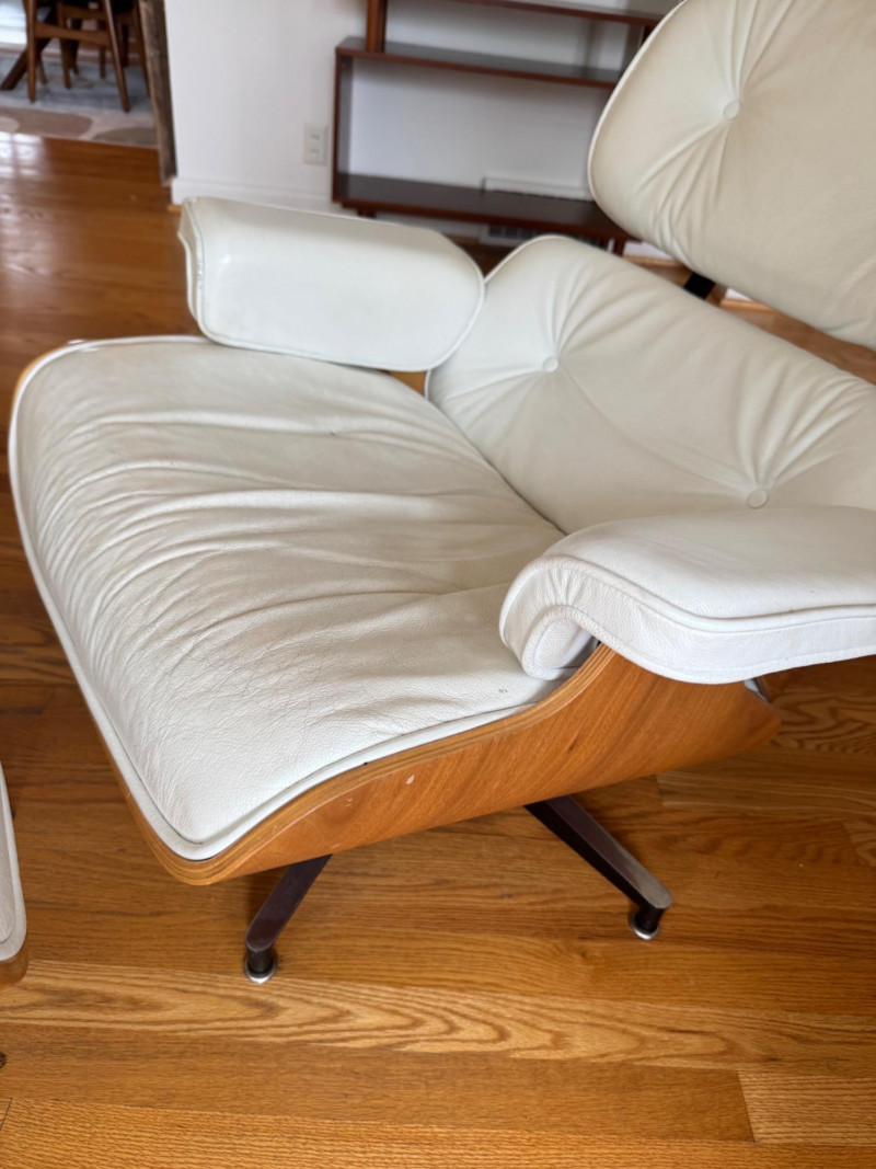 Eames Style Lounge Chair & Ottoman. Condition: Wear and cat scratches noted to leather surfaces. Structurally solid with very good bones, offering an excellent base for restoration or continued use.