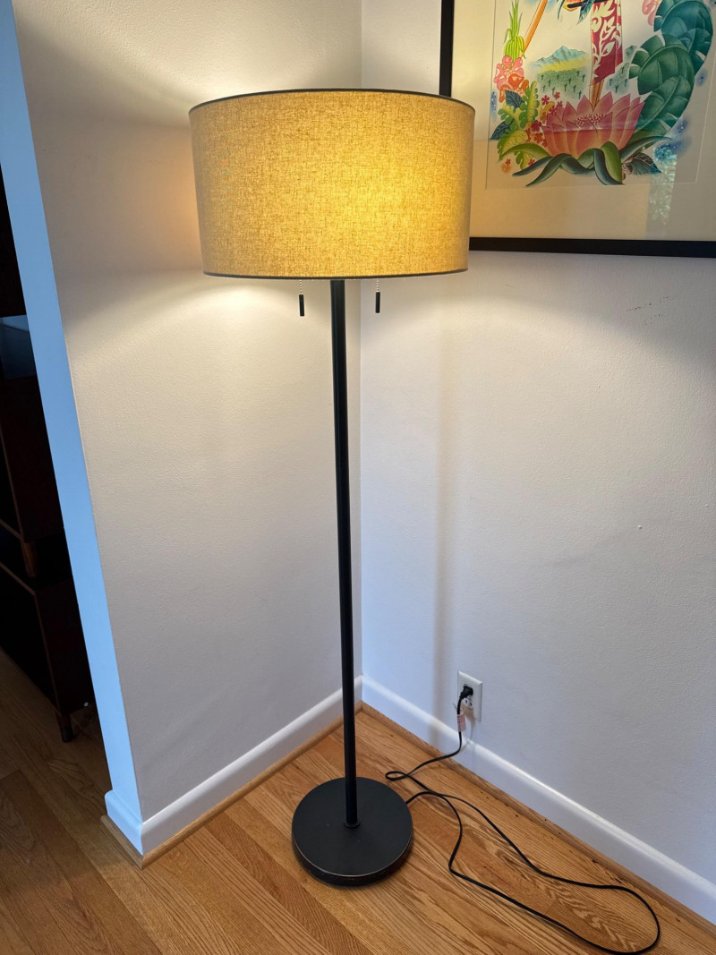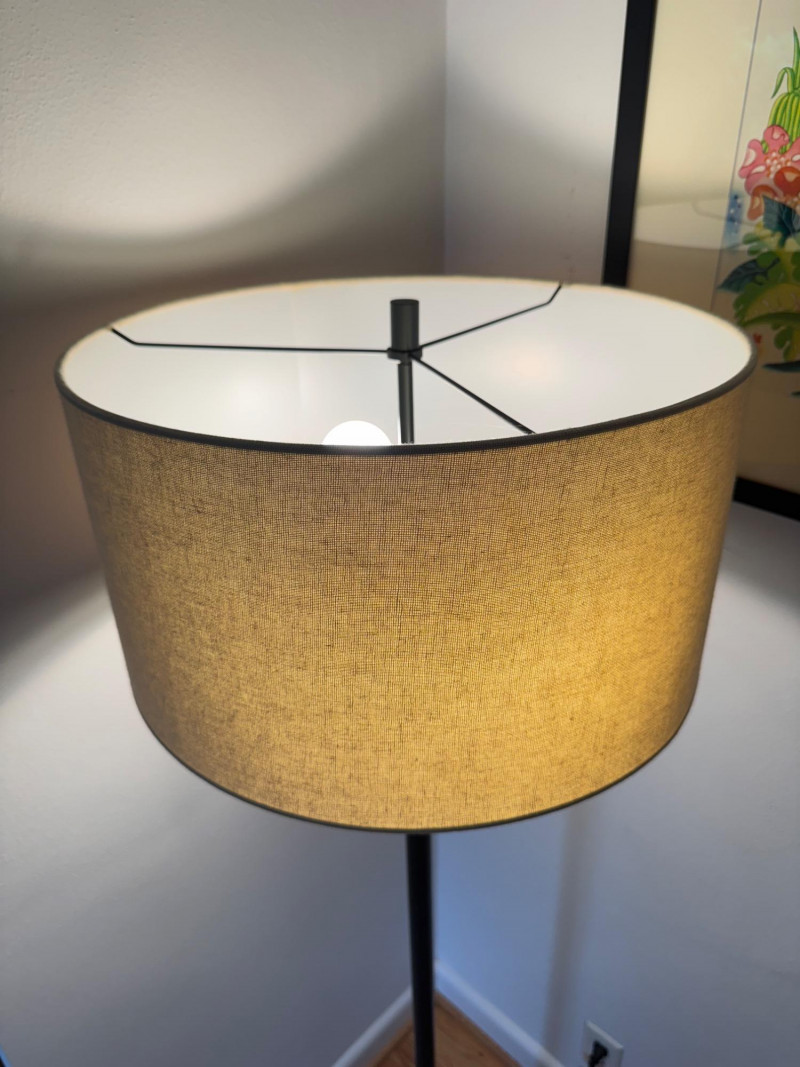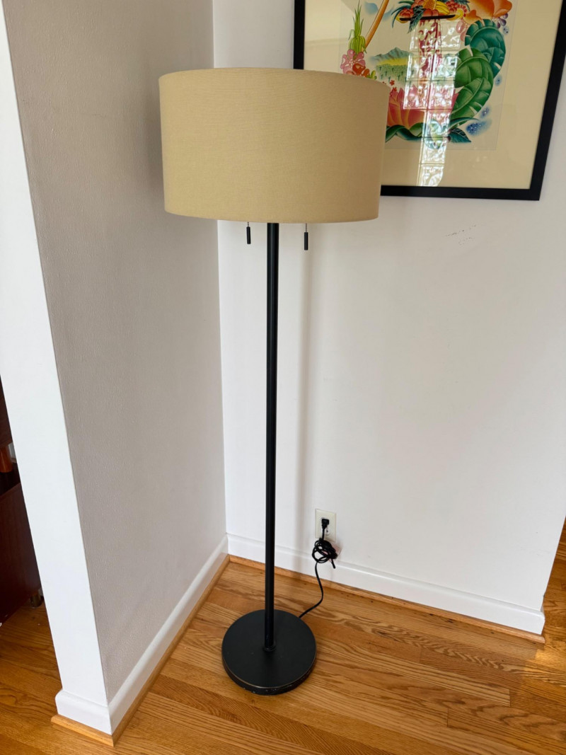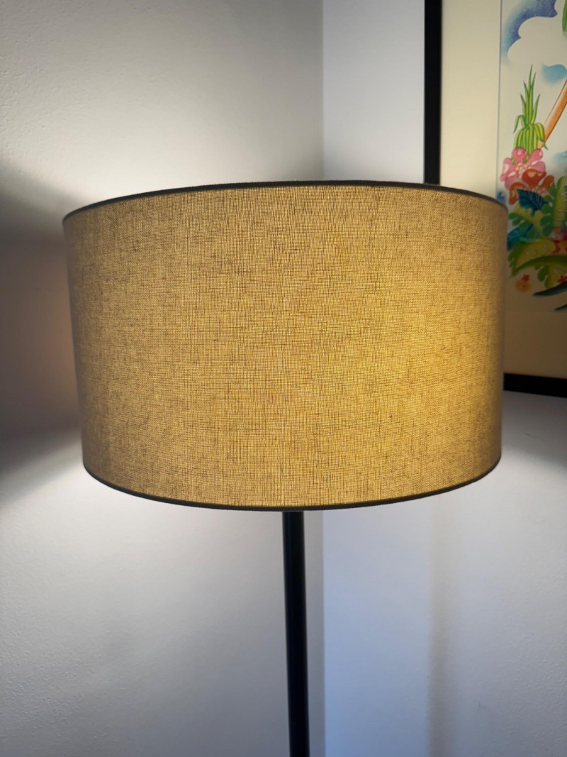 Tall Standing Black Floor Lamp w/ Drum Shade. Height: 58” tall