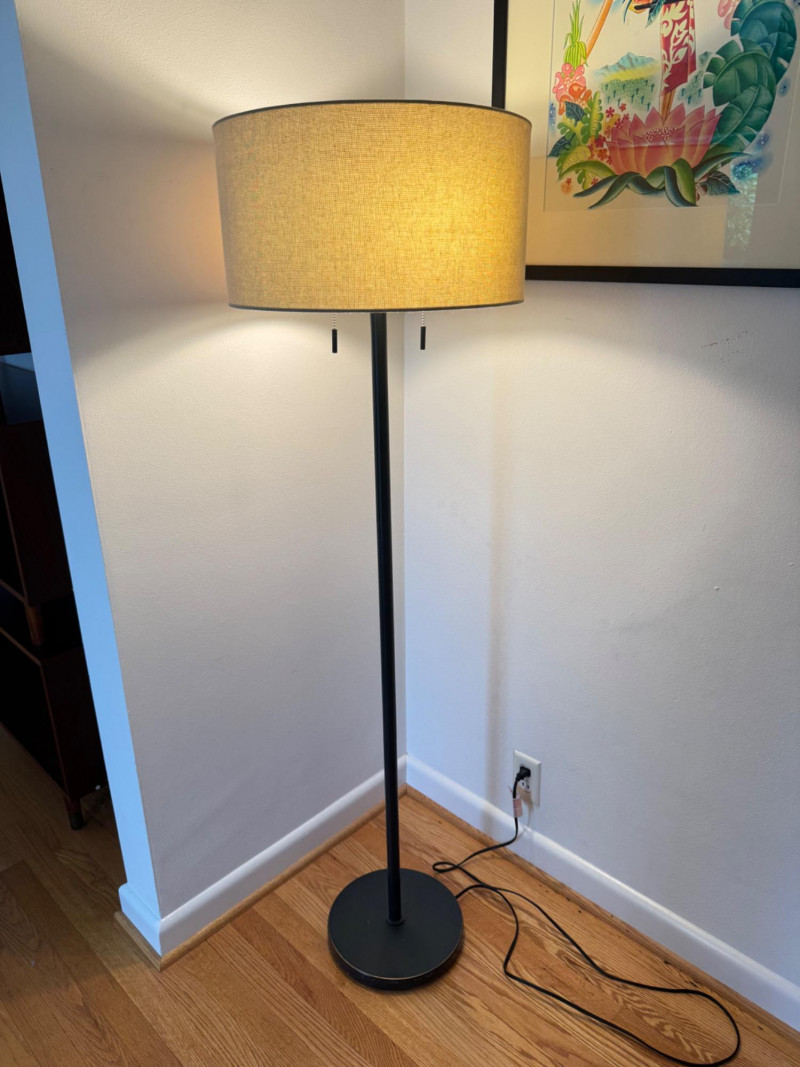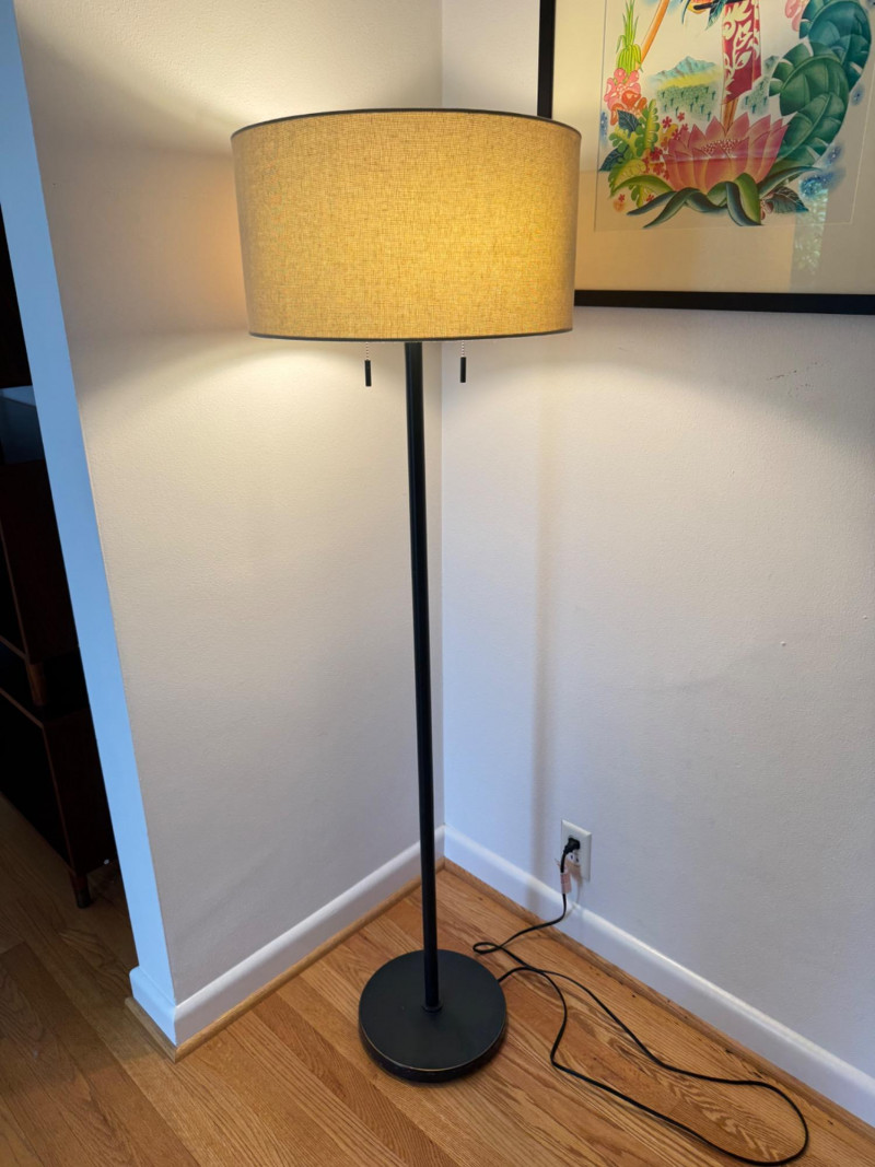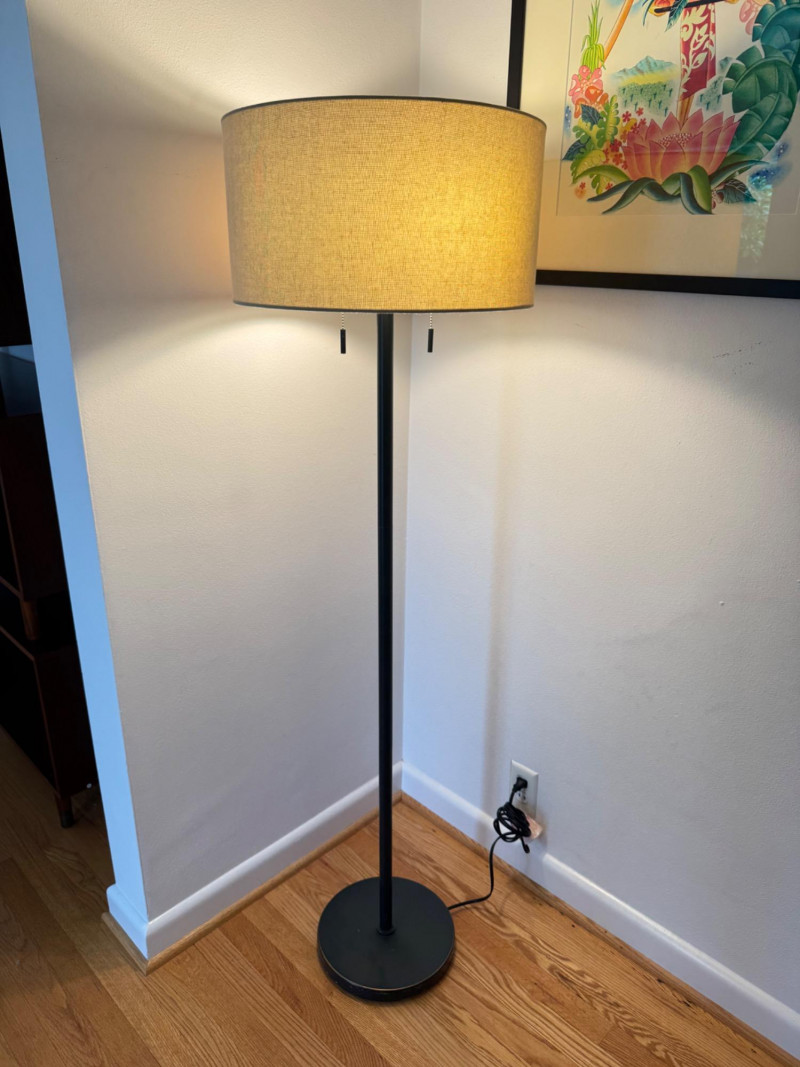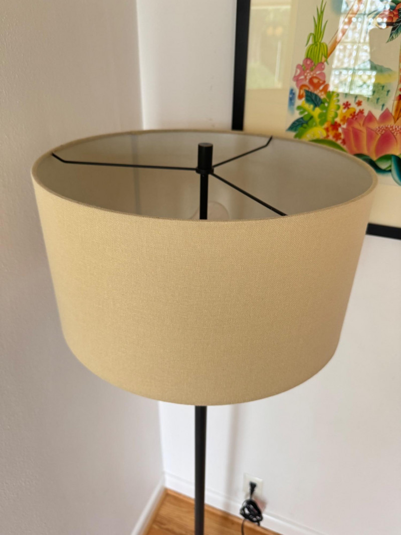 Tall Standing Black Floor Lamp w/ Drum Shade. Height: 58” tall