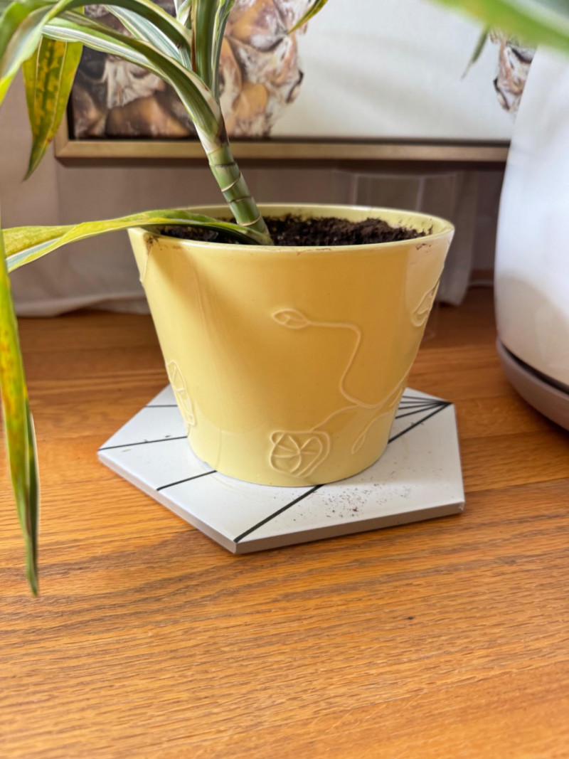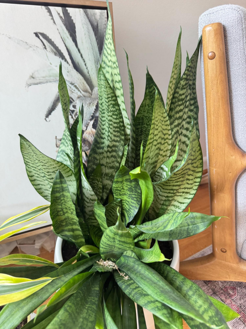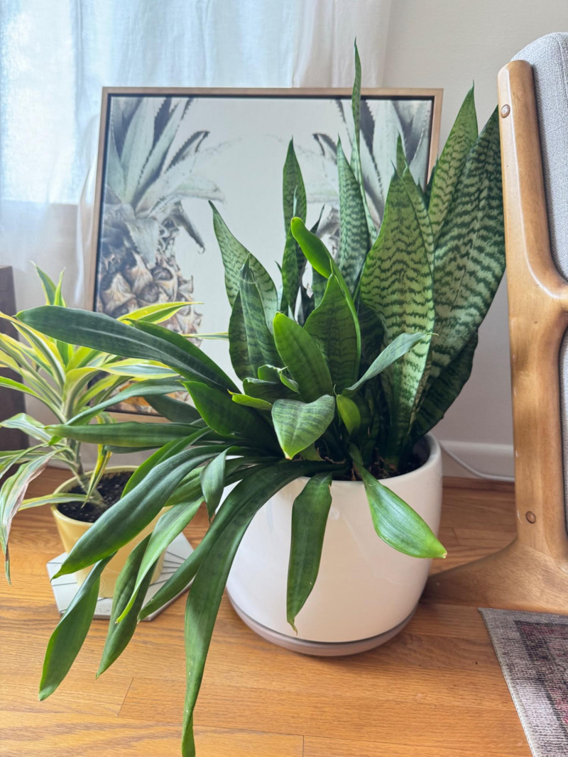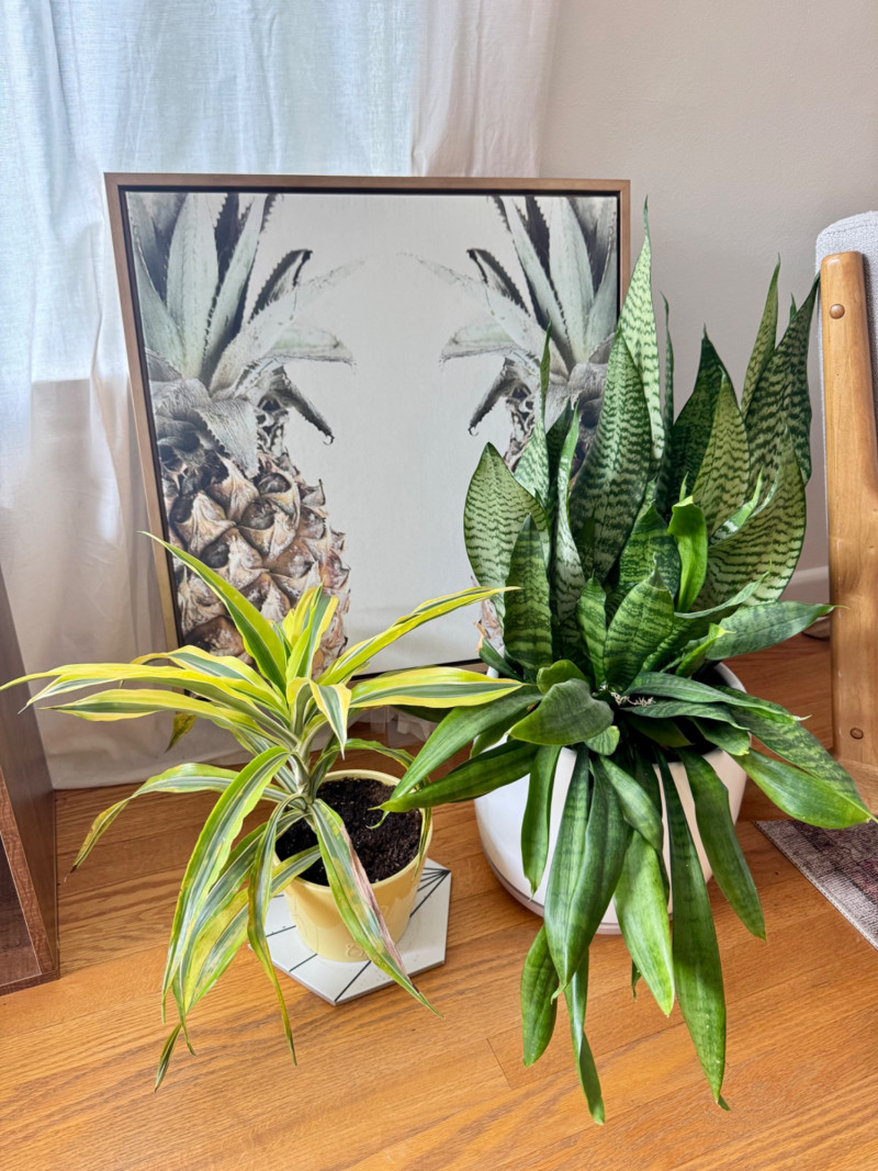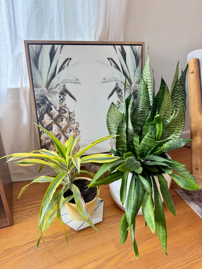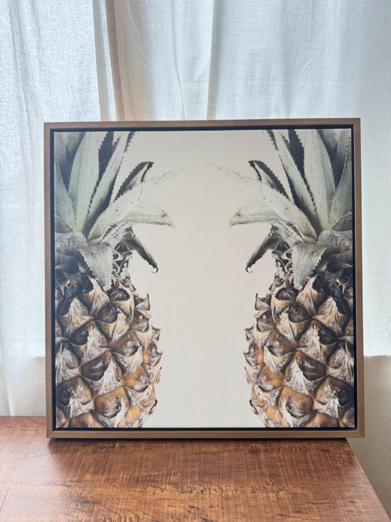 Pineapple Canvas Print + 2 Live Plants (Snake Plant & Dracaena). Square pineapple-themed canvas wall art, 24” x 24” (Uniek, 2011) Includes 2 live plants: Snake plant (approx. 30” tall, in white ceramic pot) Dracaena (approx. 20” tall, in yellow pot with saucer)