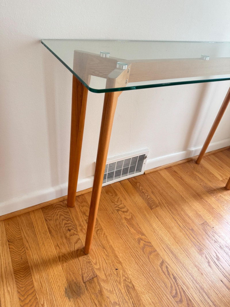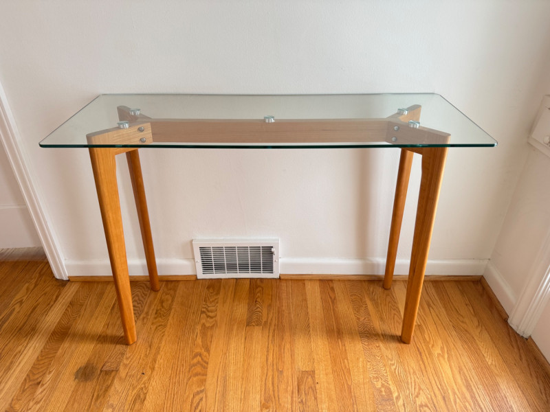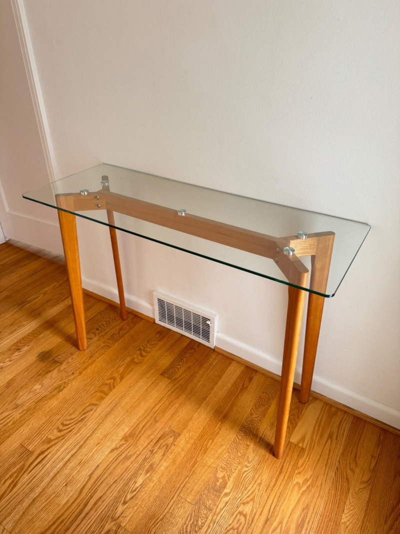 Glass Top Entry Table w/ Angled Wood Base & Chrome Hardware.