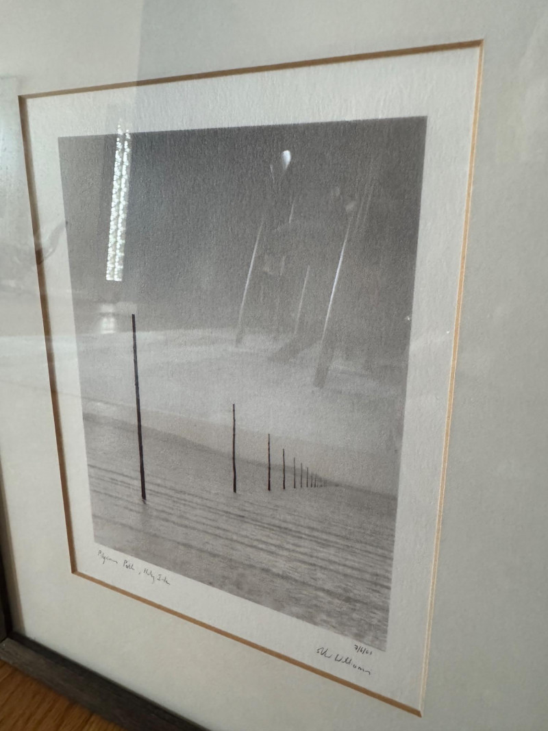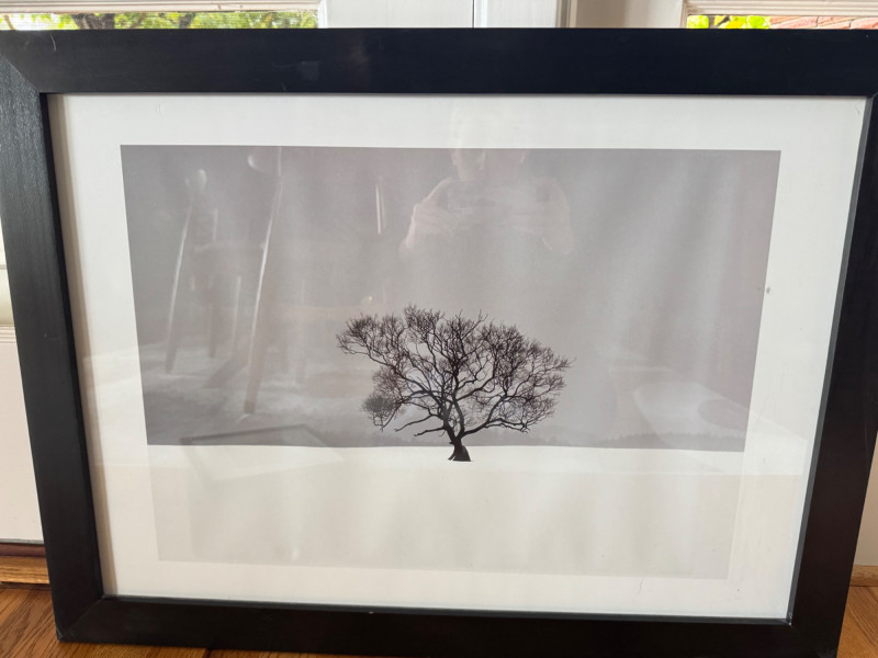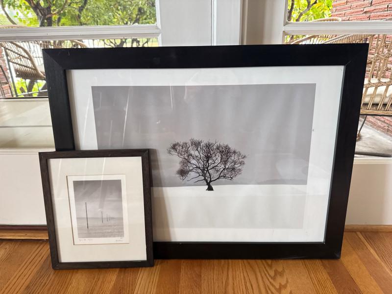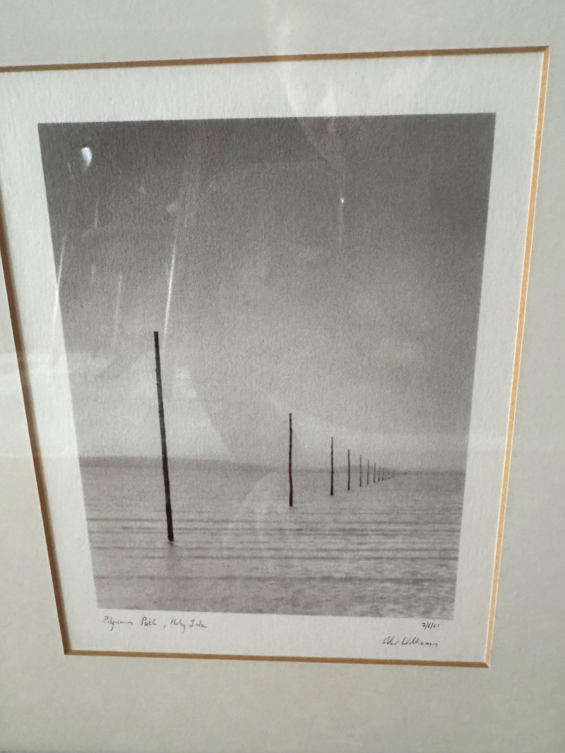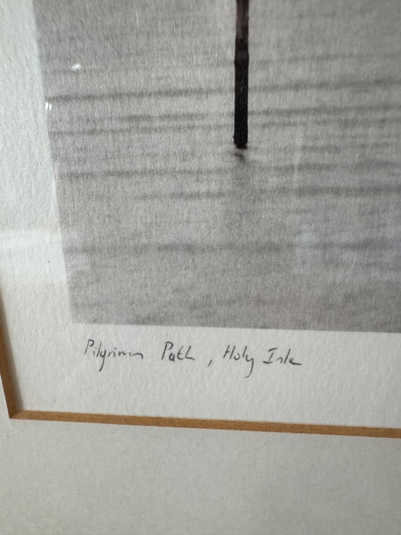 Framed B&W Scenic Prints – "Pilgrim Path, Holy Isle" & Tree Landscape. Pair of framed black & white scenic prints Smaller print titled "Pilgrim Path, Holy Isle" (signed and dated 2001 by artist, appears to read "Sid Williams") Frame size approx. 11" x 13" Larger minimalist tree landscape print (IKEA frame) Frame size approx. 31" x 23"