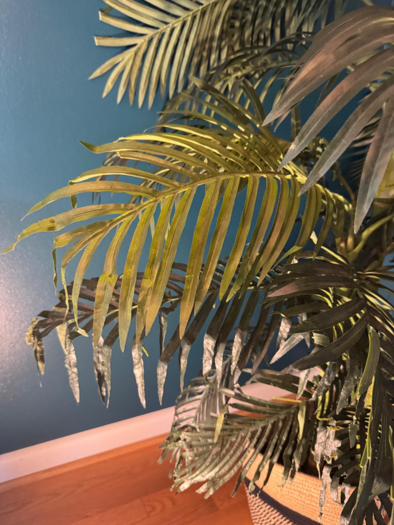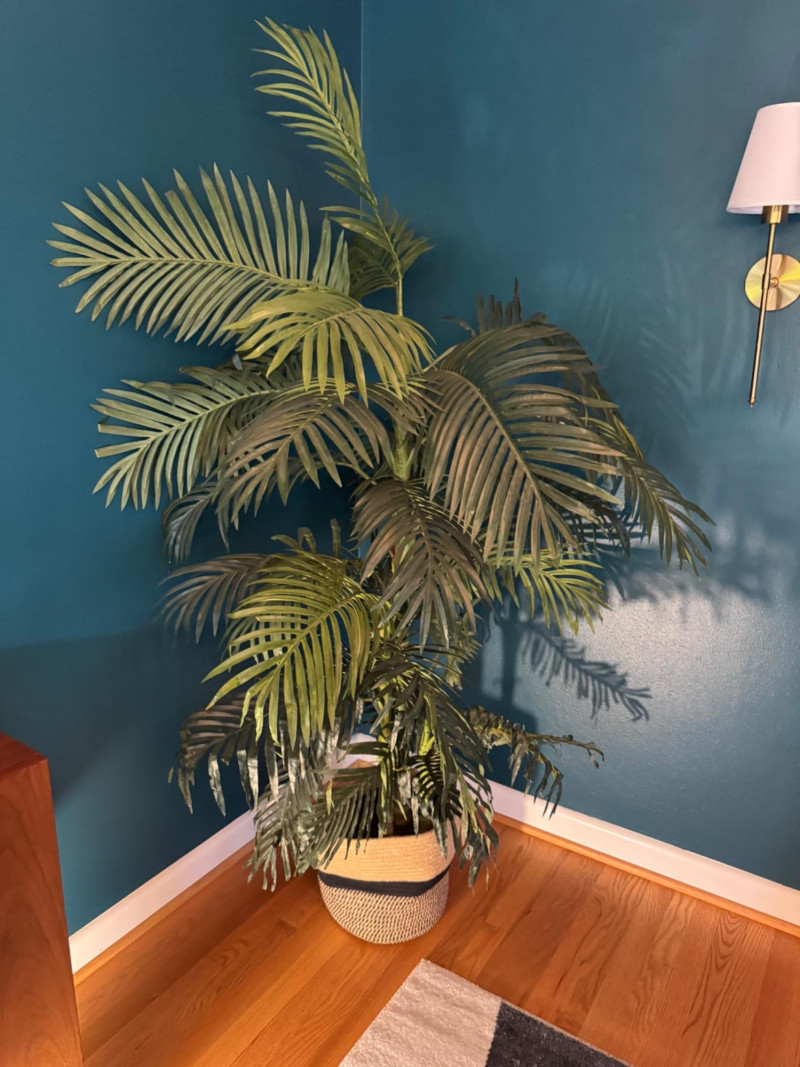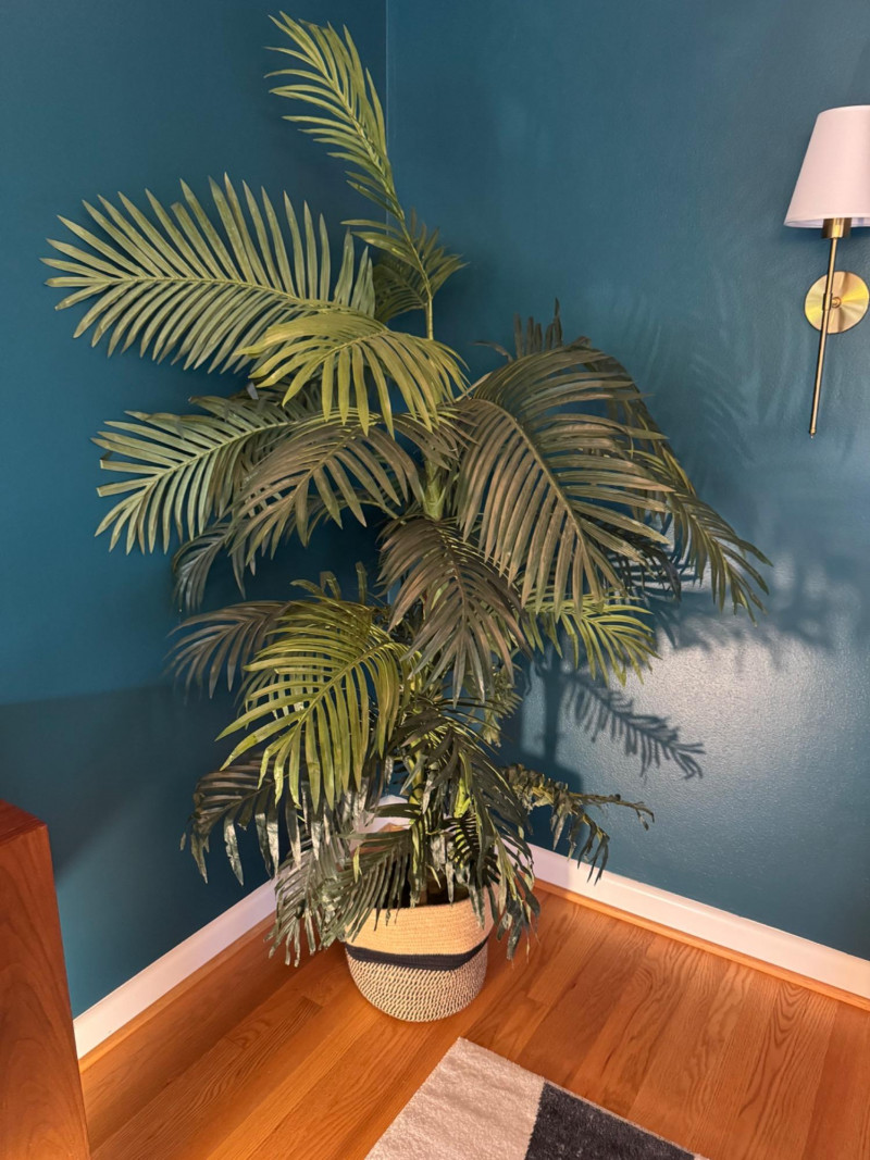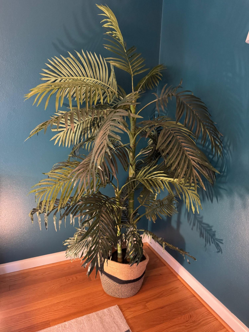 Tall Artificial Palm Tree in Woven Basket Planter – 74”.