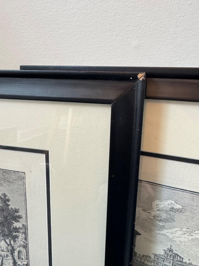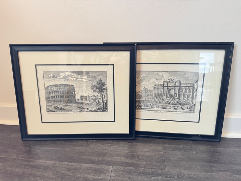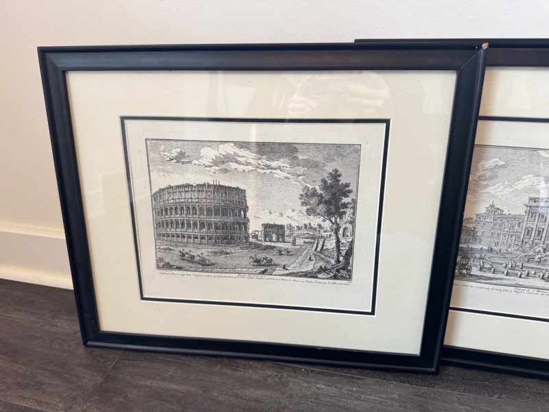 European Prints – Piazza del Colosseo & Chiesa di S. Maria a Trevi. Pair of framed European architectural prints Subjects: Piazza del Colosseo by G. Vasi dis. sc. 33 Chiesa di S. Maria a Trevi Frame size: 22” x 18” each Note: Black frames with noticeable damage (see photos).