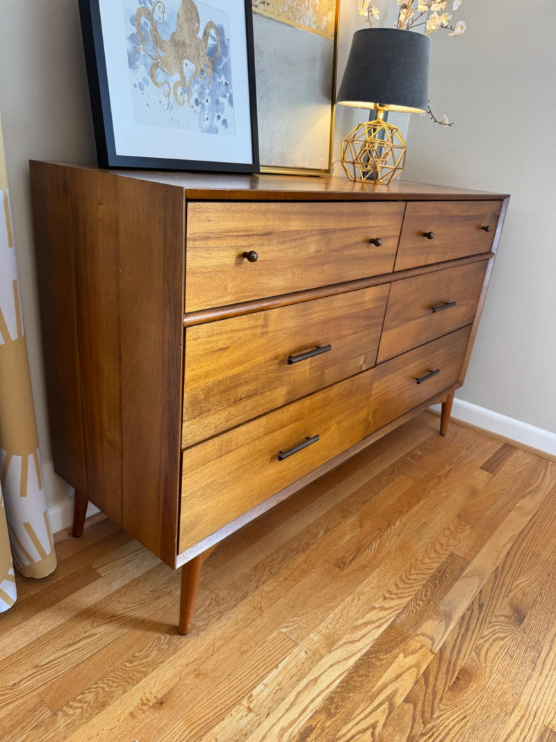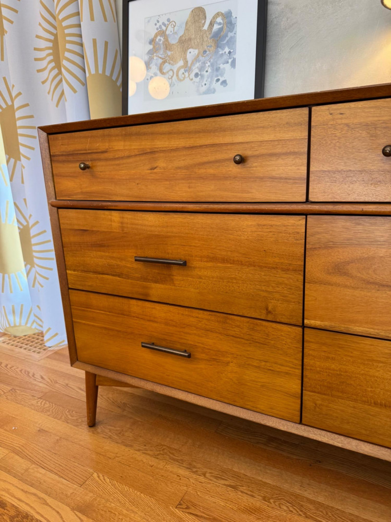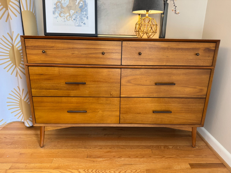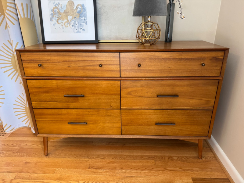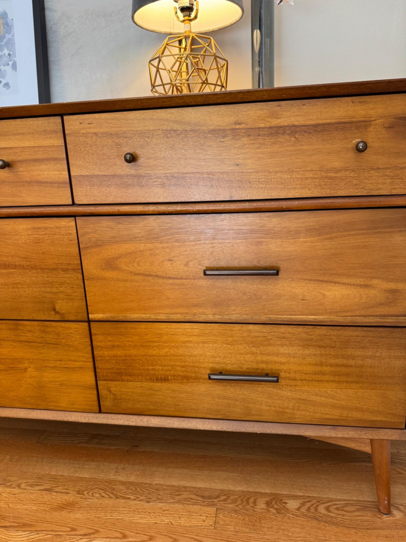 MCM Style 6-Drawer Dresser – Warm Wood Finish w/ Tapered Legs. Bidding on this lot is an agreement that: (1.) You will have at least 2 capable, able bodied persons to lift and load at a minimum. (2.) You will bring a hand truck and/or any other tools needed to remove this item. If these steps are not followed your item will be forfeit and no refund given.
