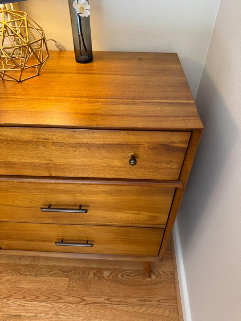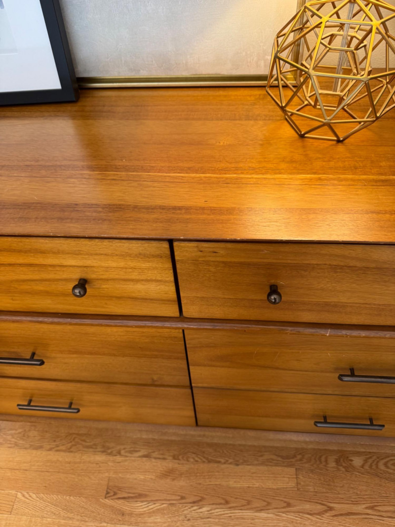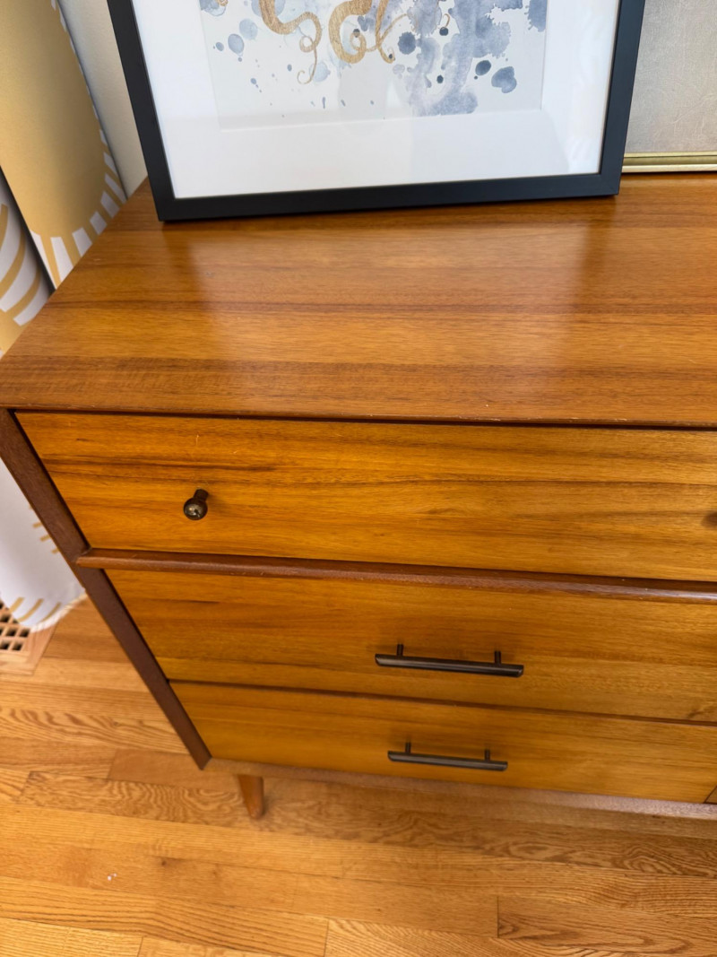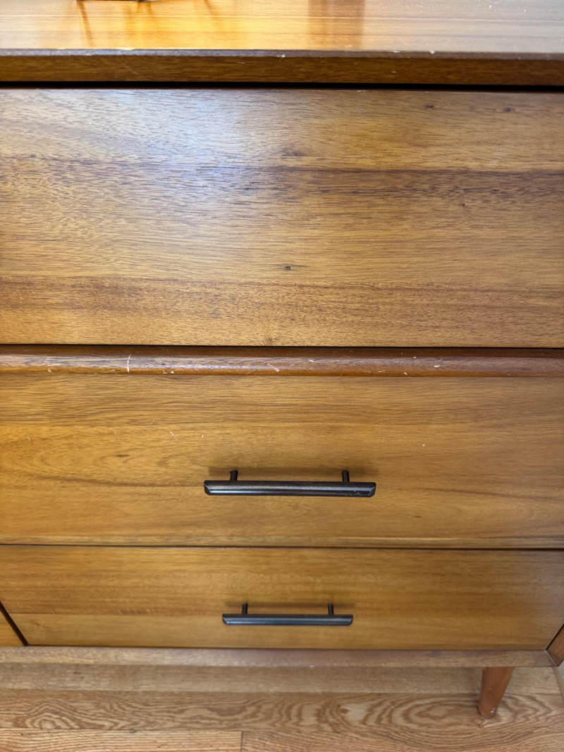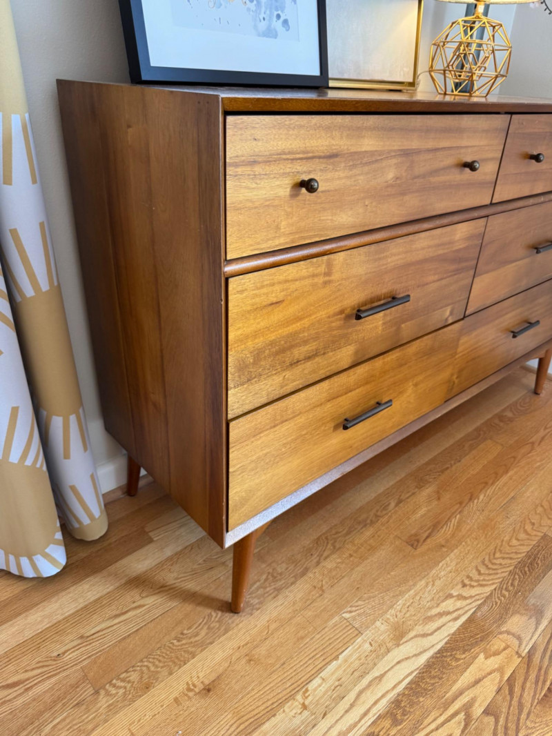 MCM Style 6-Drawer Dresser – Warm Wood Finish w/ Tapered Legs. Bidding on this lot is an agreement that: (1.) You will have at least 2 capable, able bodied persons to lift and load at a minimum. (2.) You will bring a hand truck and/or any other tools needed to remove this item. If these steps are not followed your item will be forfeit and no refund given.