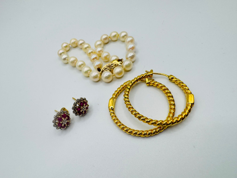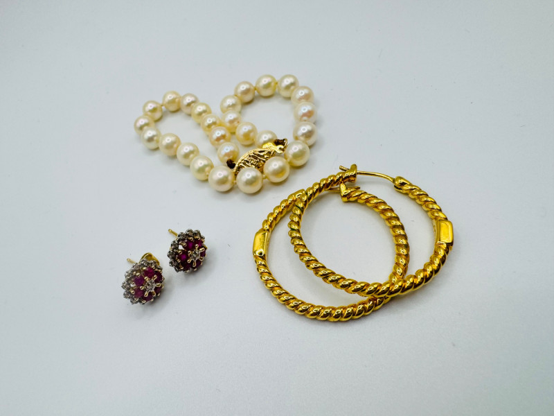 Petite Jewelry Ensemble – 14K Earrings, Pearl Bracelet, & Coach Hoops. Disclaimer: The jewelry in this auction lot has not been tested. By placing a bid, you agree to purchase the item as is, with no guarantees regarding metal quality, content, or purity. Refunds will not be issued on these factors.