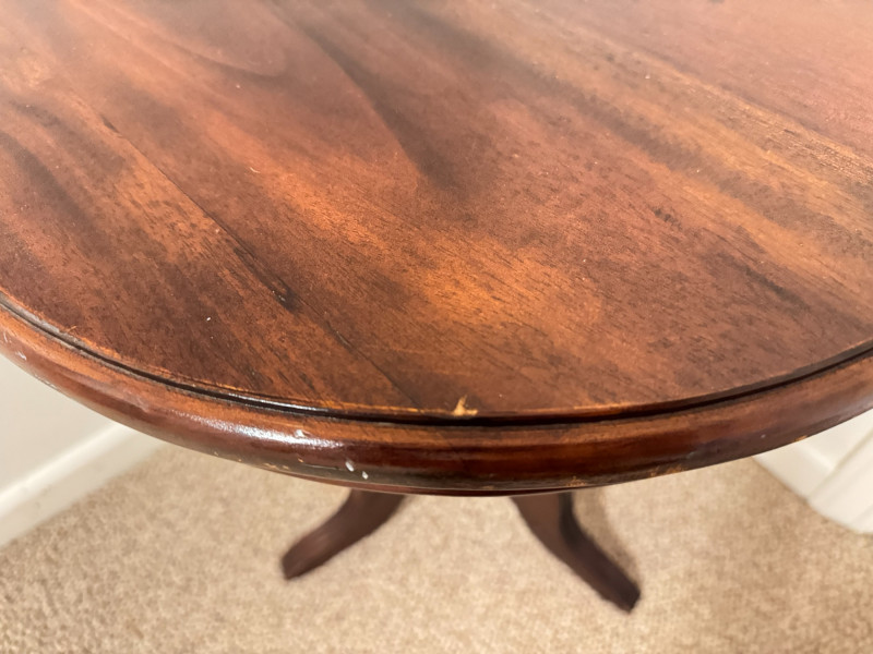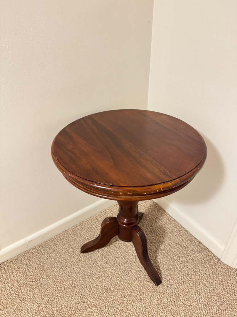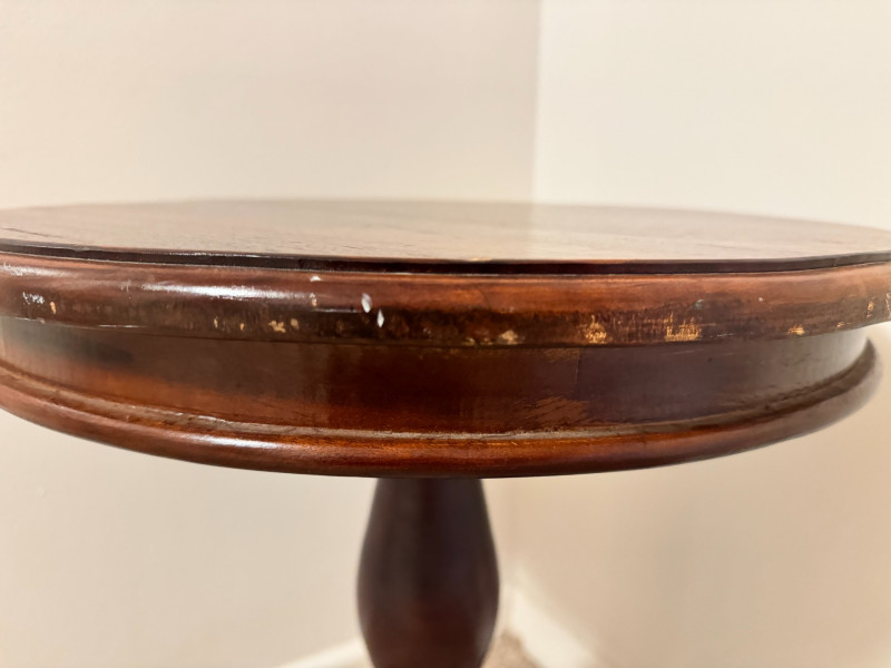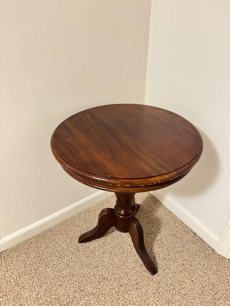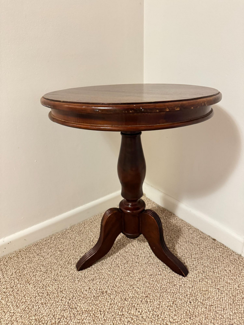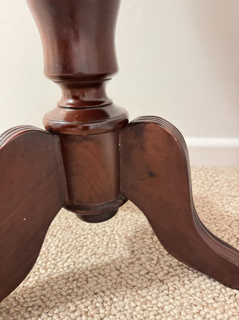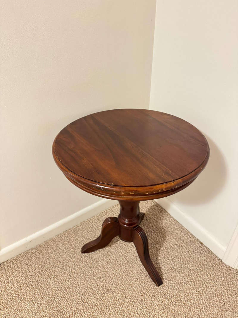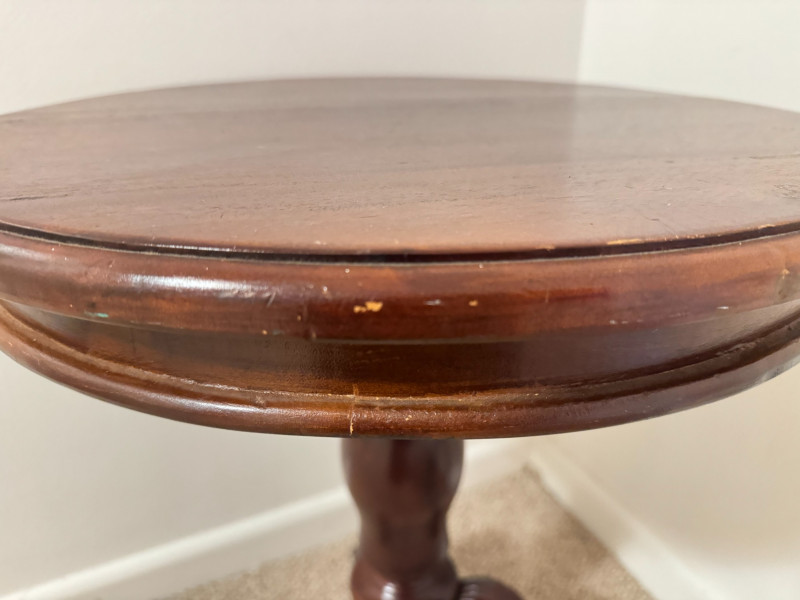 Round Pedestal Side Table – Tripod Base w/ Curved Legs. 20 x 24 scratches on the edges of the table scratches on the legs