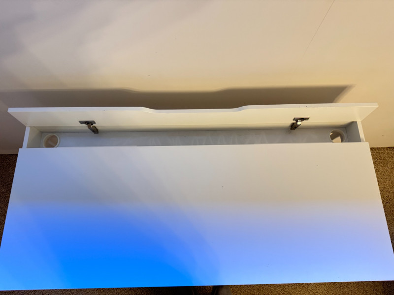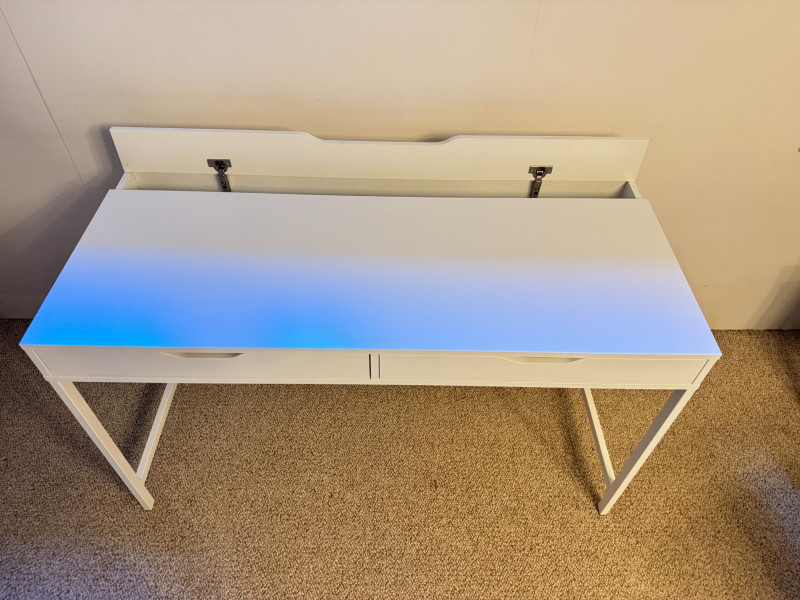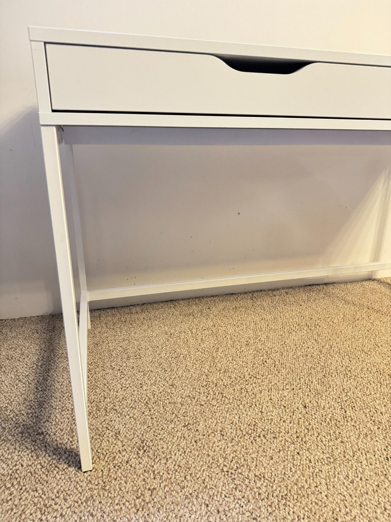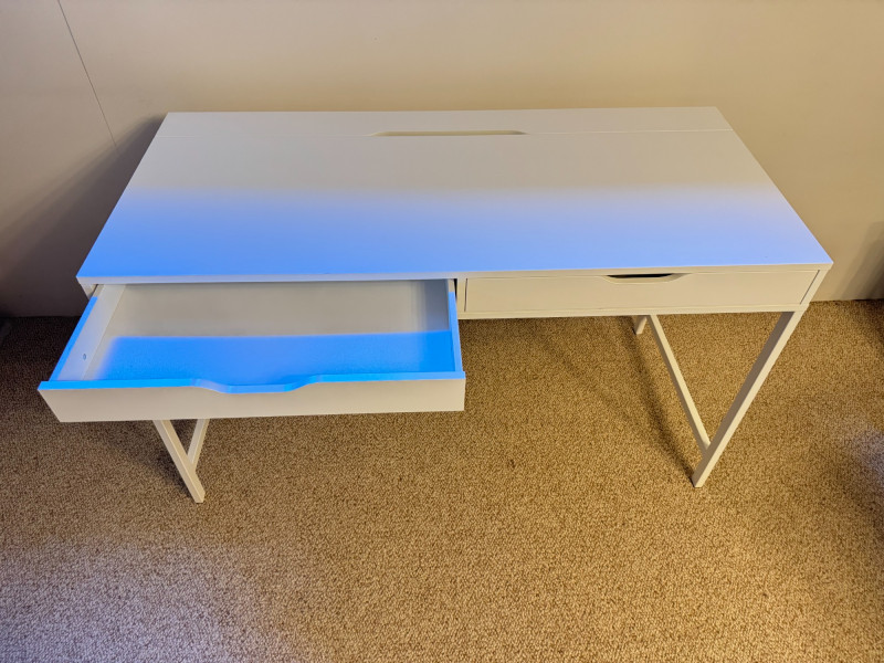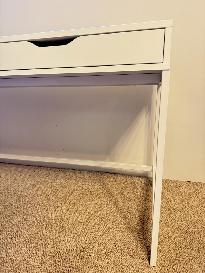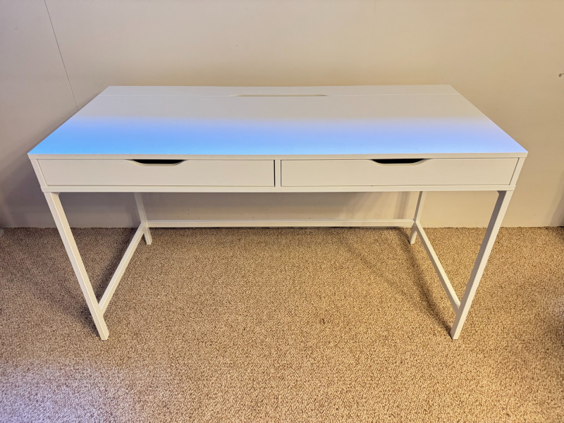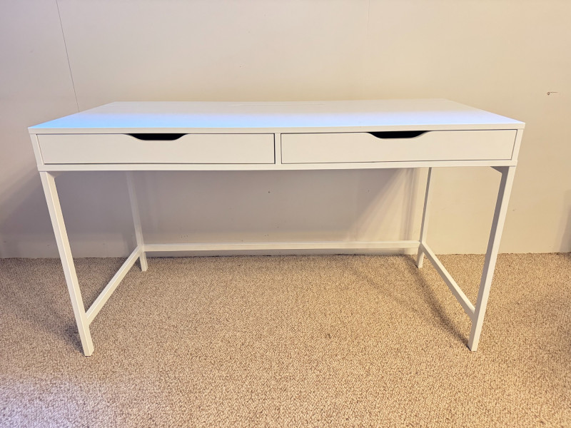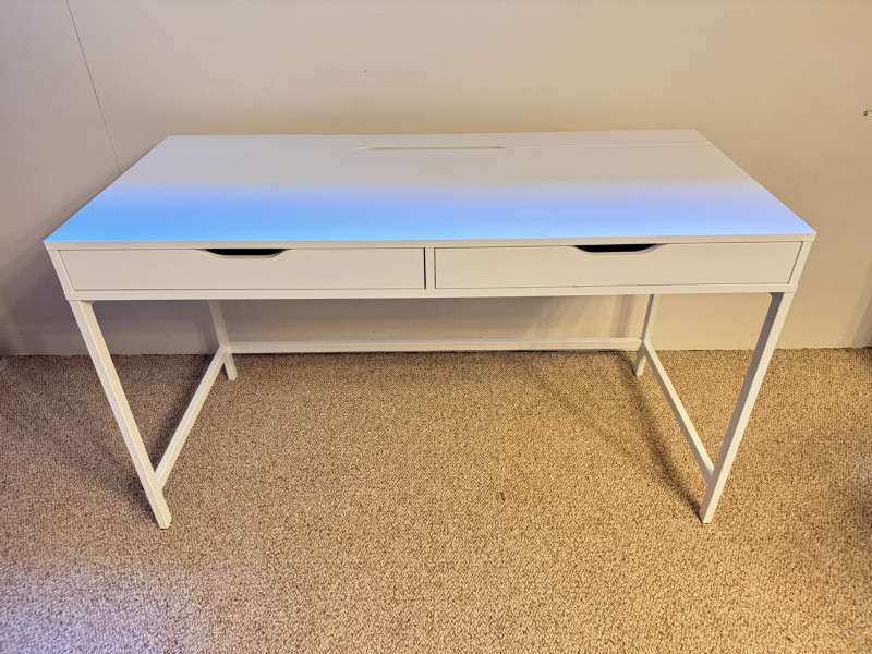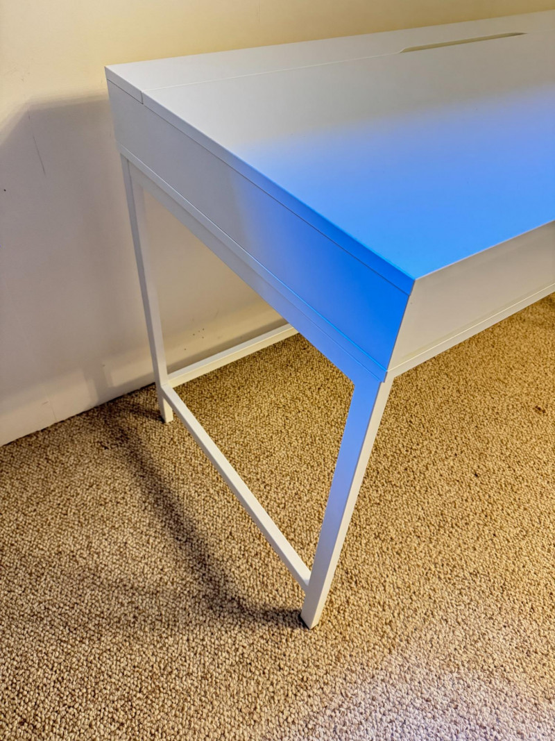 Modern White Writing Desk w/ 2 Drawers & Flip-Top Storage. 52 x 23 3/4 x 30 has some lght scratches, especially on the legs picture shows some blue color but it's fully white