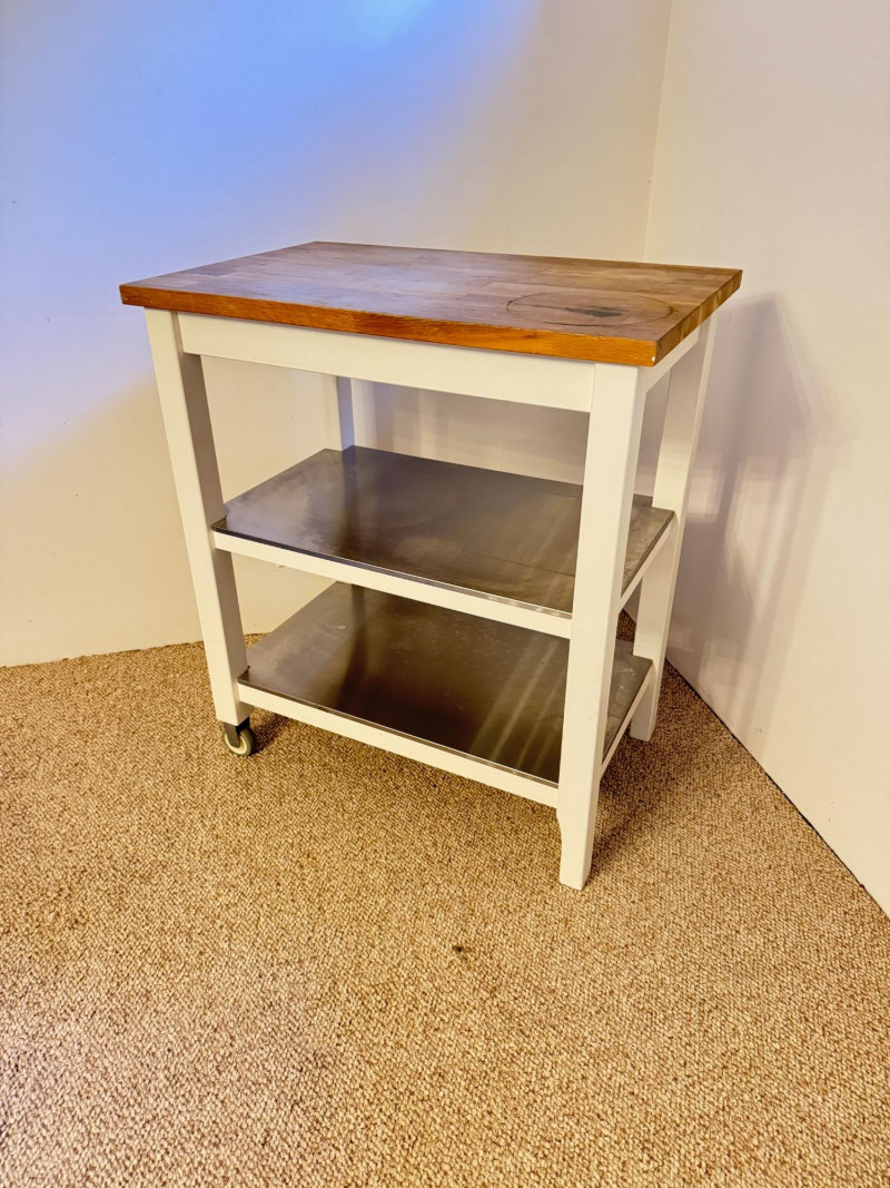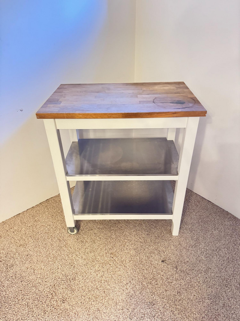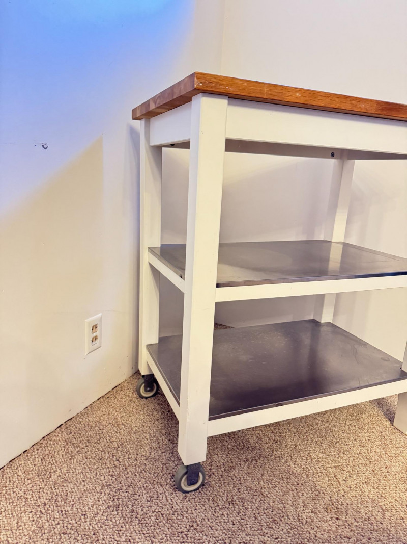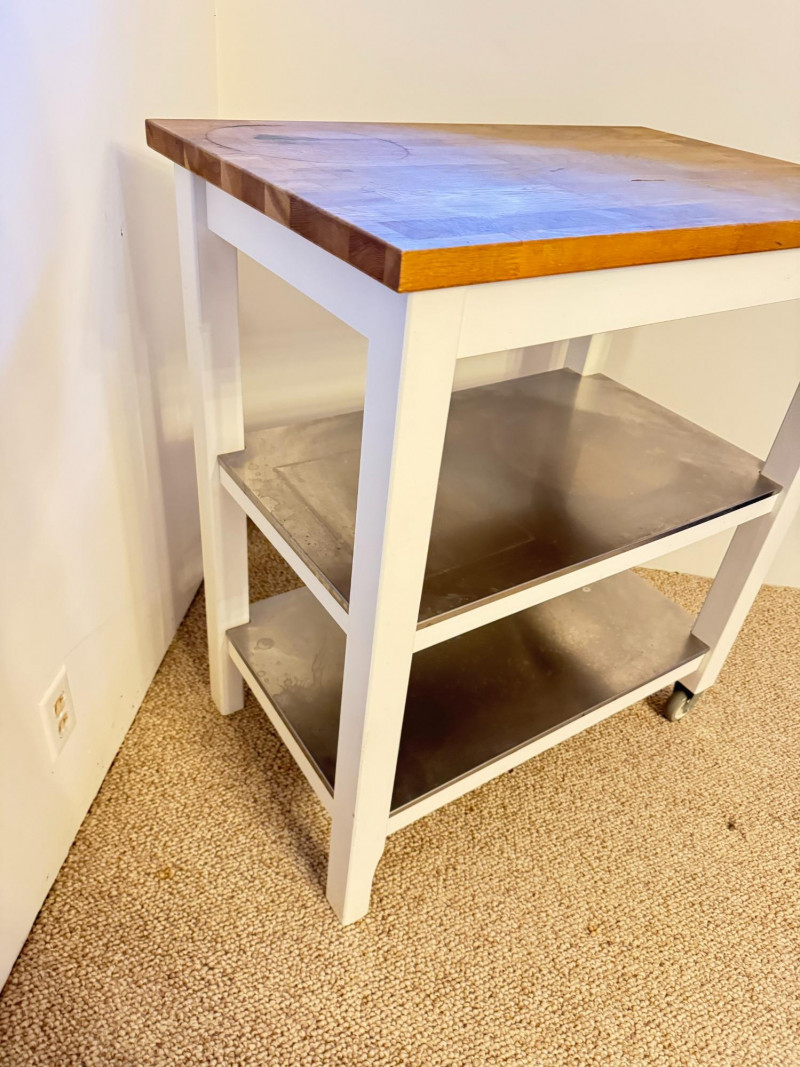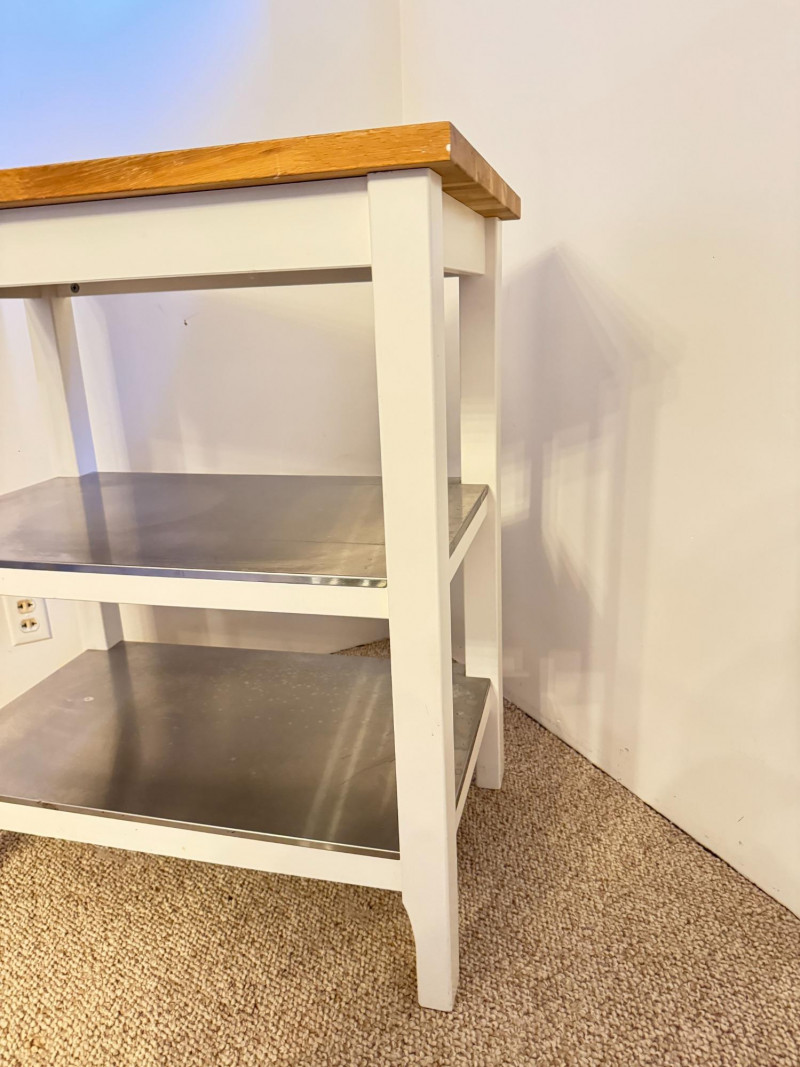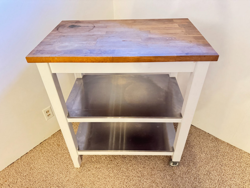 Kitchen Island Cart w/ Butcher Block Top & Metal Shelves. Condition: surface rings and scratches present