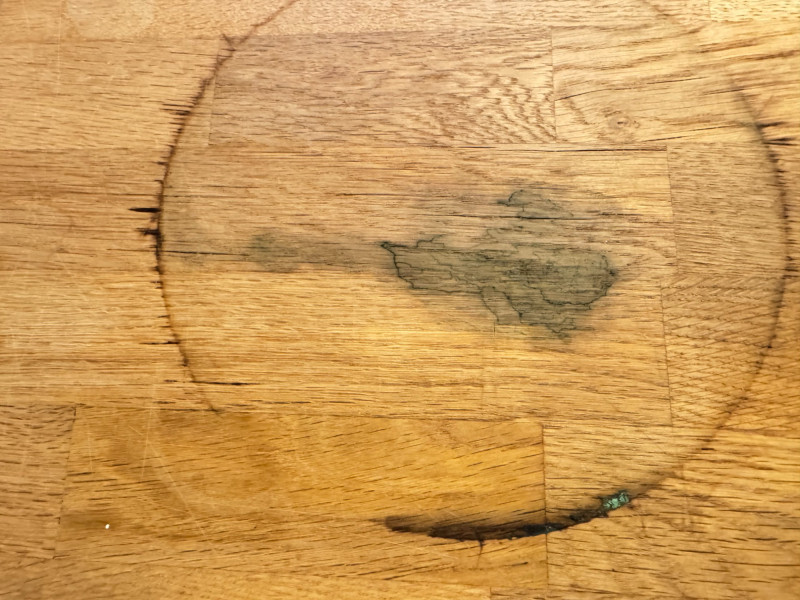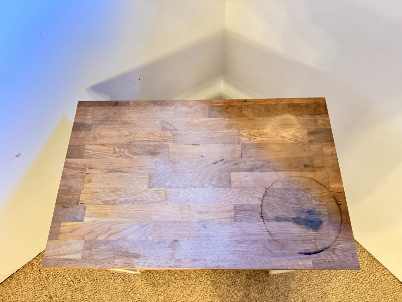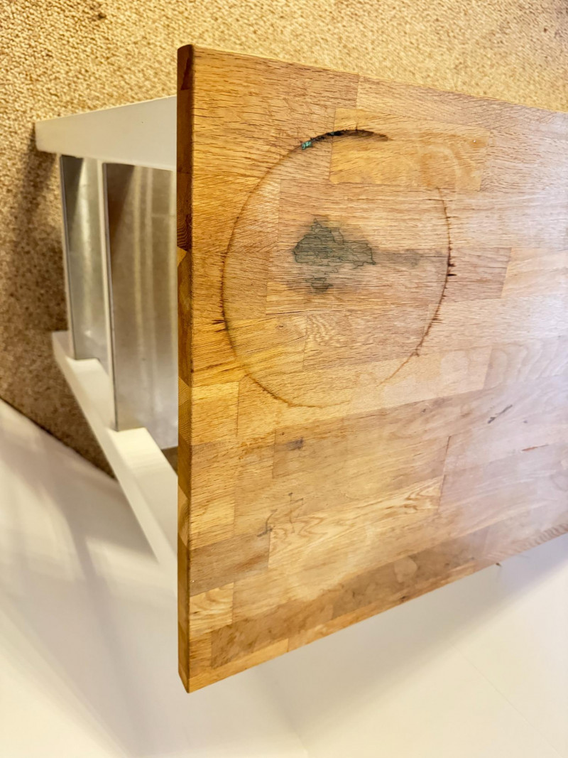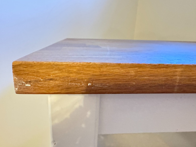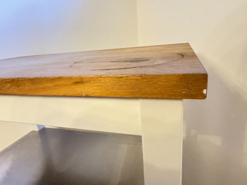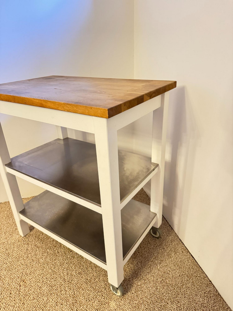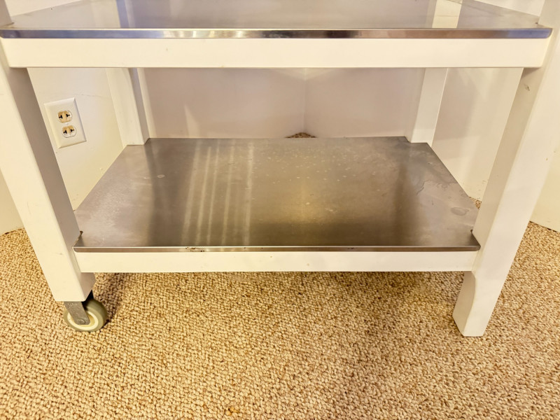 Kitchen Island Cart w/ Butcher Block Top & Metal Shelves. Condition: surface rings and scratches present