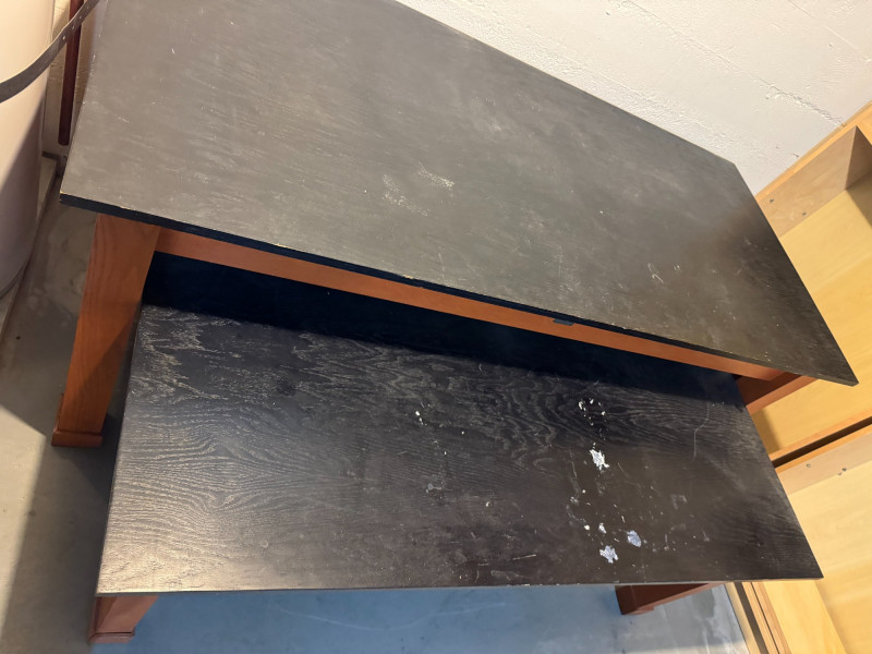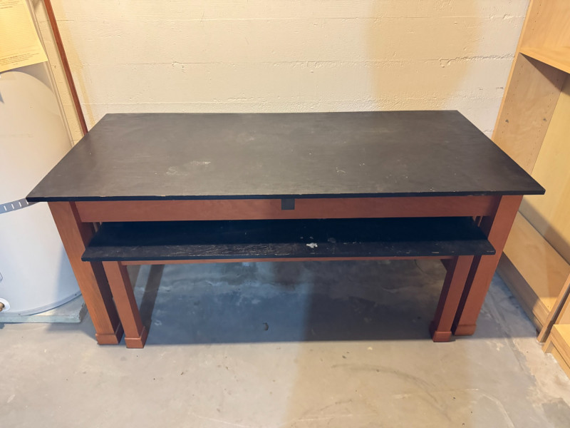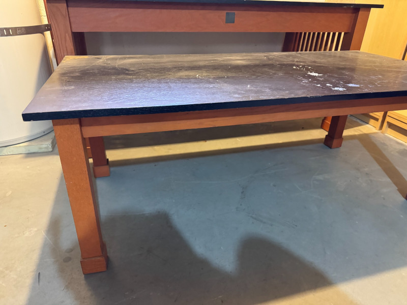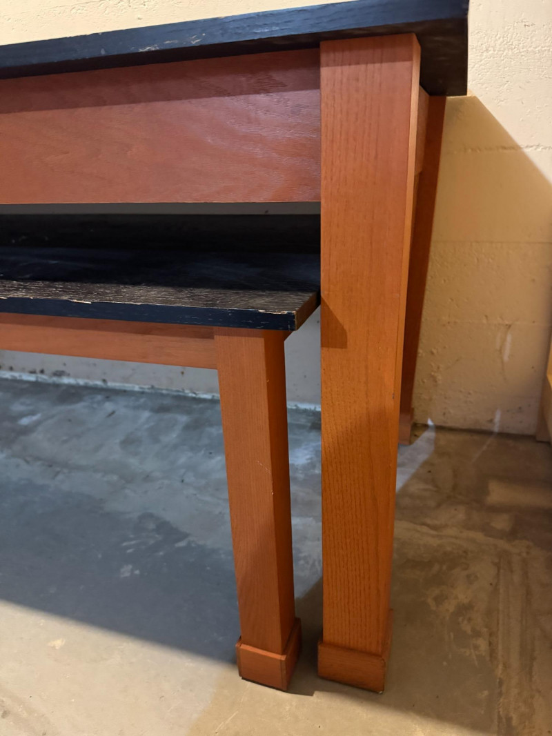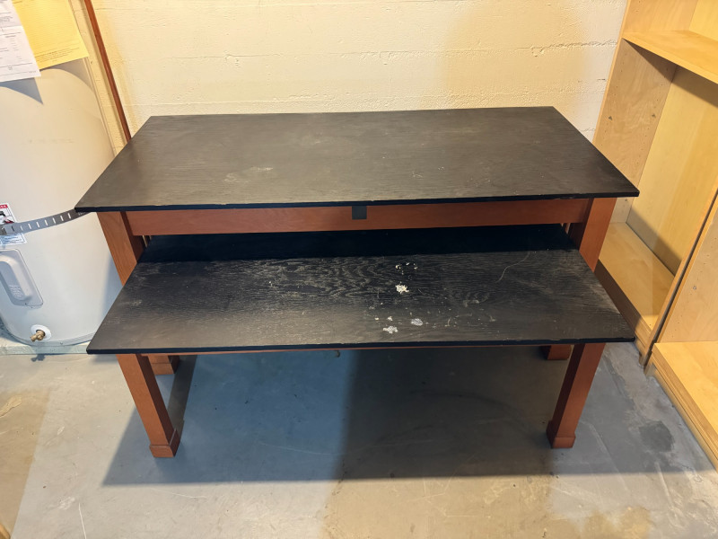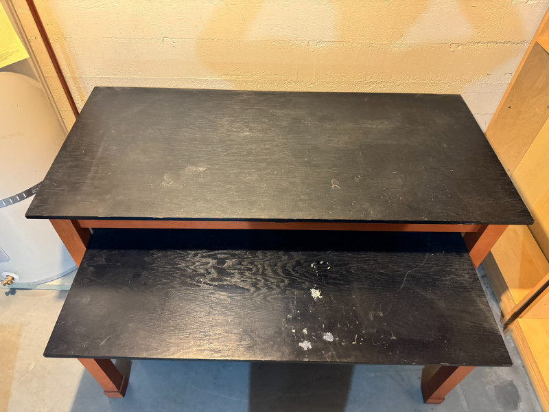 Cutter & Buck Wood Table & Bench Set w/ Black Tops. Used condition; cosmetic marks, see photos. Large table: 68 x 31 x 30 Small table: 58 x 28 x 21 Pretty beat up