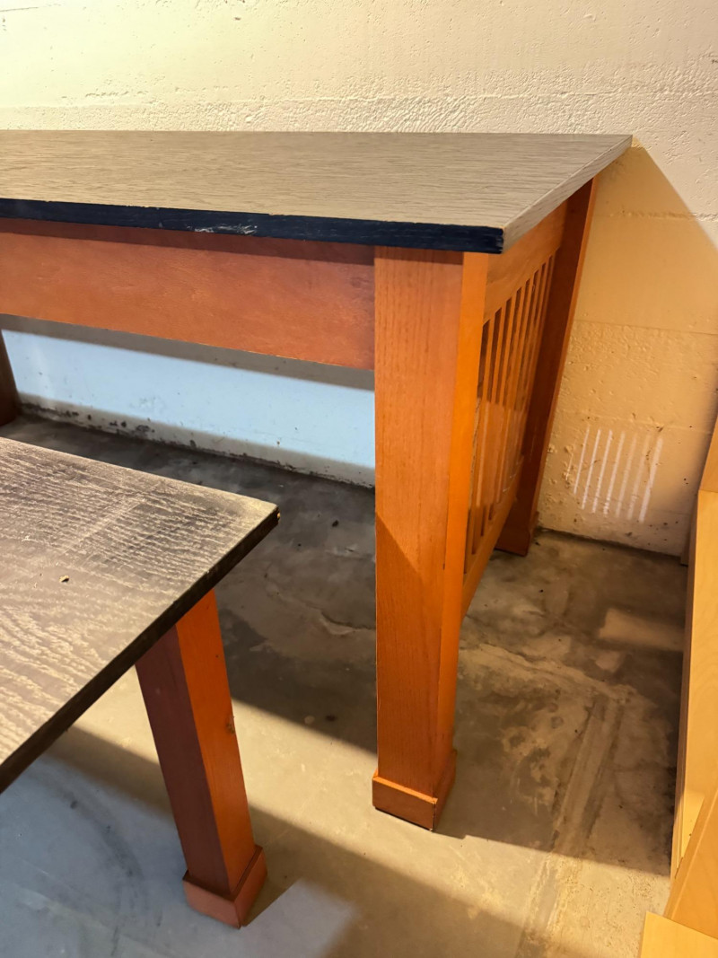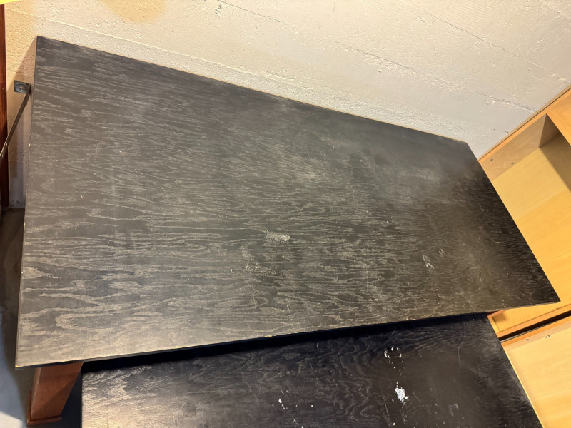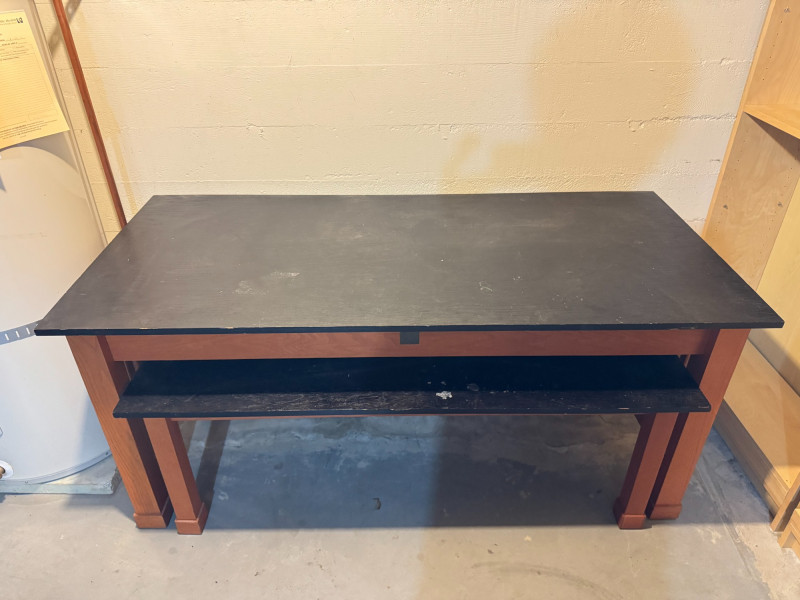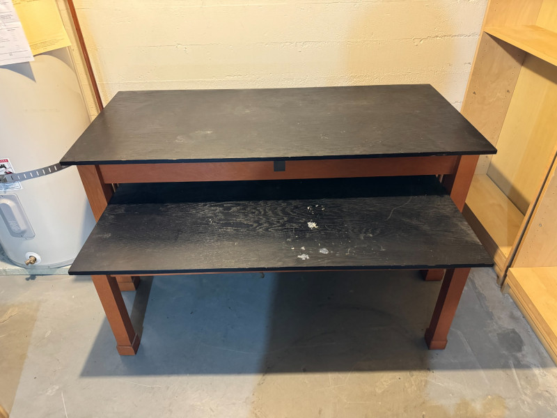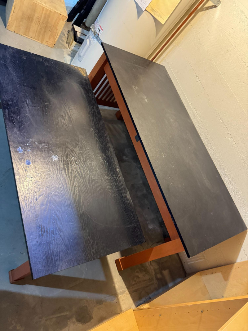 Cutter & Buck Wood Table & Bench Set w/ Black Tops. Used condition; cosmetic marks, see photos. Large table: 68 x 31 x 30 Small table: 58 x 28 x 21 Pretty beat up