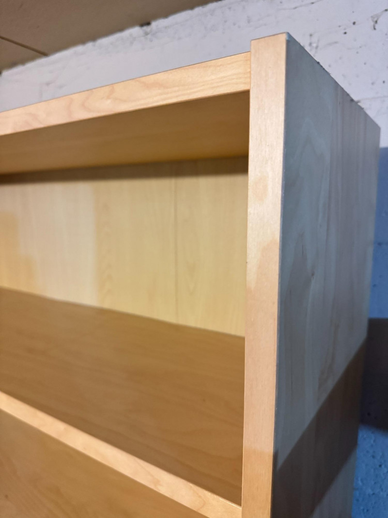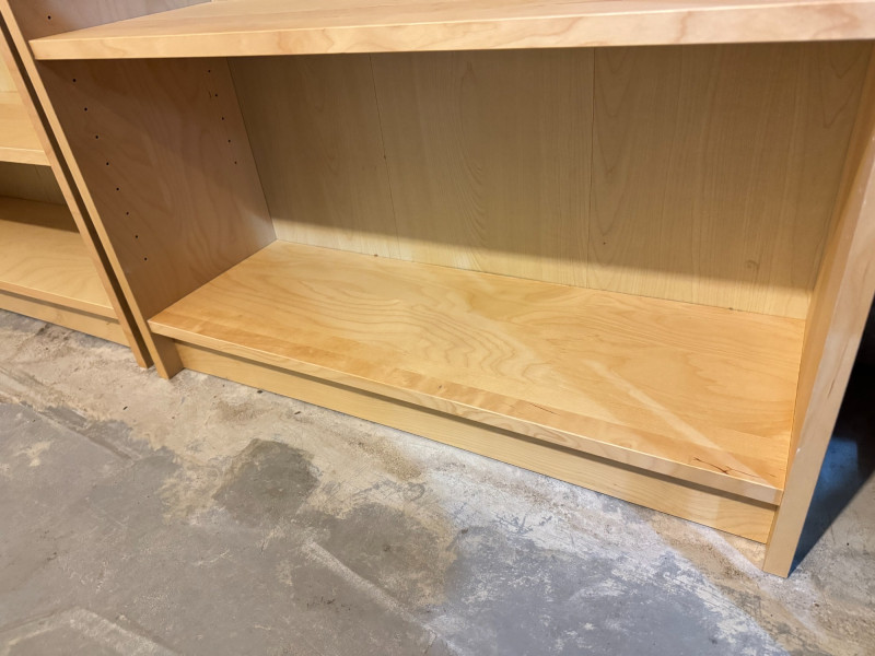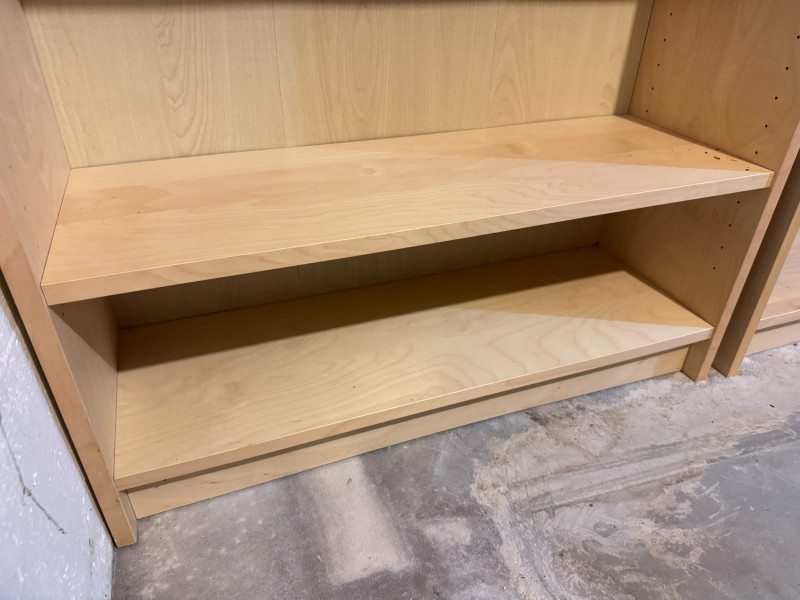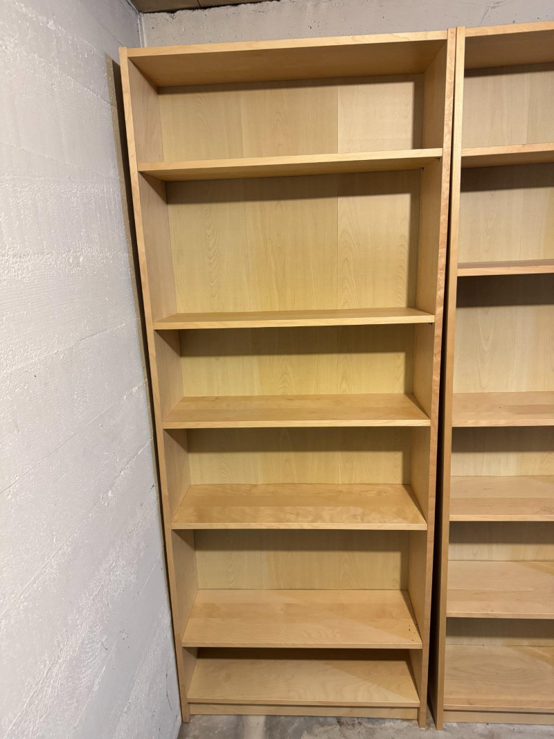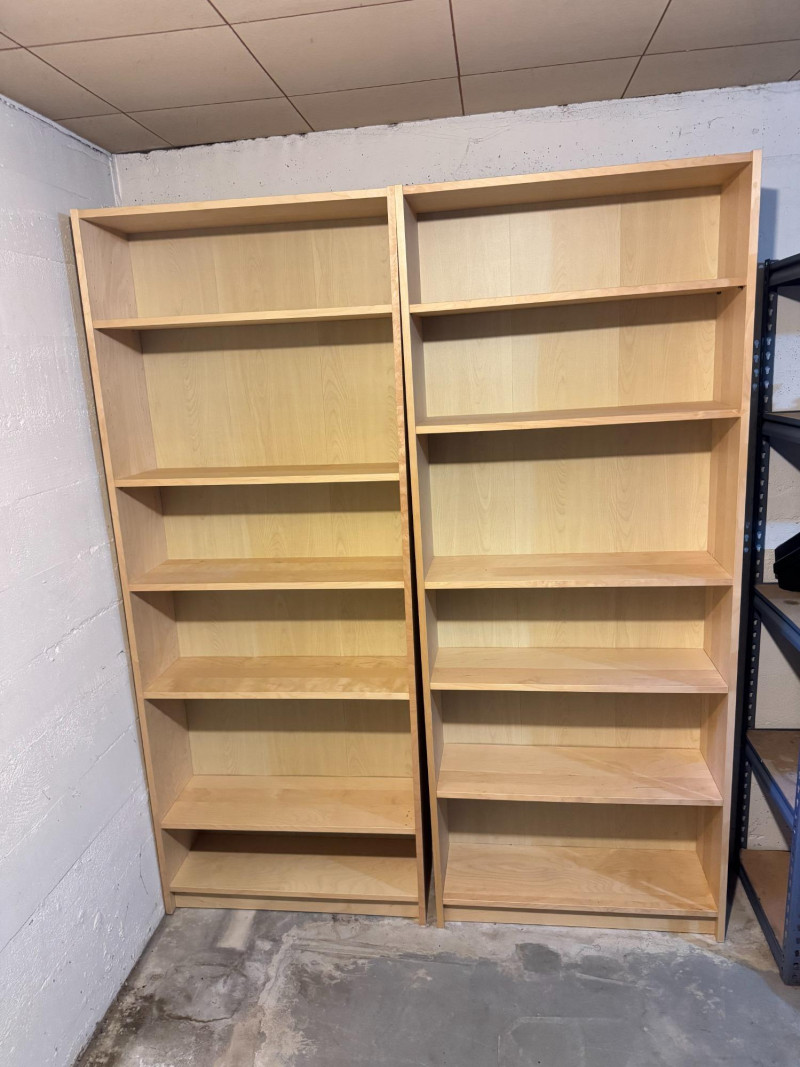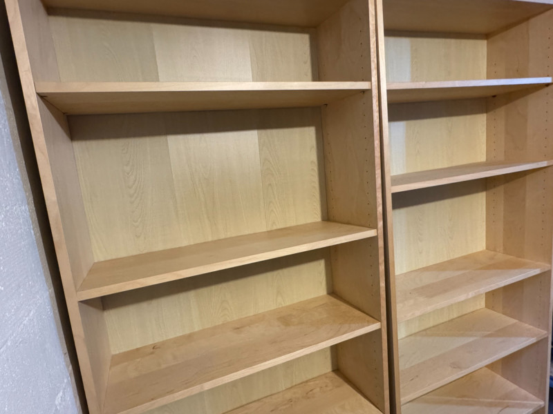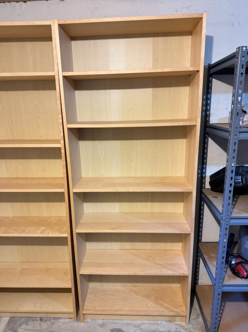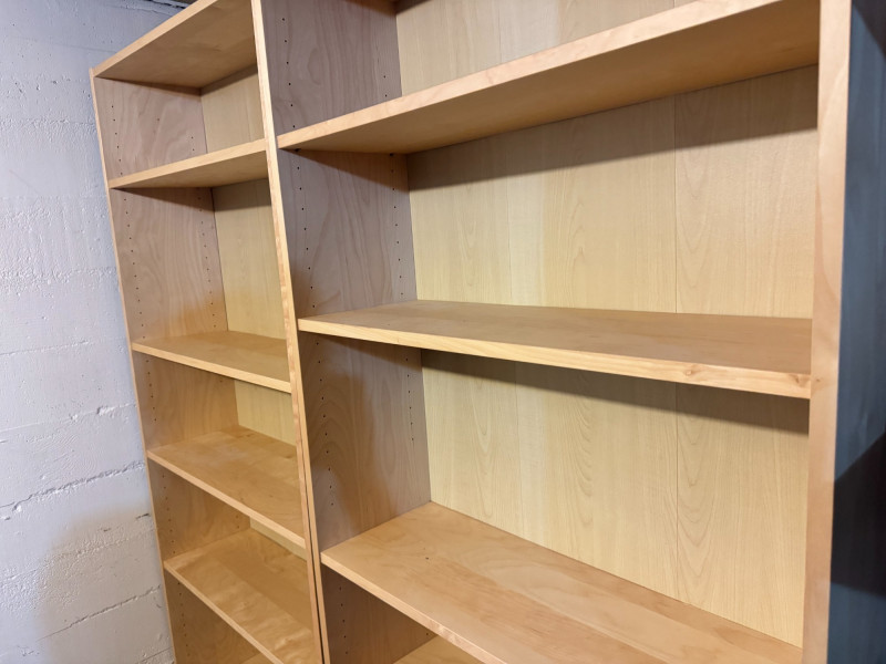 Pair of Tall Wood Bookcases w/ Adjustable Shelves – Light Wood Finish. 31 1/2 x 11 x 79 1/2 Bidding on this lot is an agreement that: (1.) You will have at least 2 capable, able bodied persons to lift and load at a minimum. (2.) You will bring a hand truck and/or any other tools needed to remove this item. If these steps are not followed your item will be forfeit and no refund given.