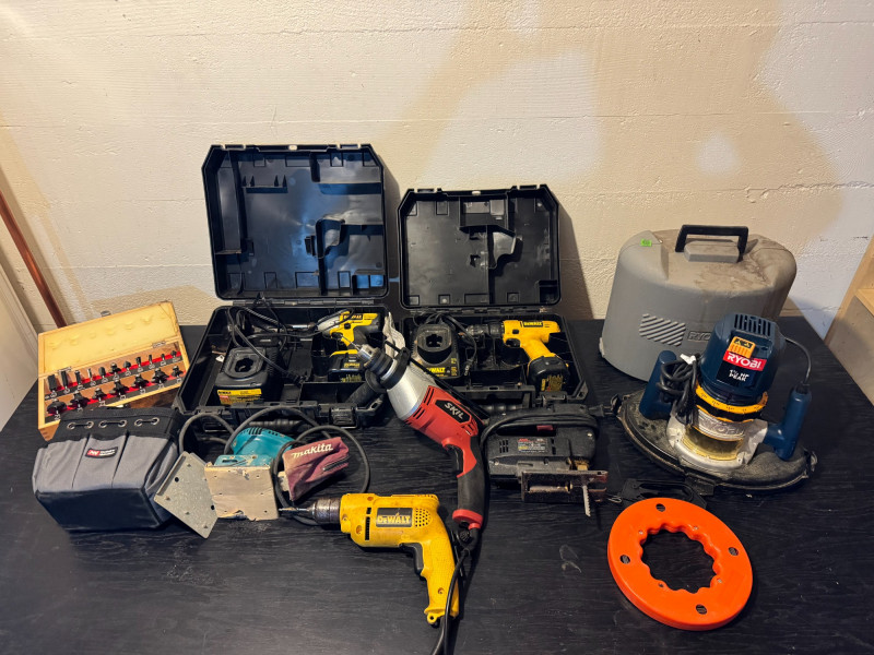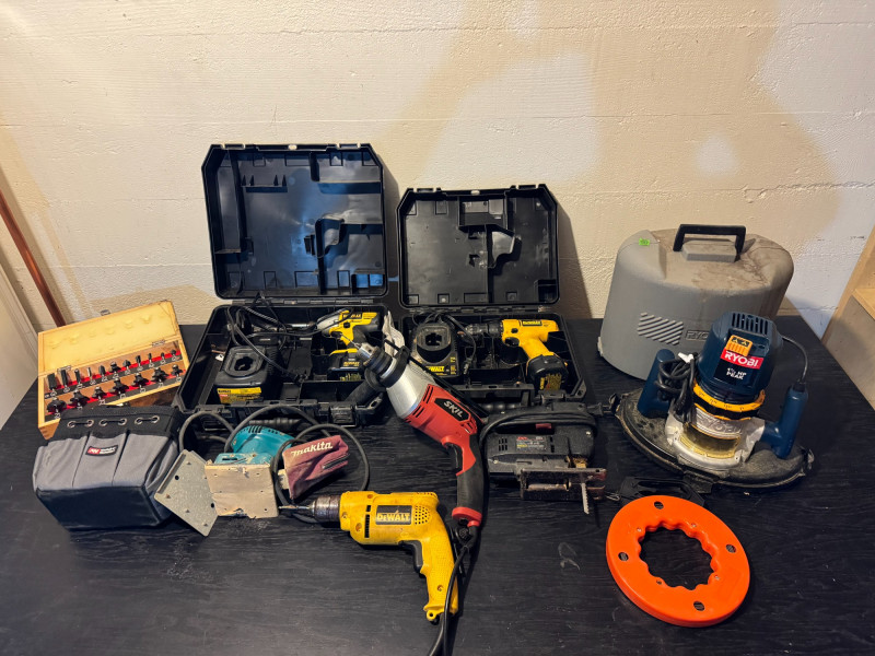 Lot of Power Tools – DeWalt, Ryobi, Skil, Makita, Assorted Router Bits.