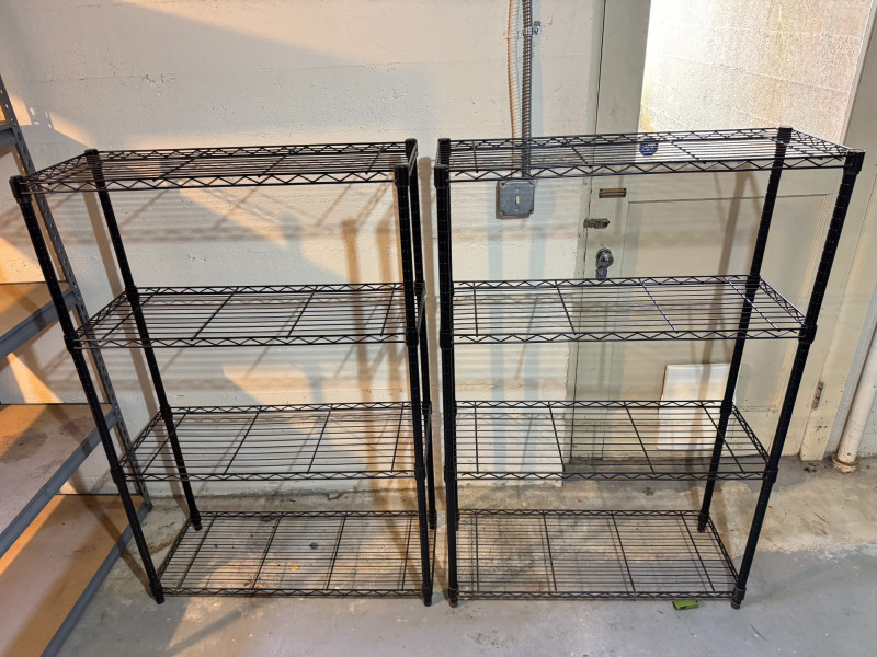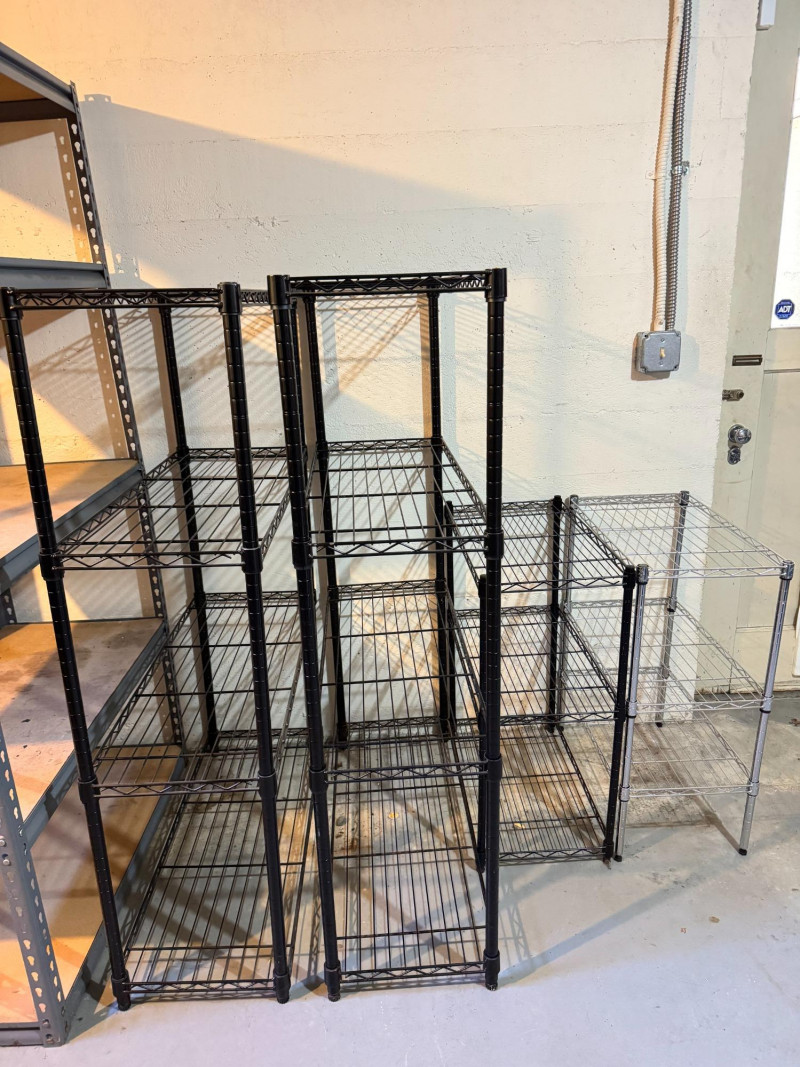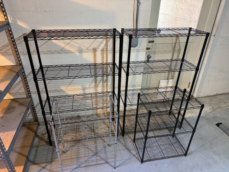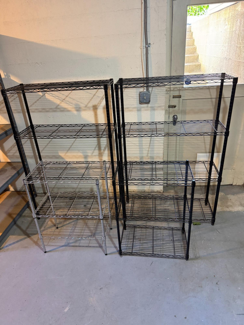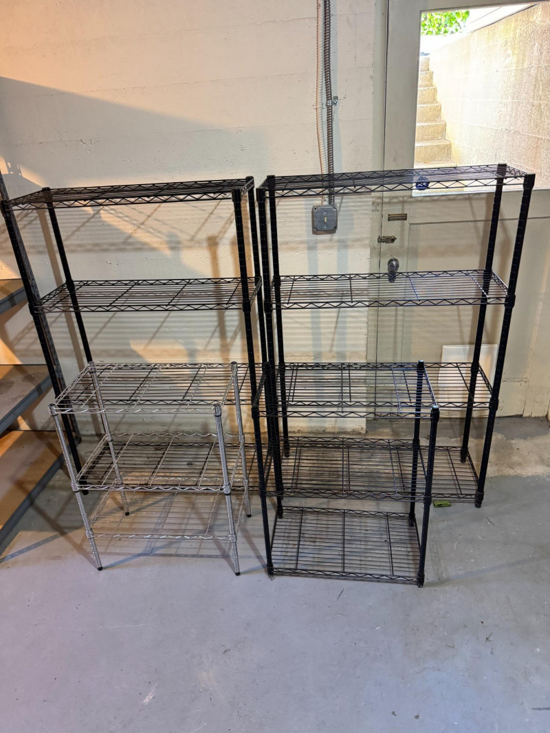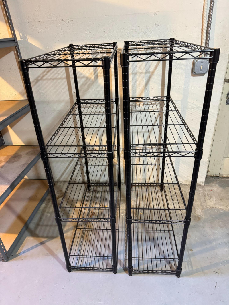 Set of 4 Multi Tier Metal Wire Storage Racks – 2 Tall Black, 2 Small. Tall Shelves: 35 1/2 x 14 x 54 Small shleves: 23 x 13 x 30