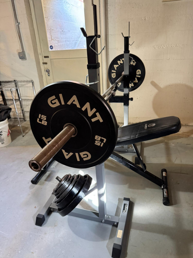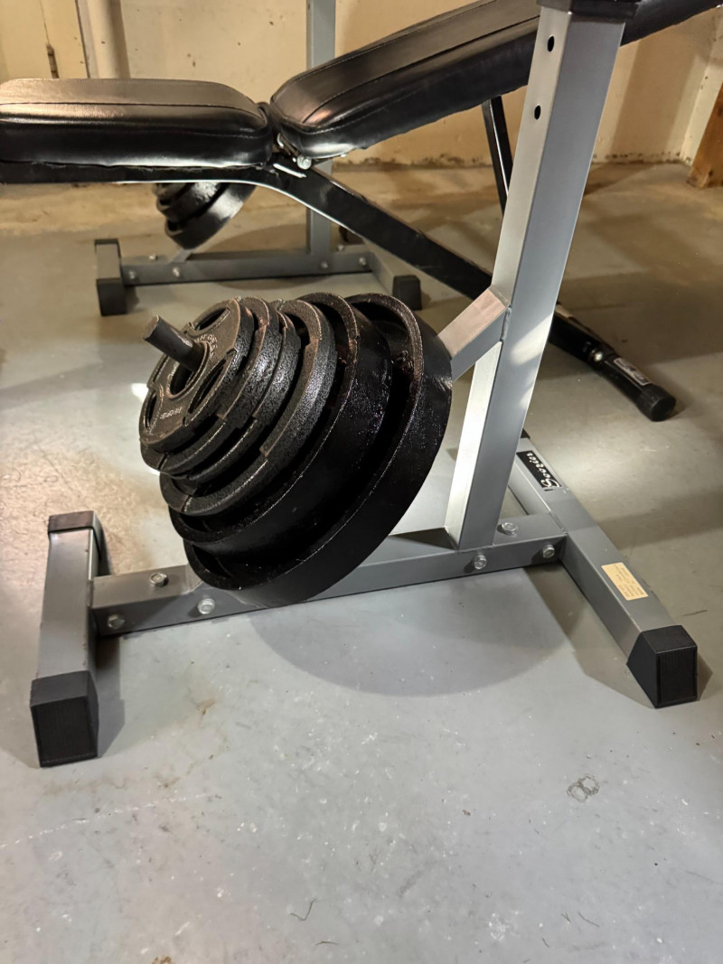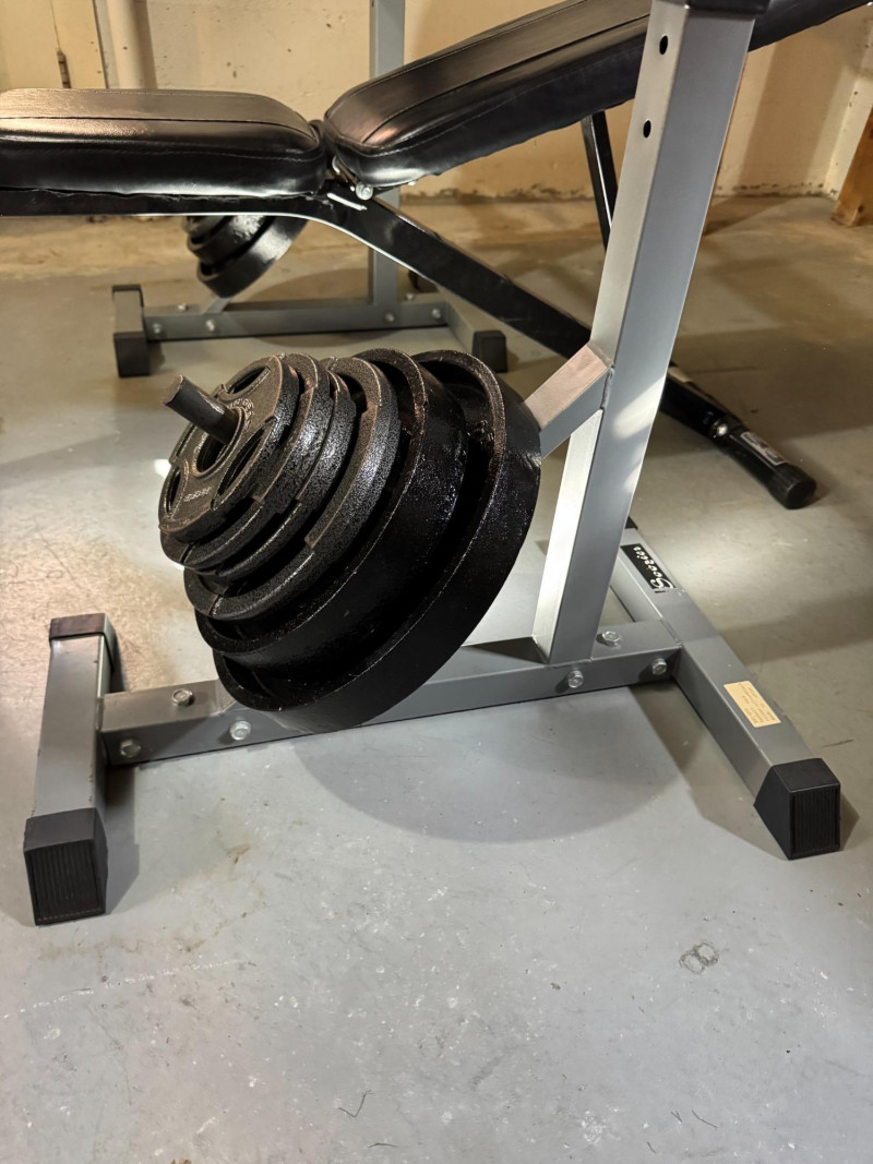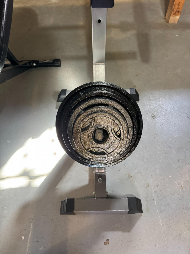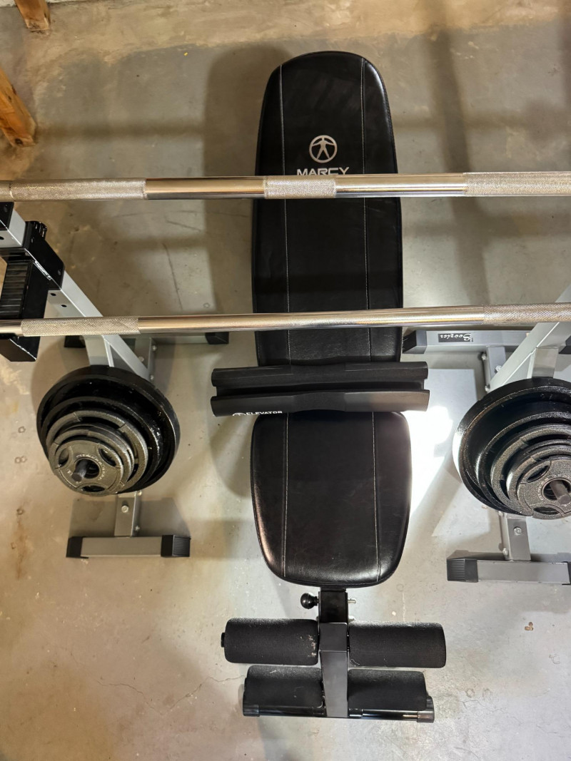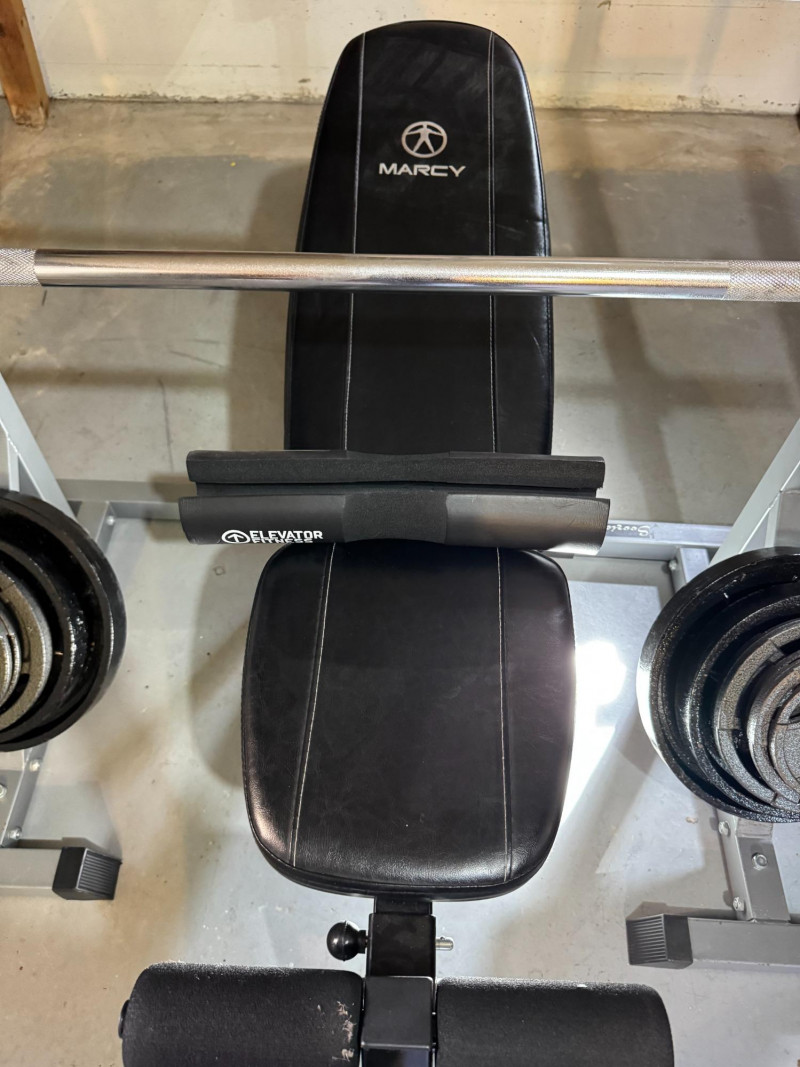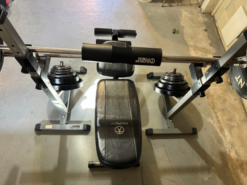 Marcy Weight Bench w/ Barbell, GIANT Plates & Accessories. 2 x barbells weights from 2.5lb to 35lb