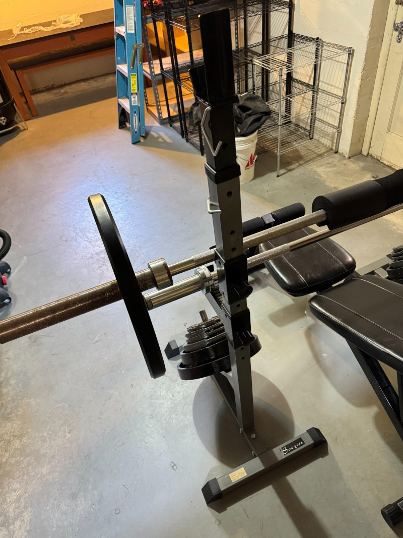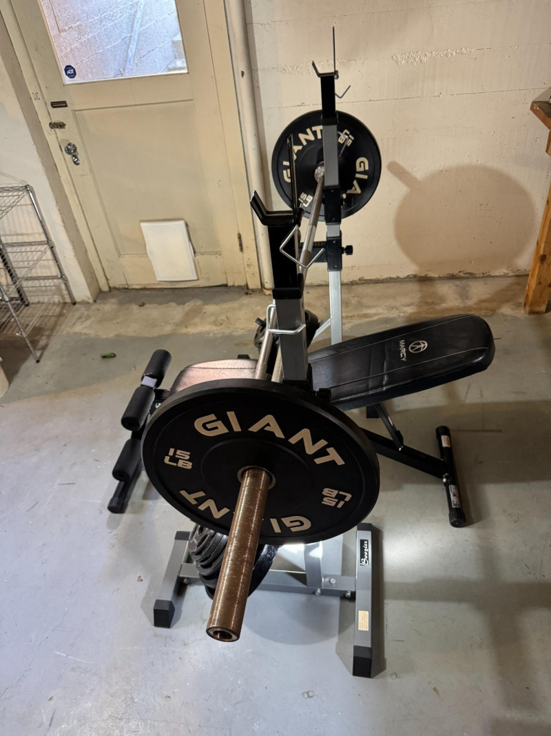 Lot # 102 - Marcy Weight Bench w/ Barbell, GIANT Plates & Accessories