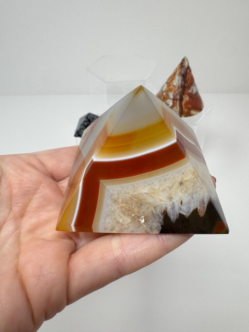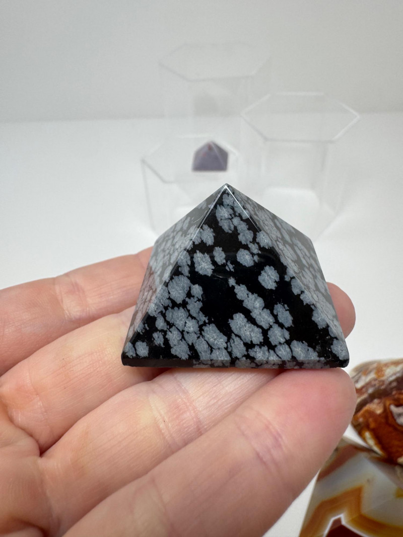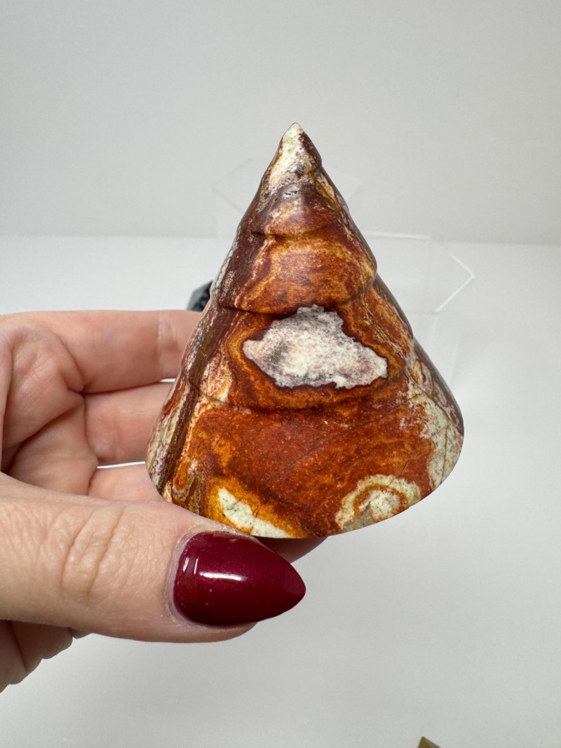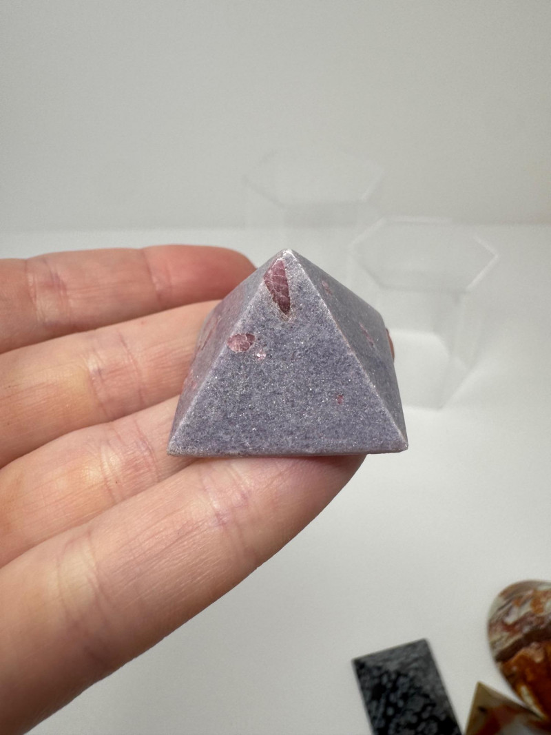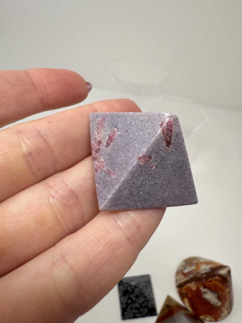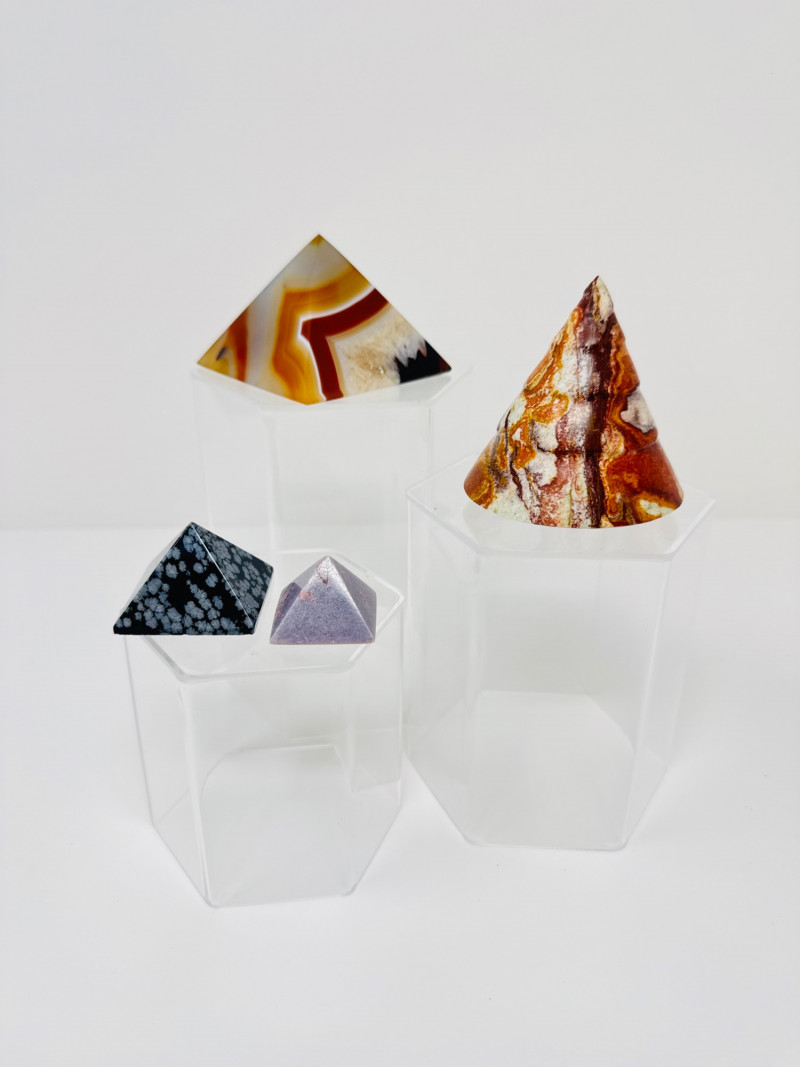 Stone Pyramids & Cones – Agate, Jasper, Snowflake, Lepidolite. Disclaimer: Stones and minerals are not tested for authenticity, origin, or treatment. Offered as-is from visual assessment only. No refunds based on identification or quality.
