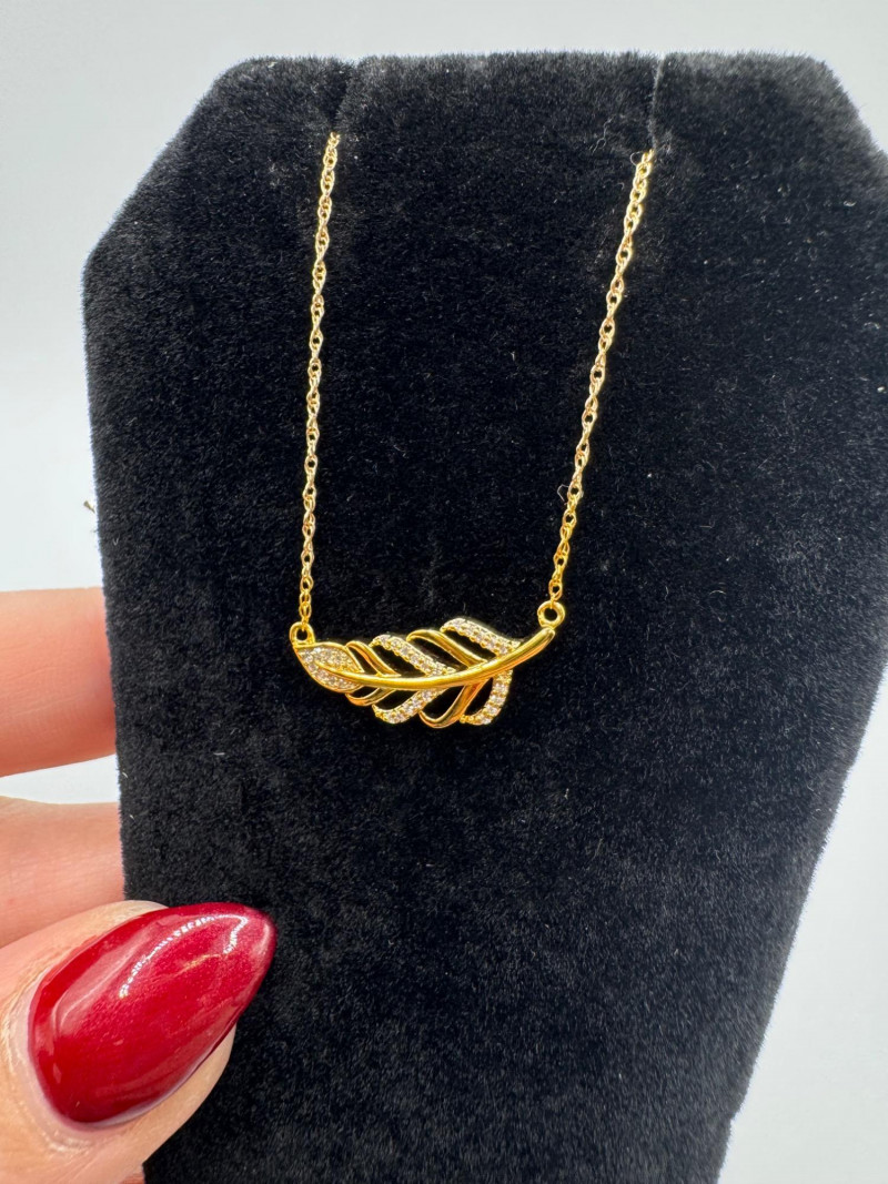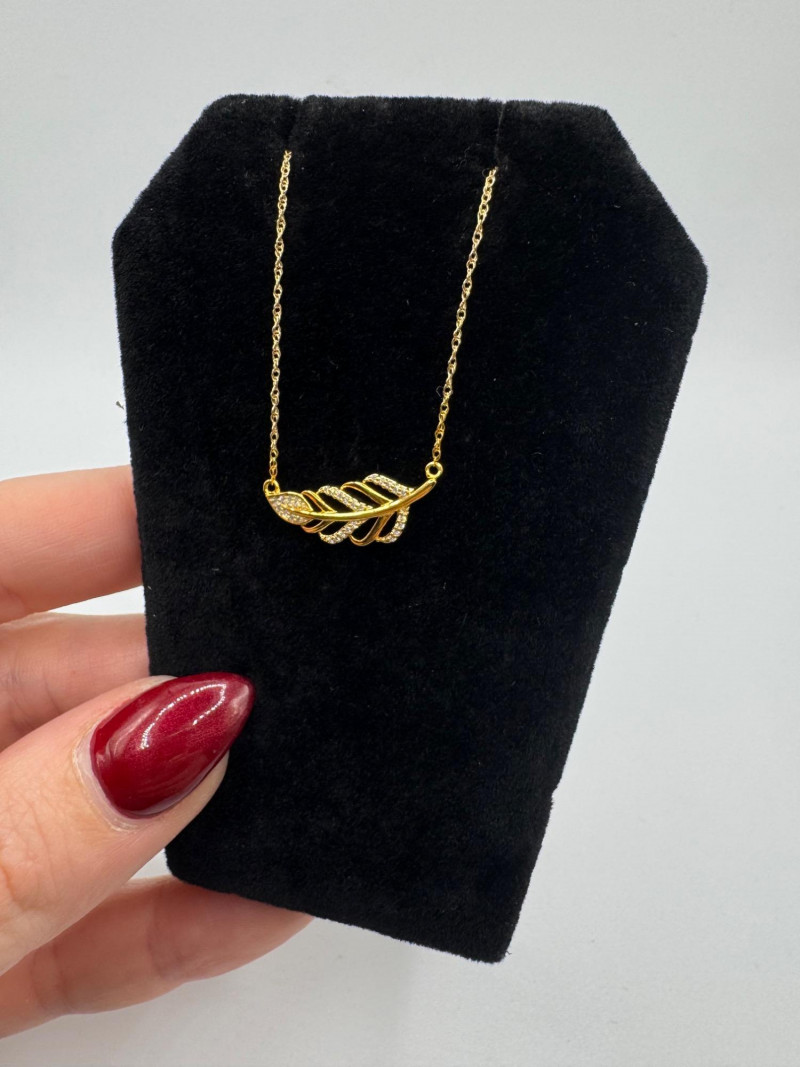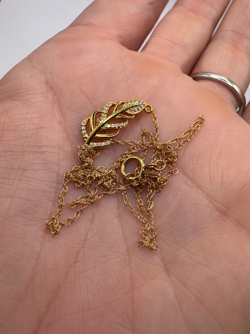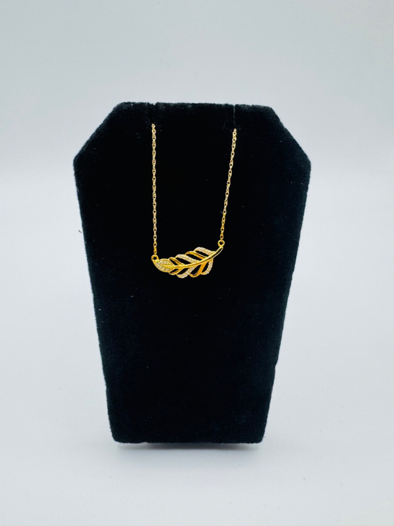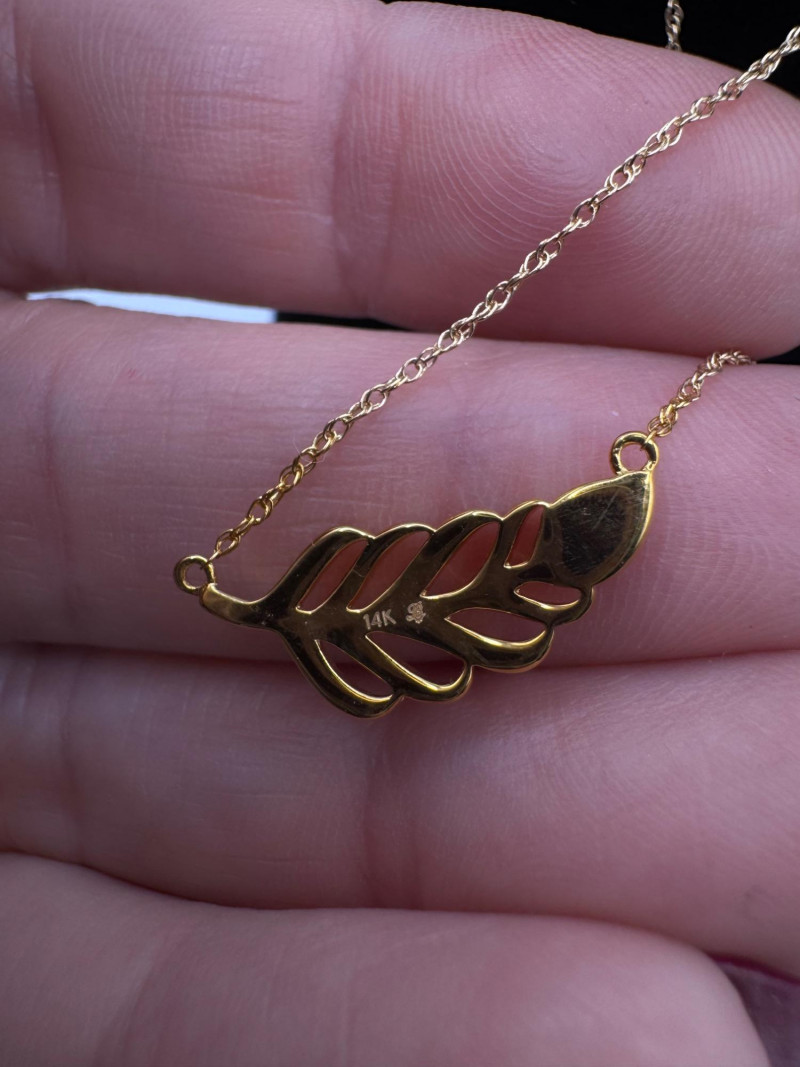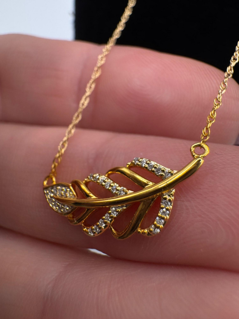 14K Gold Leaf Pendant Necklace w/ Diamonds – 1.85g. Disclaimer: The jewelry in this auction lot has not been tested. By placing a bid, you agree to purchase the item as is, with no guarantees regarding metal quality, content, or purity. Refunds will not be issued on these factors.
