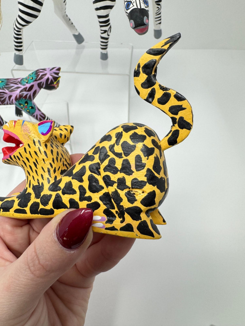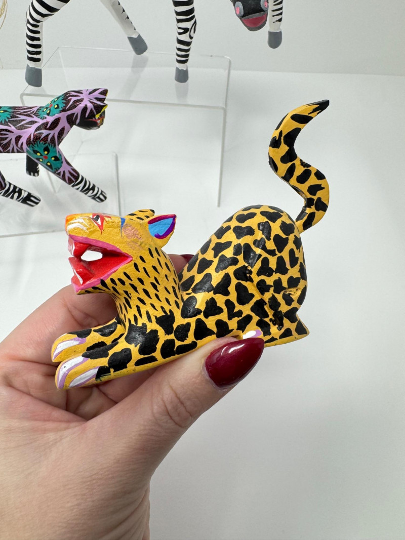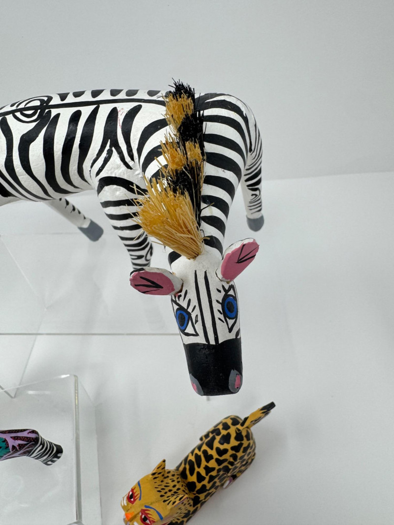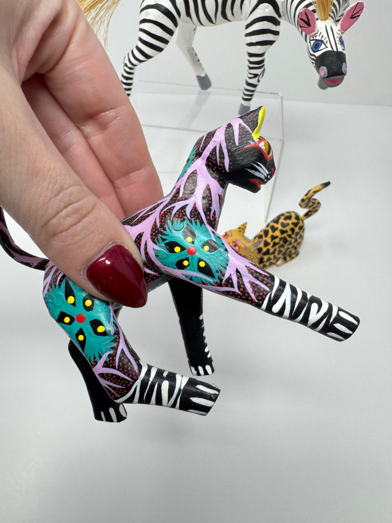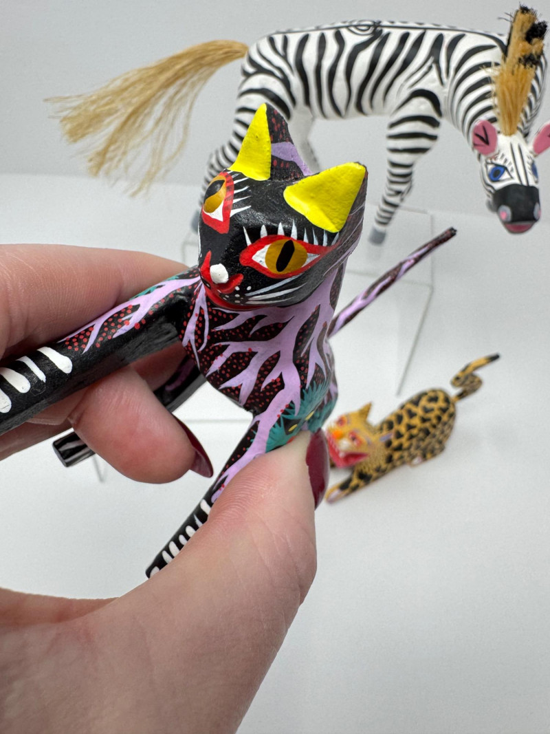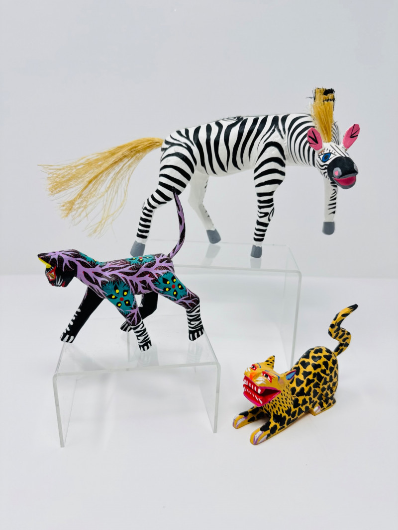 Zebra, Jaguar & Cat Oaxacan Alebrije Carvings – Signed by Artists. Lot of 3 hand-carved Oaxacan wood alebrijes, 3.5”–7” tall Includes: