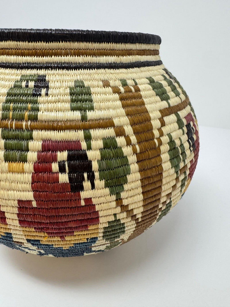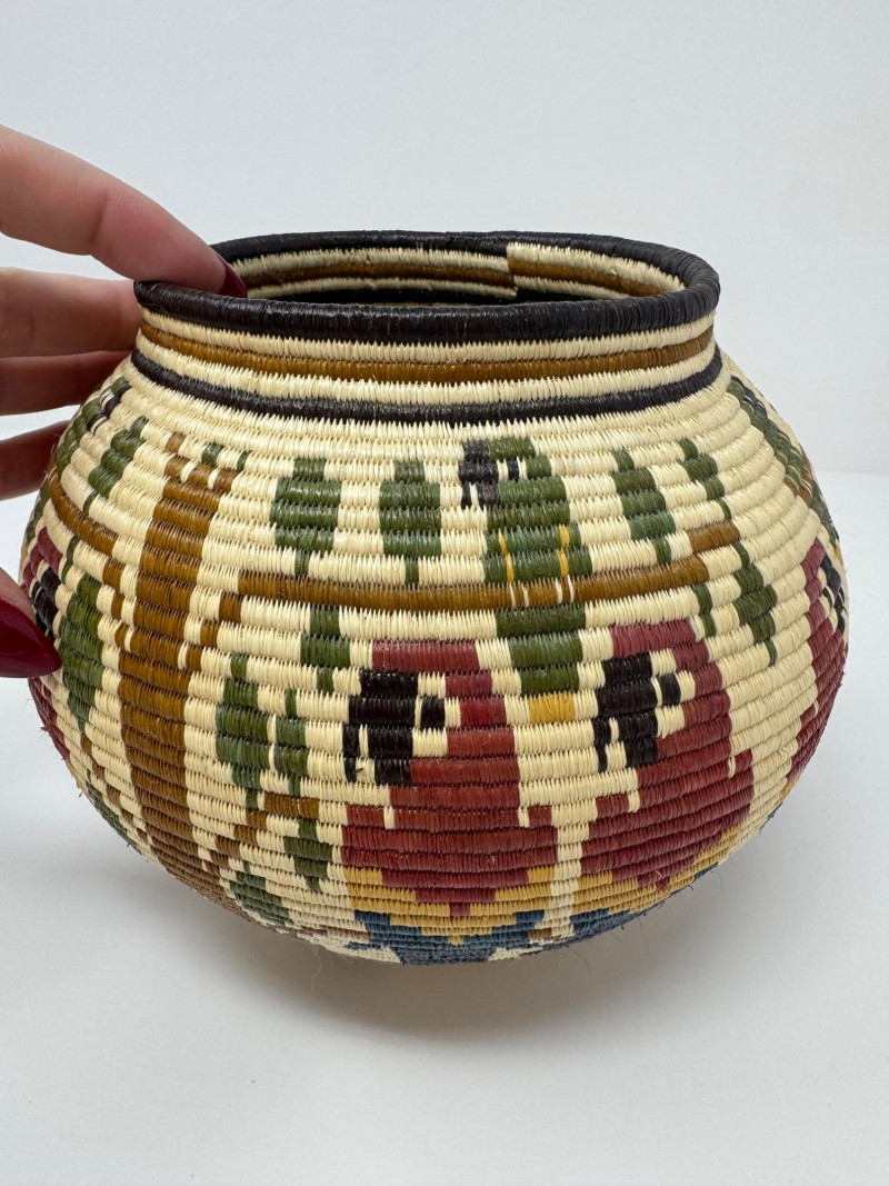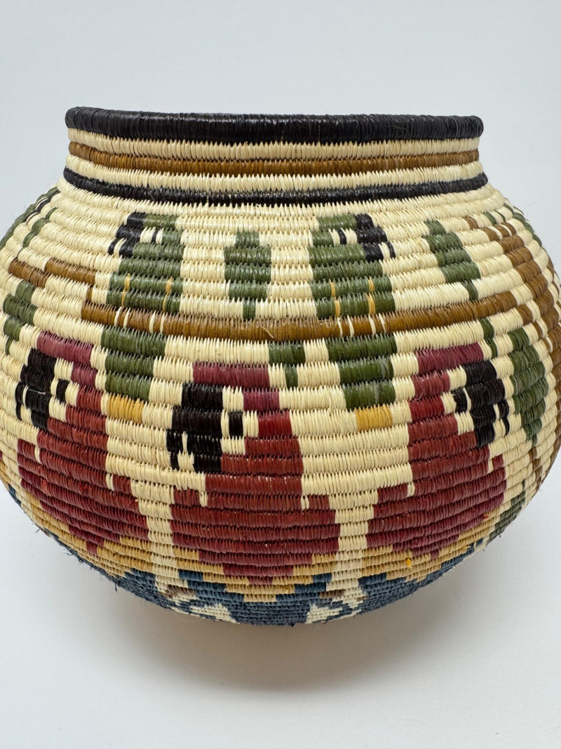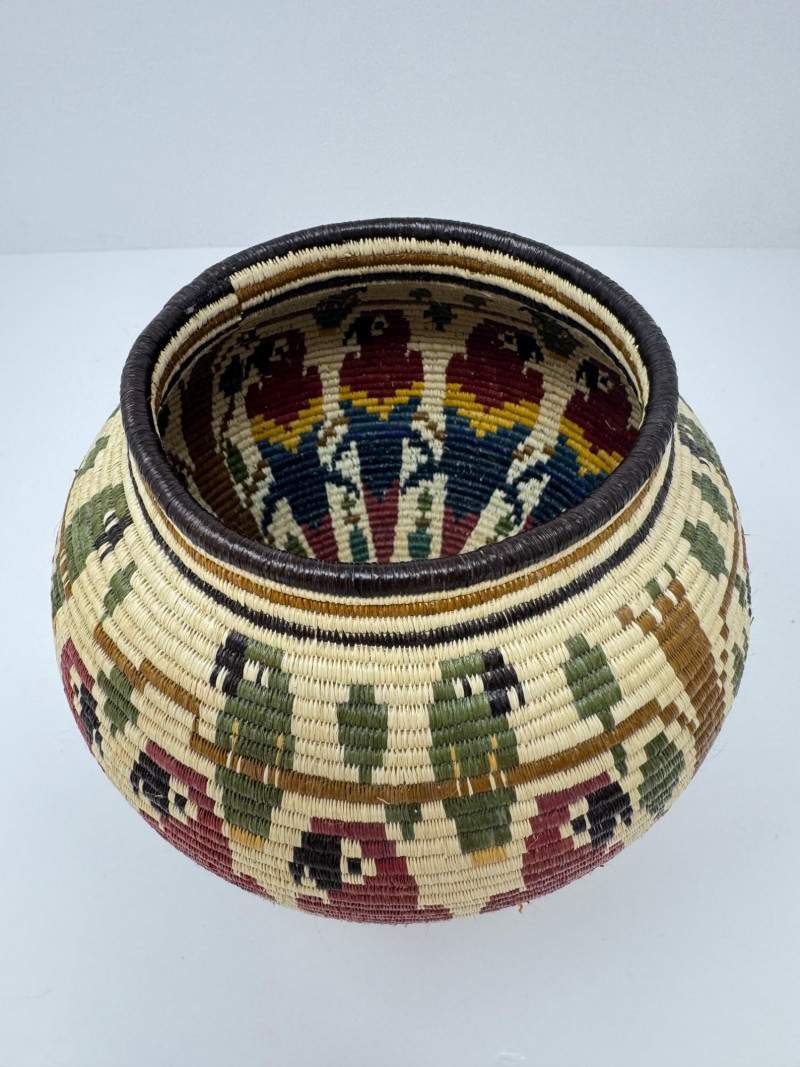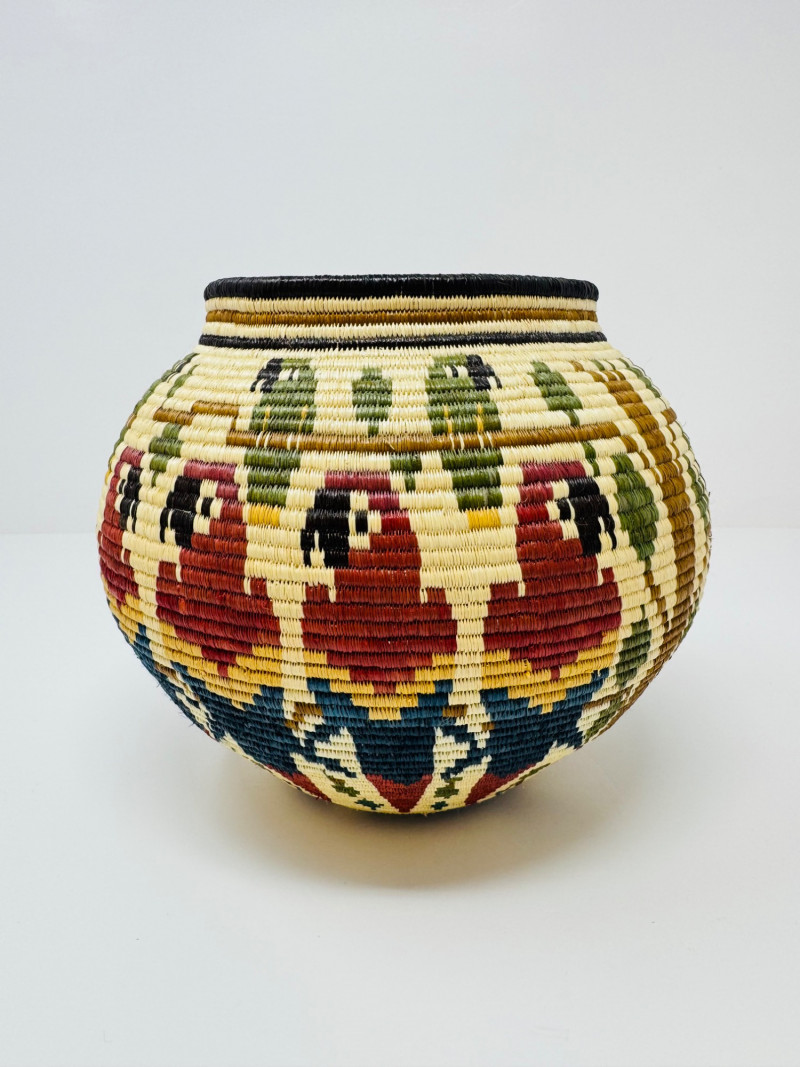 Wounaan Panama Basket by Cristina Negria – Parrot & Palm Motif. 6” Tall 6” Wide