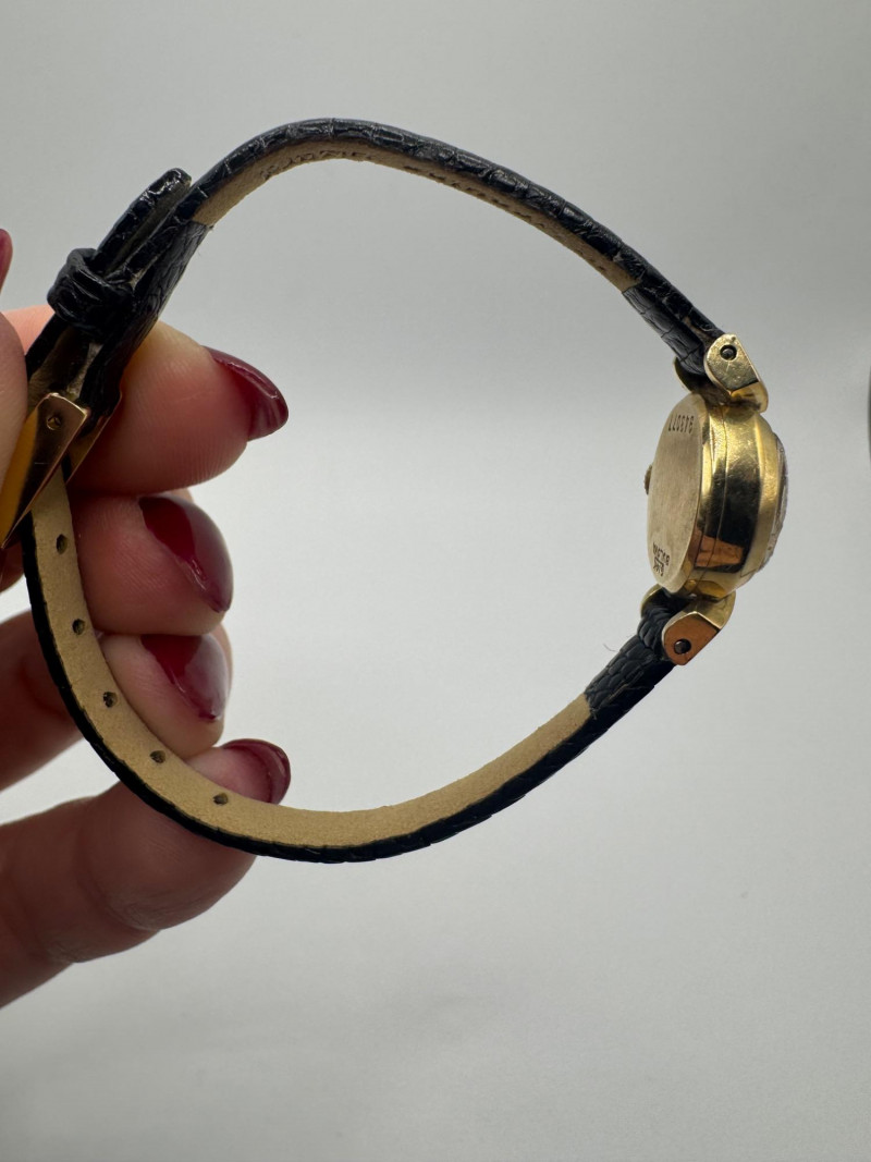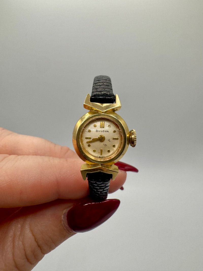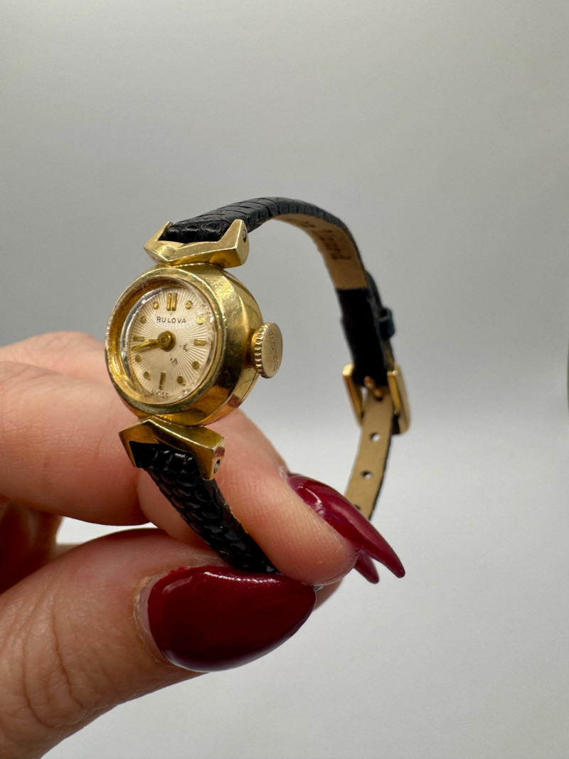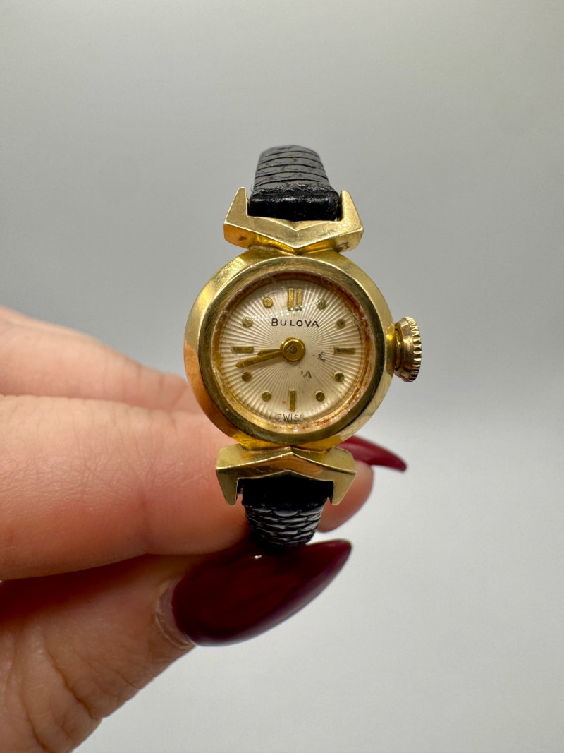 Petite Vintage 14K Gold Bulova Women’s Watch w/ Lizard Band. Important Disclaimer: Jewelry in this lot has not been tested. By bidding, you agree to purchase as is, with no guarantees on metal purity, gemstone authenticity, or content. No refunds issued on these factors.