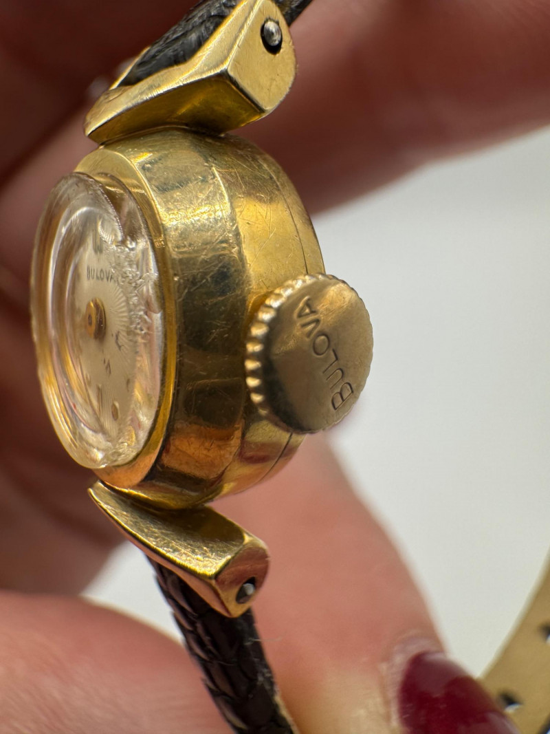 Lot # 61 - Petite Vintage 14K Gold Bulova Women’s Watch w/ Lizard Band