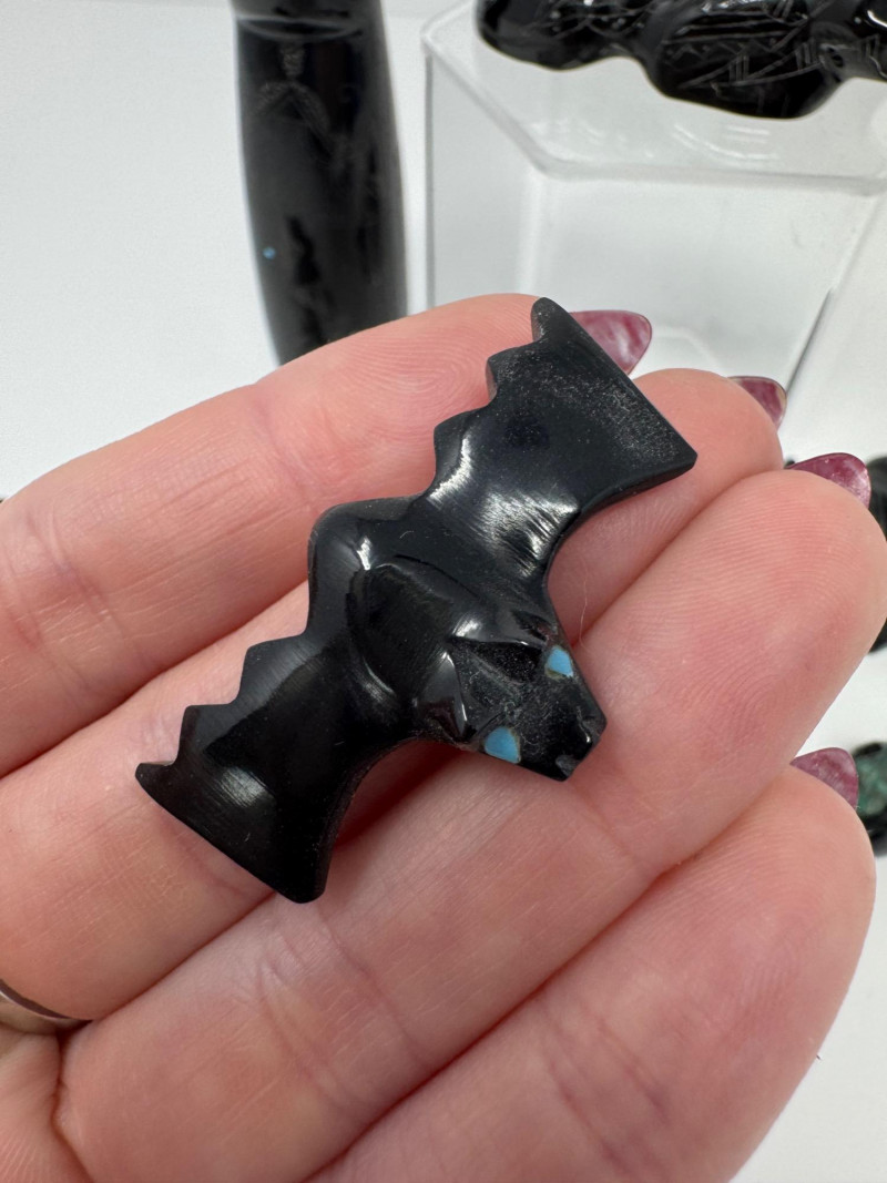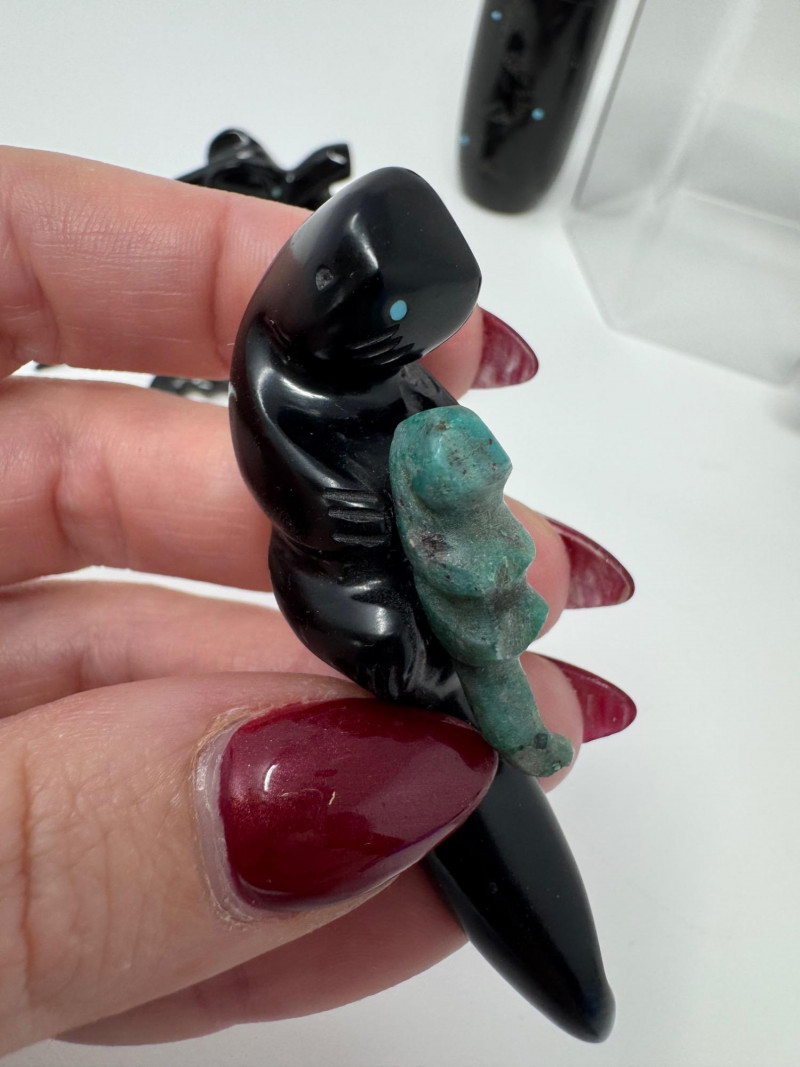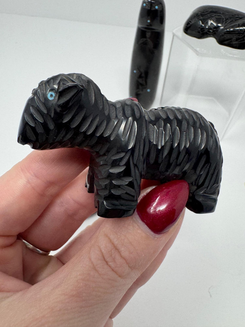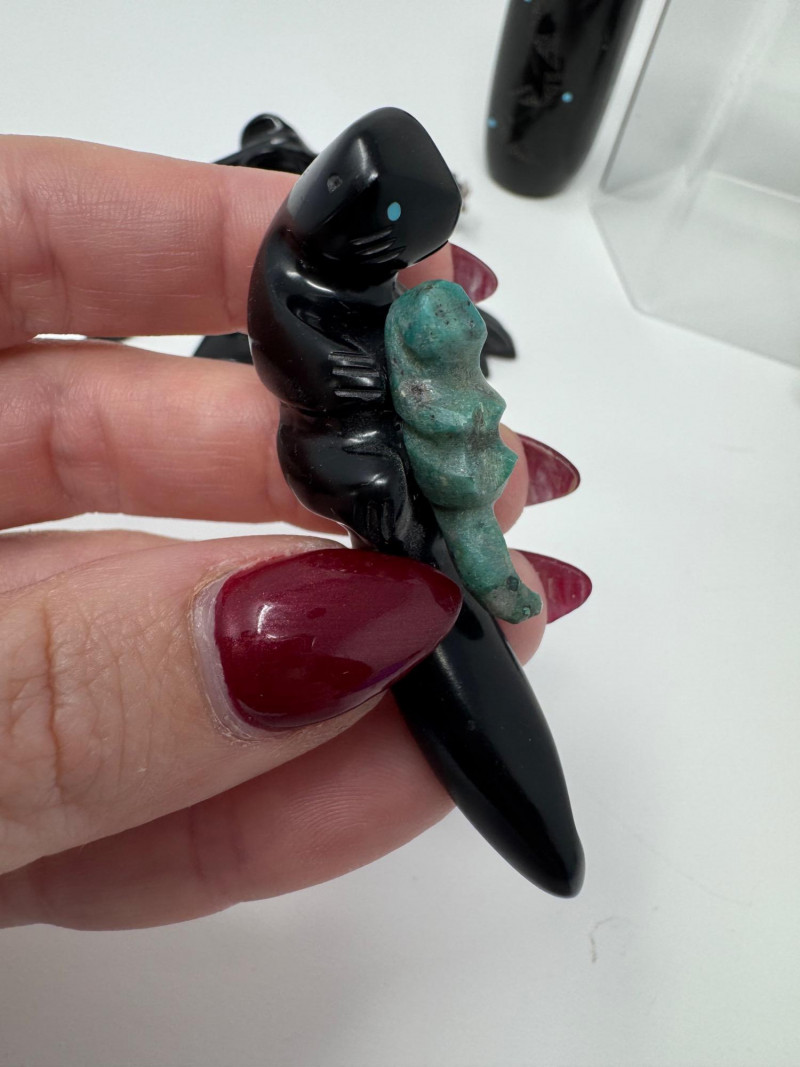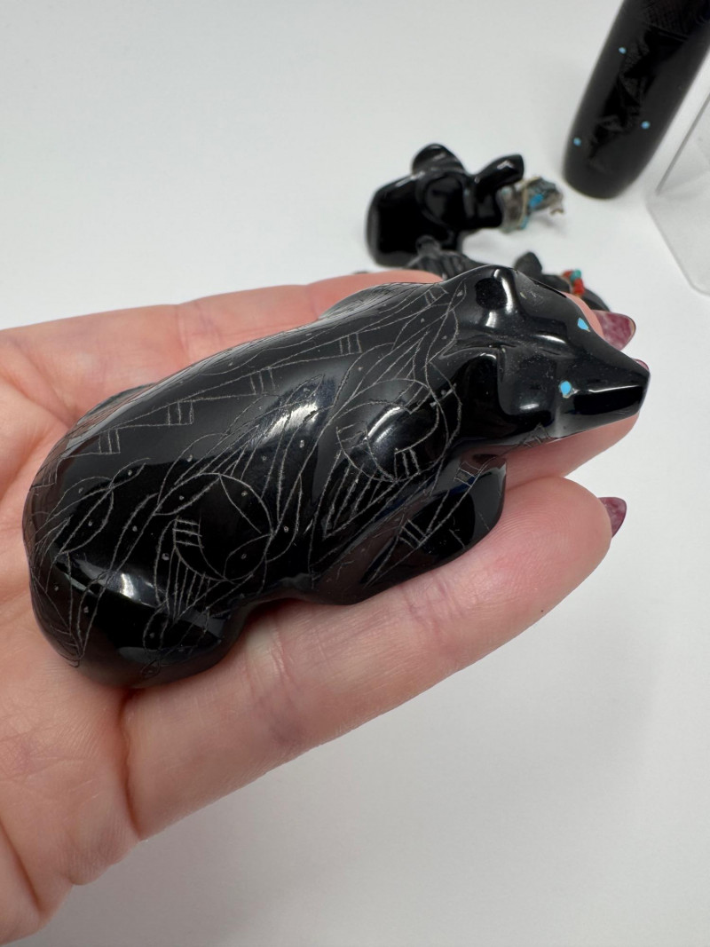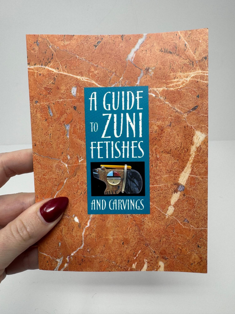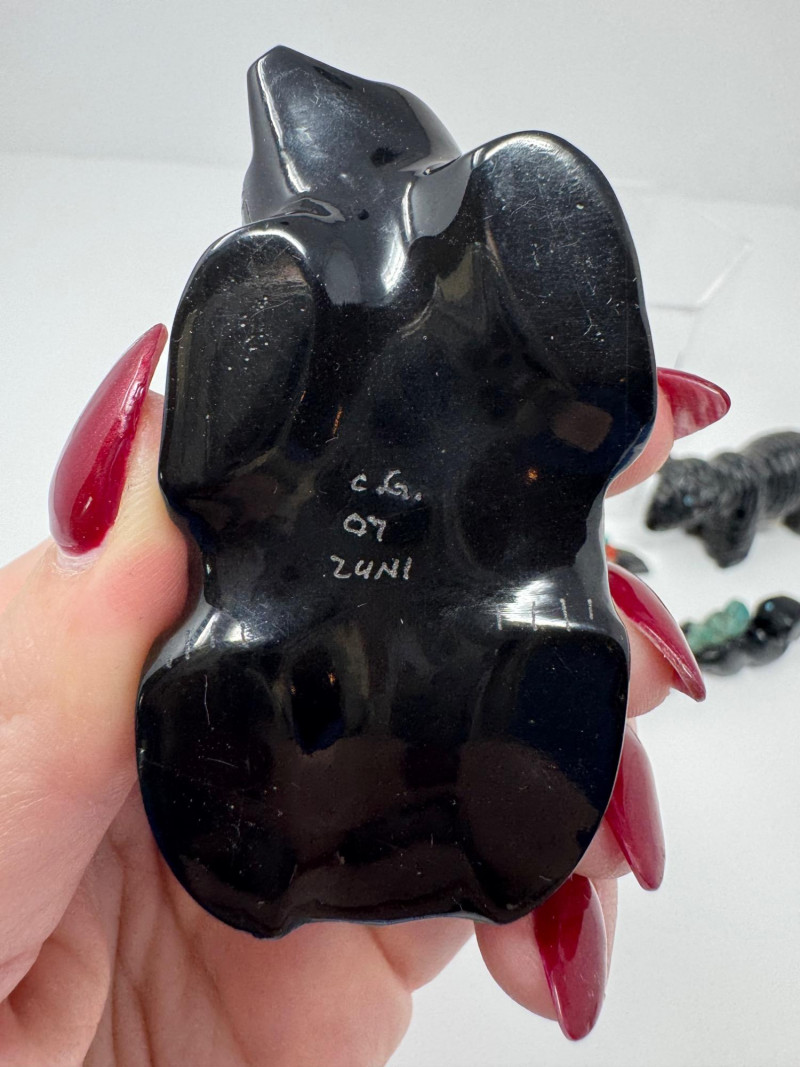 Set of 9 Carved Zuni Stone Fetishes – Signed Artists. Includes animals such as bear, wolf, snake, bat, otter, and more (see photos) Sizes range approx. 1.5” to 4” long Comes with A Guide to Zuni Fetishes and Carvings reference booklet